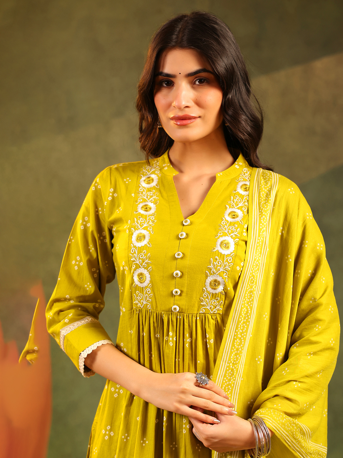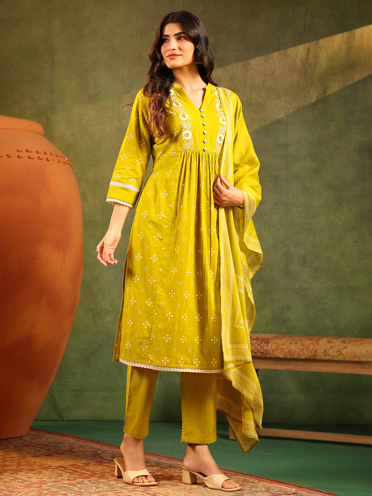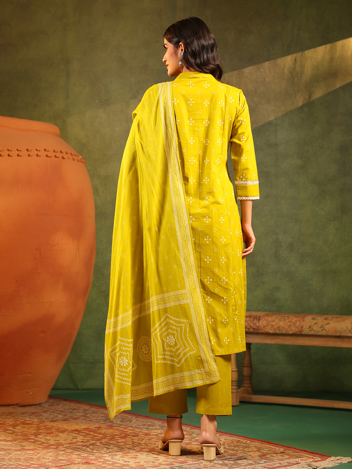 Enhancing your festive glow, this mehendi yellow cotton silk kurti set exudes fresh elegance and charm. Crafted with a stand neckline and quarter sleeves, featuring printed patterns along with mirror and embroidery work. Perfect for festive occasions, it is paired with a pant and a printed dupatta for a refined and stylish ensemble.