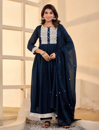Charming in mint blue, this cotton silk kurti set features a round neckline, quarter sleeves, and aabla embellishment on the yoke. Paired with straight pants and a matching dupatta, it radiates festive joy and finesse.