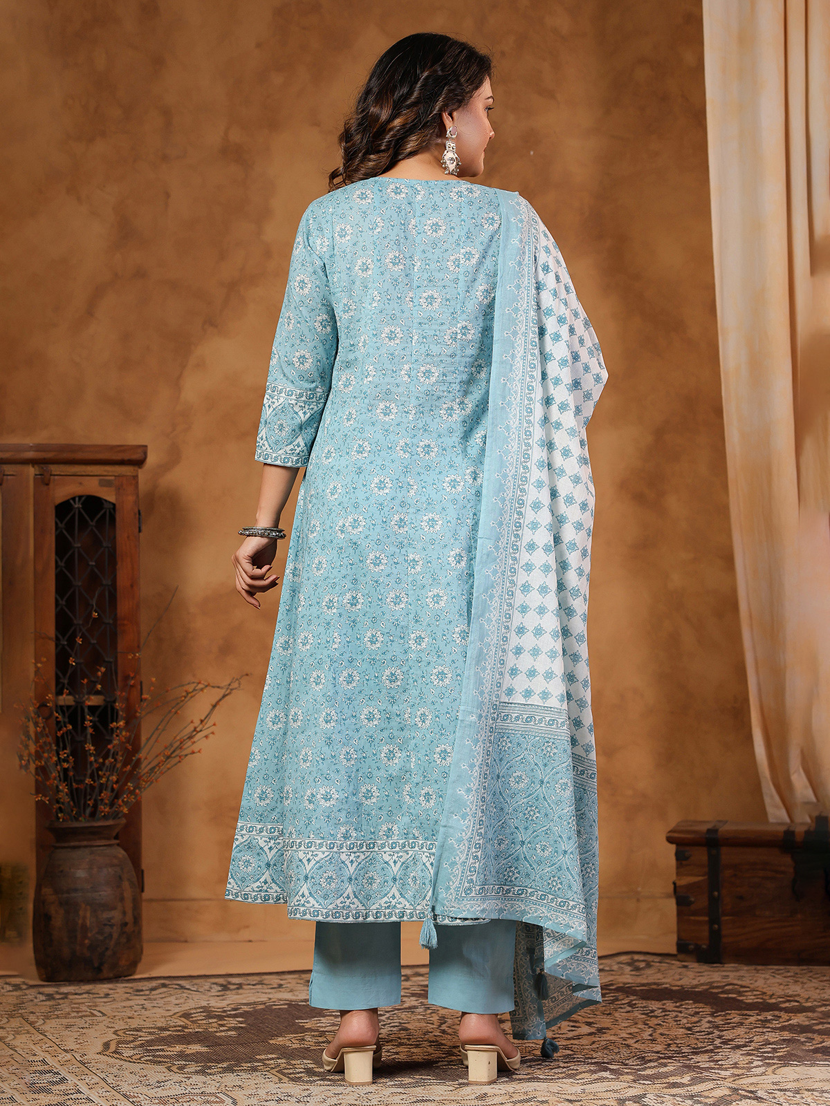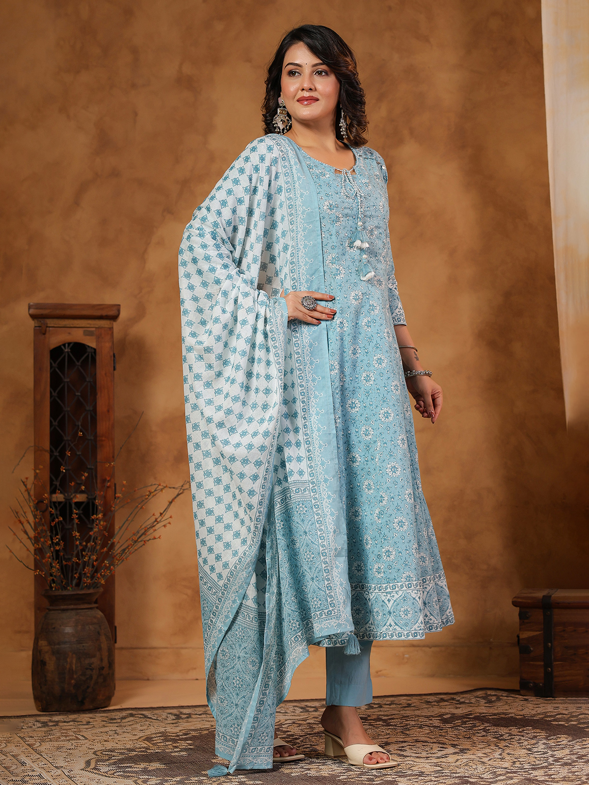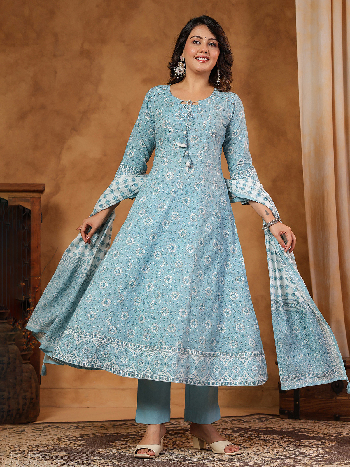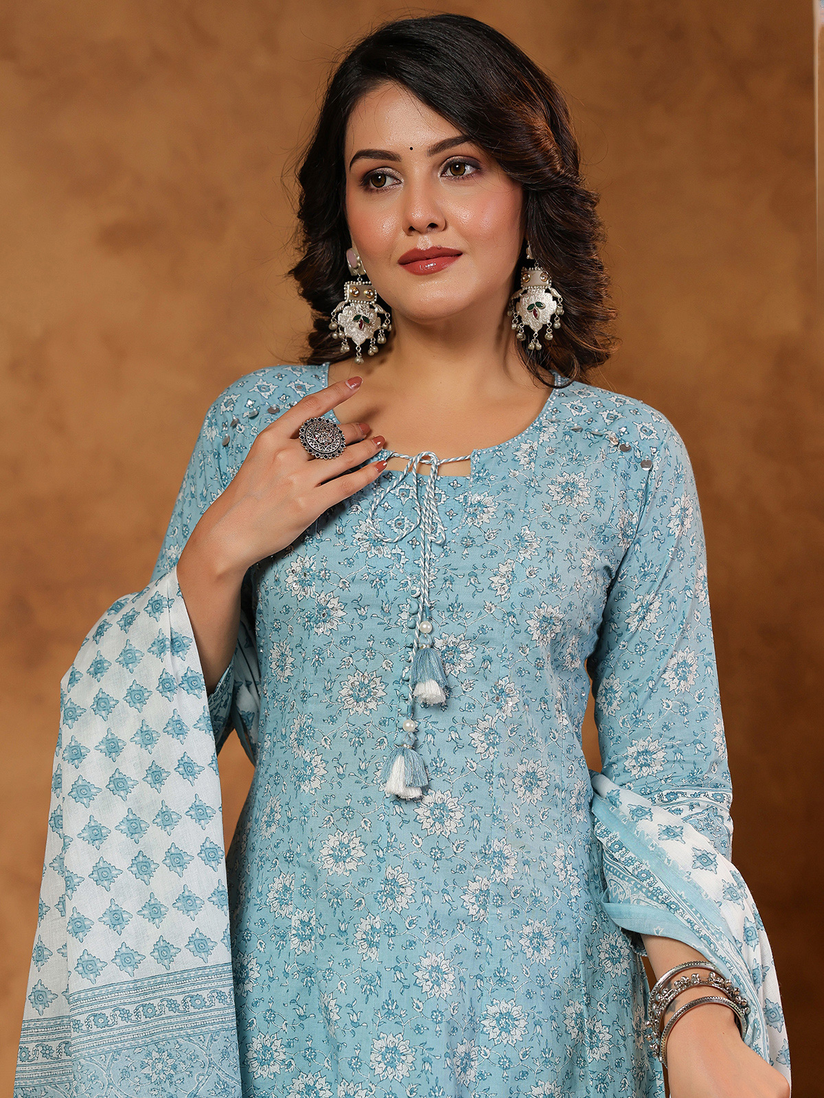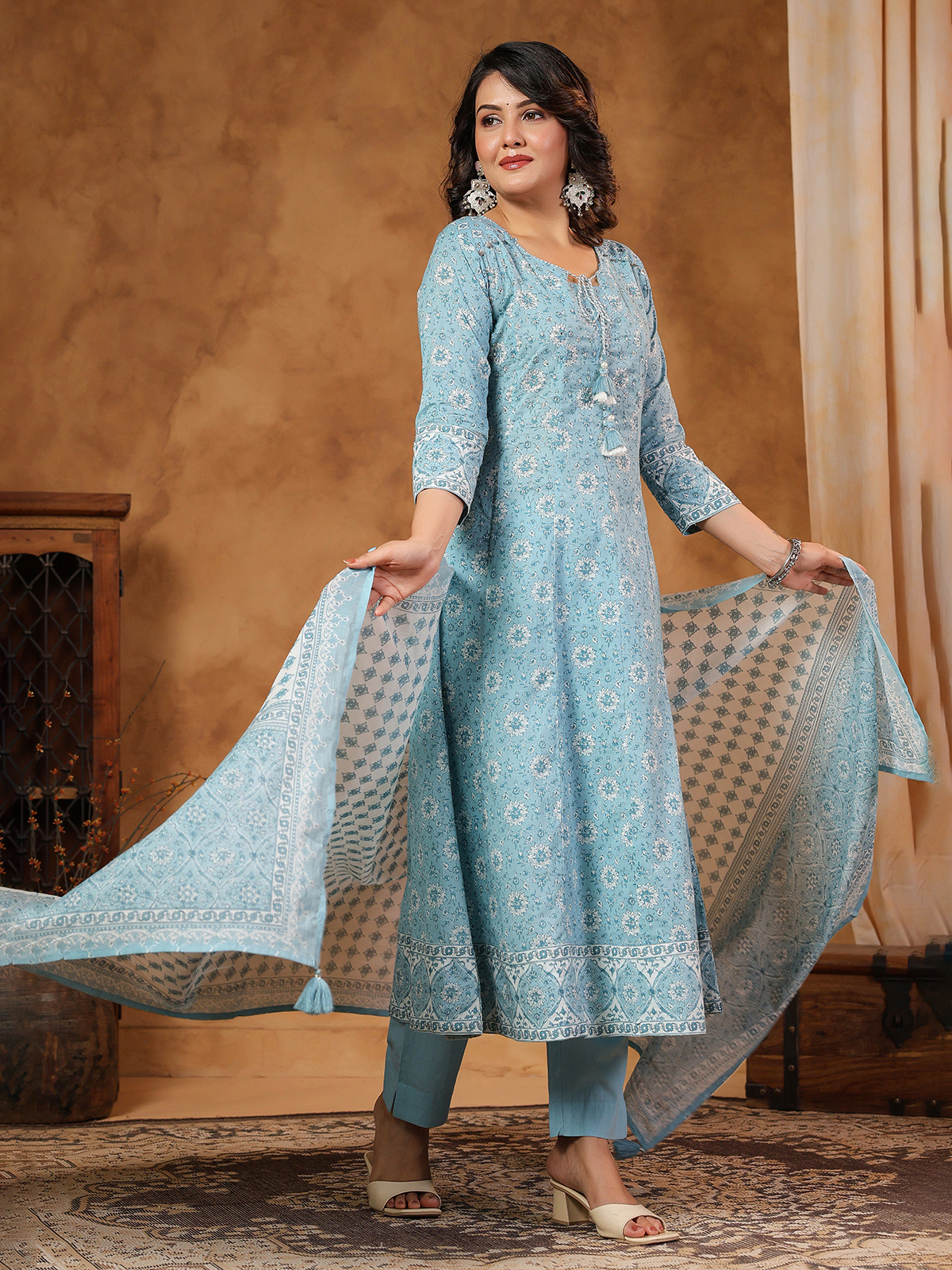 Celebrate in style with this mint blue printed cotton silk kurti set, adorned with cutdana and sequin detailing. A keyhole neckline and quarter sleeves enhance its charm, while the coordinated pant and dupatta complete the perfect festive ensemble.