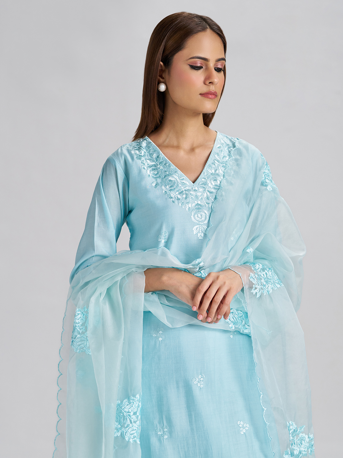 This mint blue silk kurti set showcases clean embroidery on a straight-cut silhouette for a refined finish. Styled with a V neckline and quarter sleeves, it comes with a matching pant and dupatta, offering graceful comfort for festive gatherings and everyday ethnic wear.