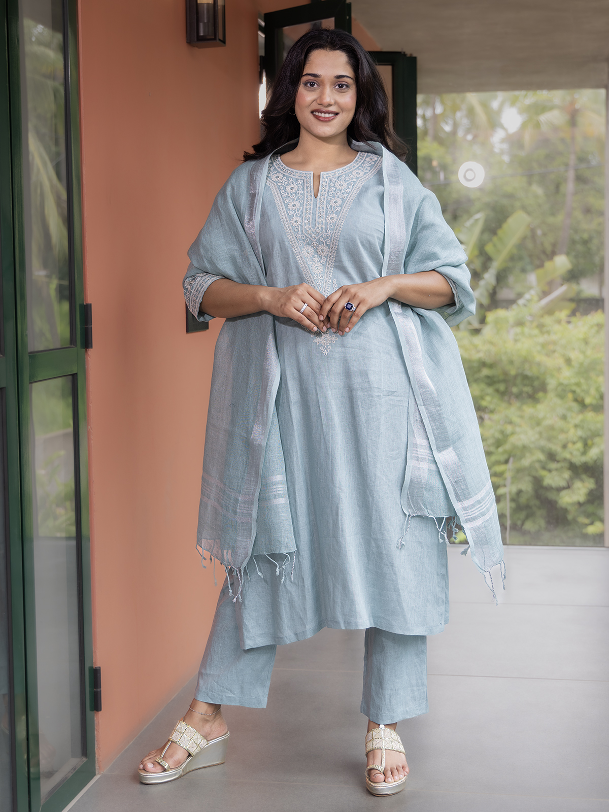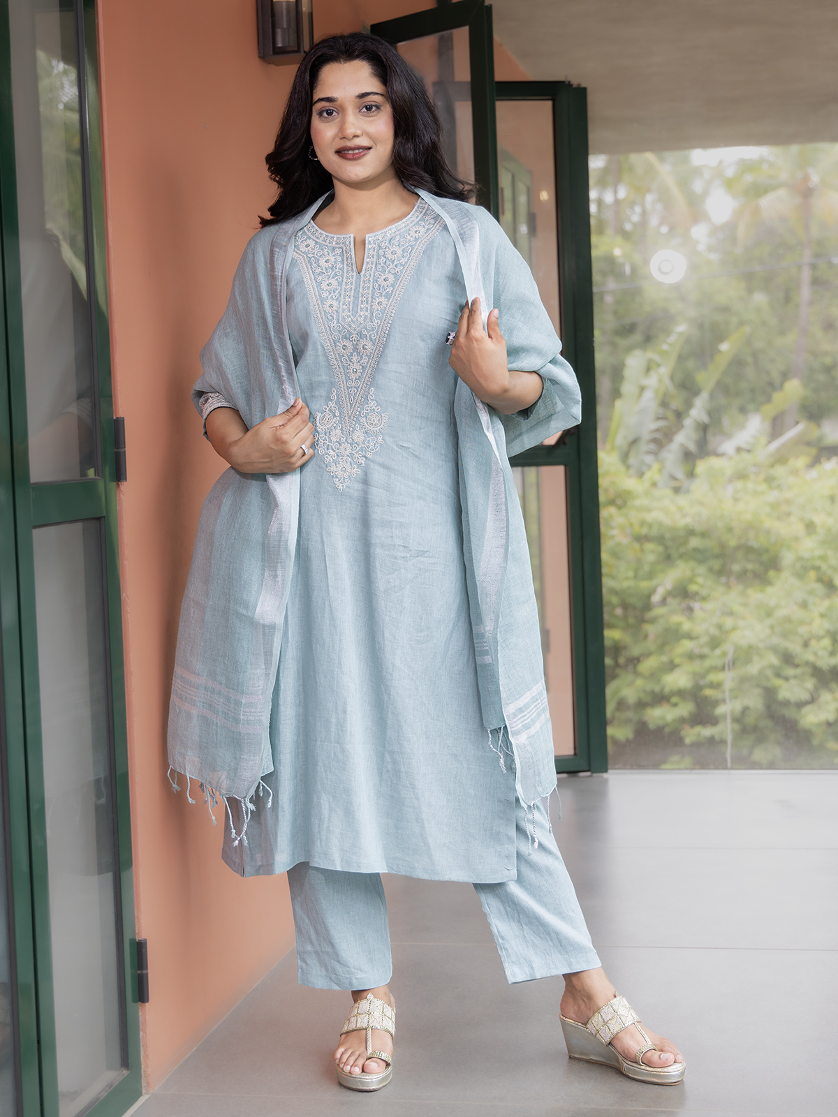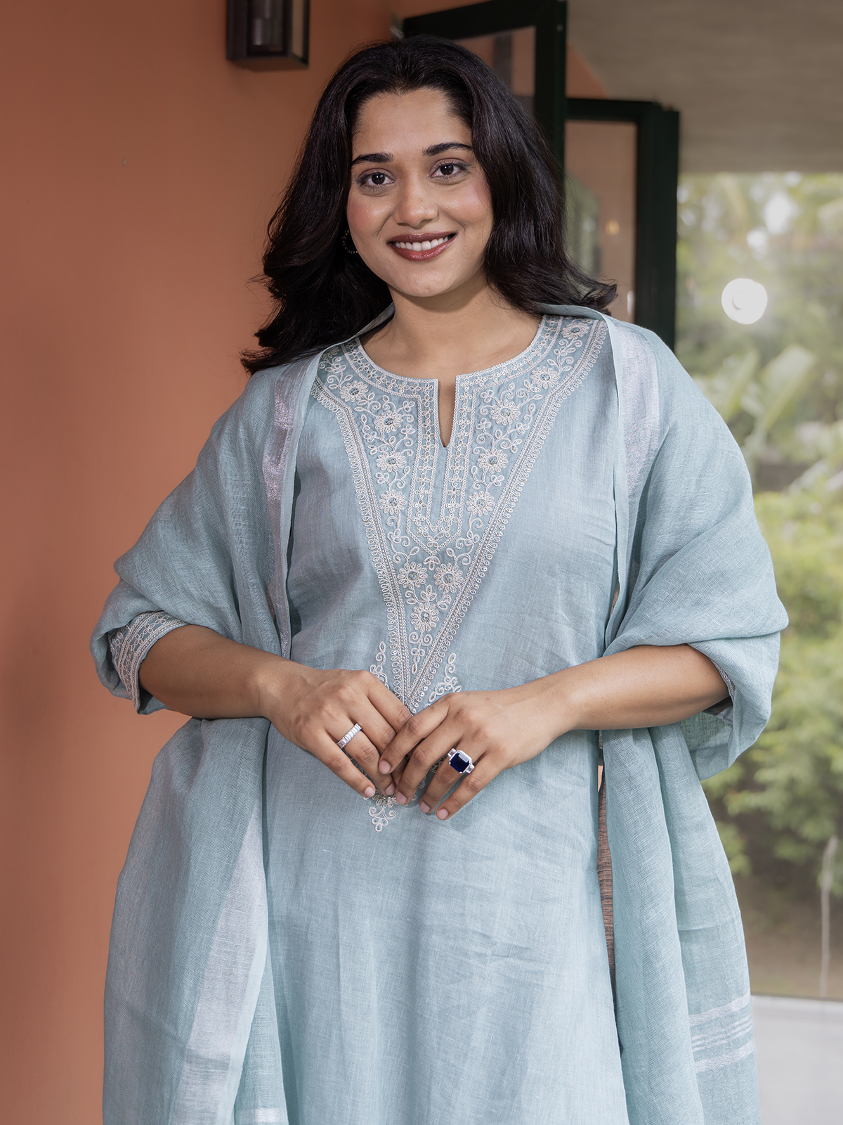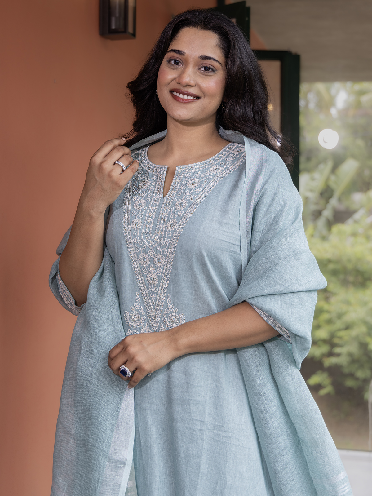 Mint blue linen meets ornamental detailing in this kurti set, featuring a beautiful fusion of resham ans sequins work. The structured V neckline and quarter sleeves offer understated elegance. Finished with a complementing pant, it is a stylish yet breathable choice for festive wear.