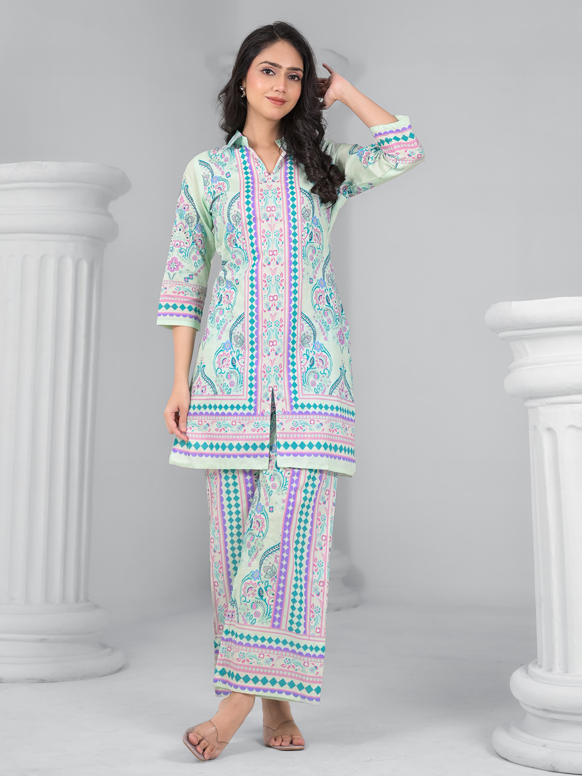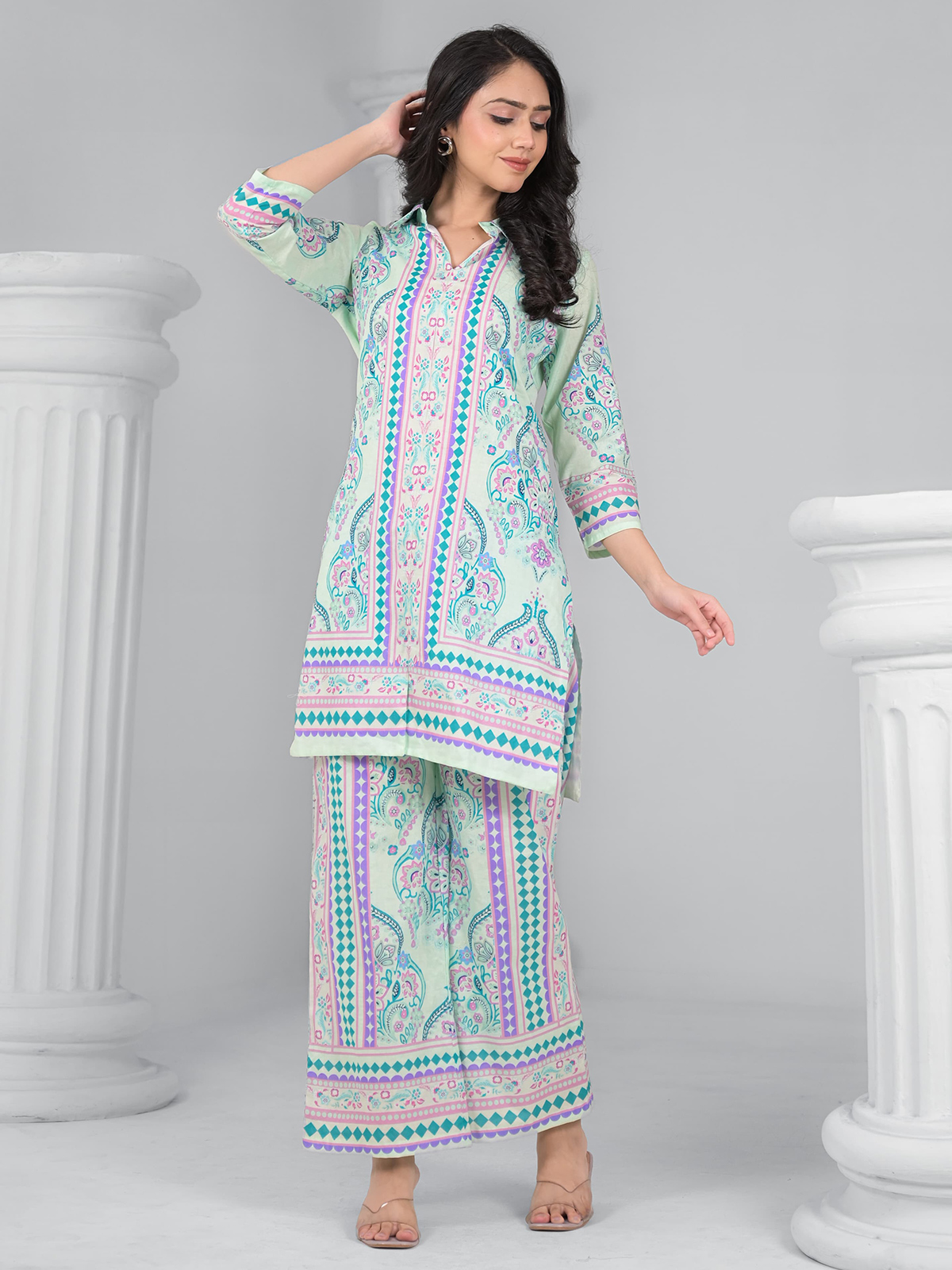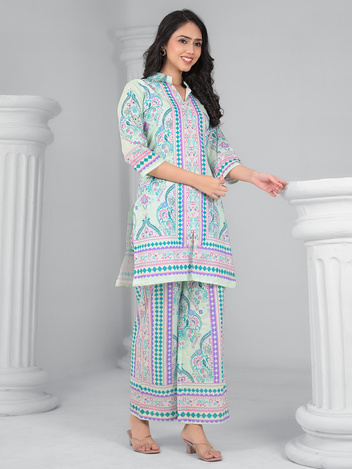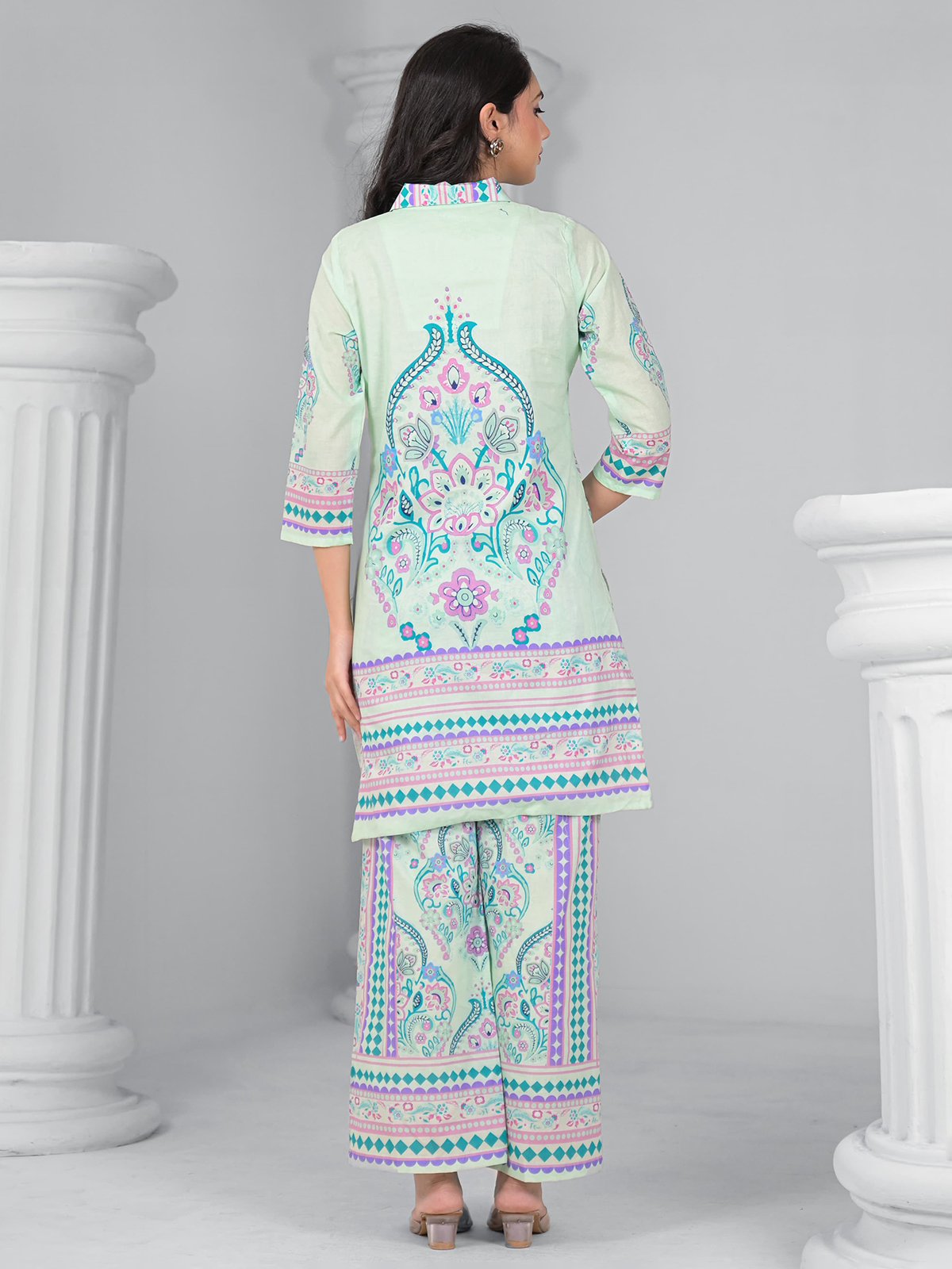 Radiating festive charm, this mint green cotton silk palazzo kurti set showcases an intricate printed pattern. It is thoughtfully designed with a collar neck and quarter sleeves for a refined and elegant finish.