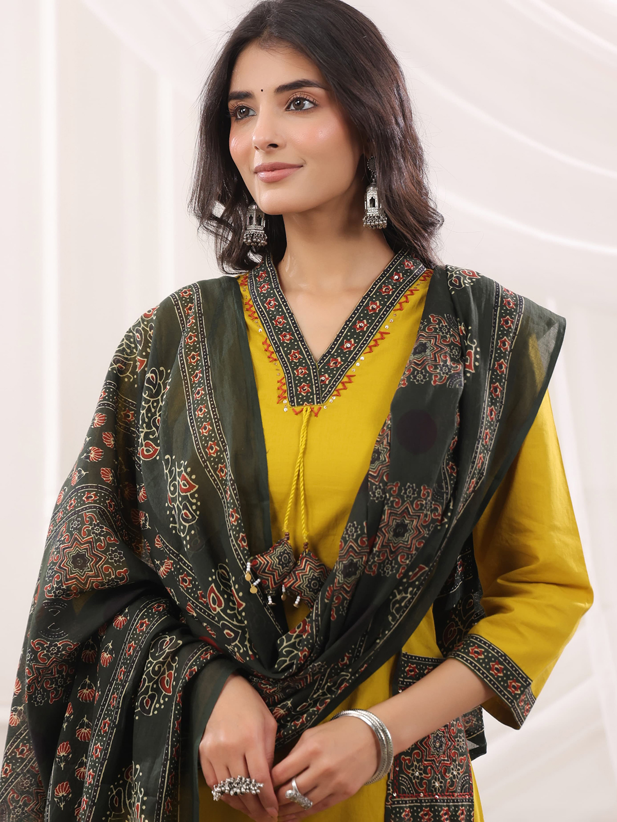 Crafted for joyful celebrations, this mustard cotton silk Anarkali kurti set features hand block printed Ajrakh patterns enhanced with sequins, thread, and bead work. Styled with a flattering V-neckline, quarter sleeves, and a functional pocket, it is paired with a palazzo and dupatta, ideal for haldi rituals, Eid, and festive occasions.