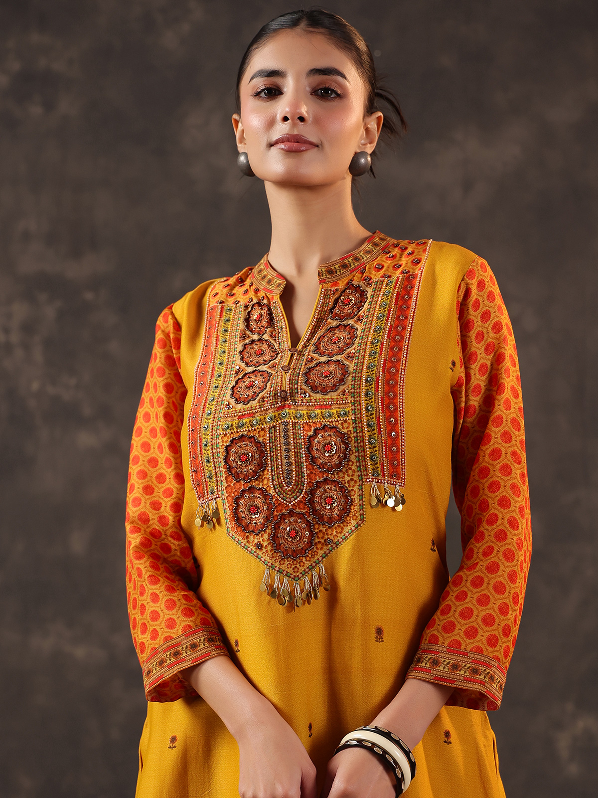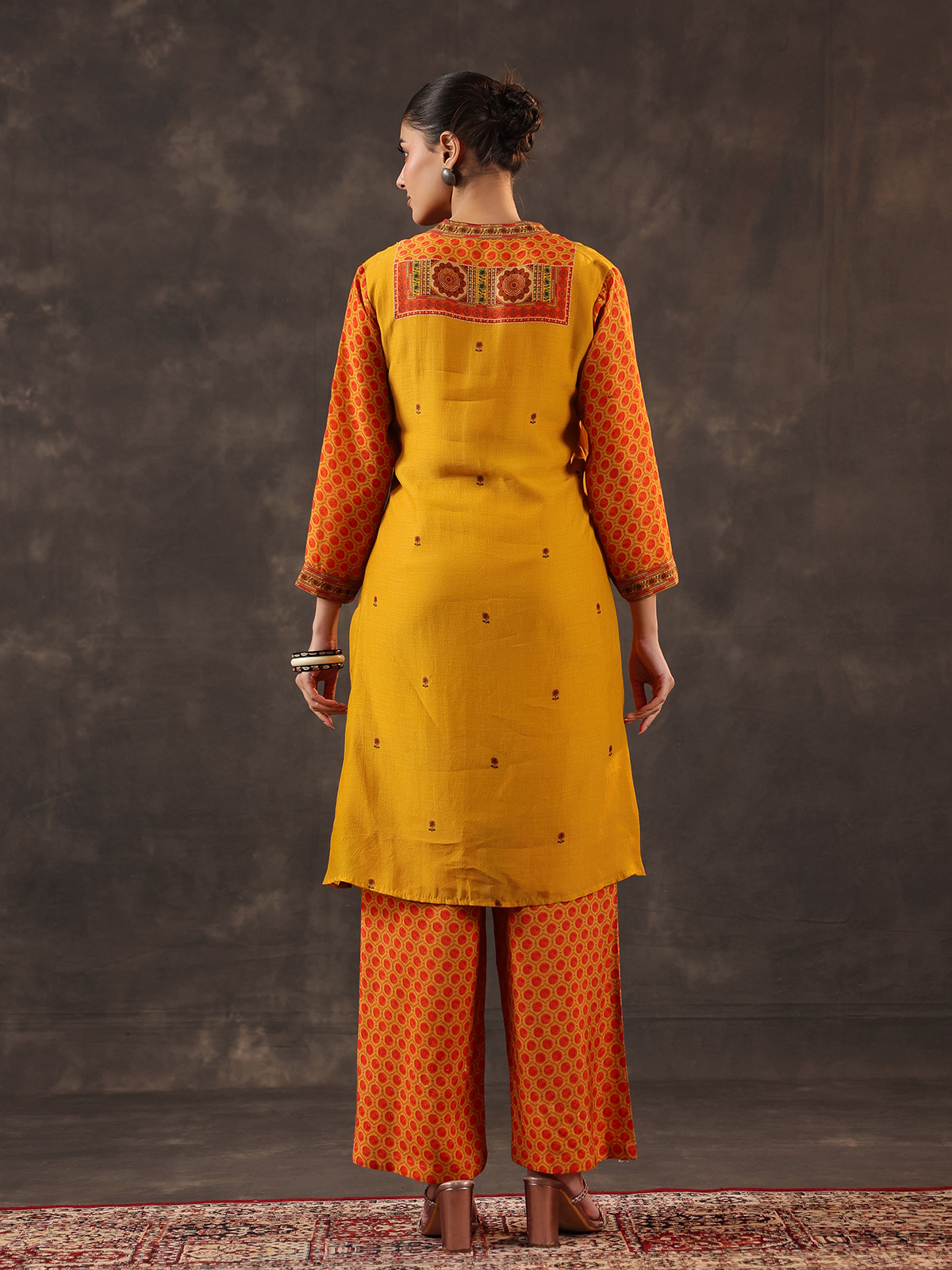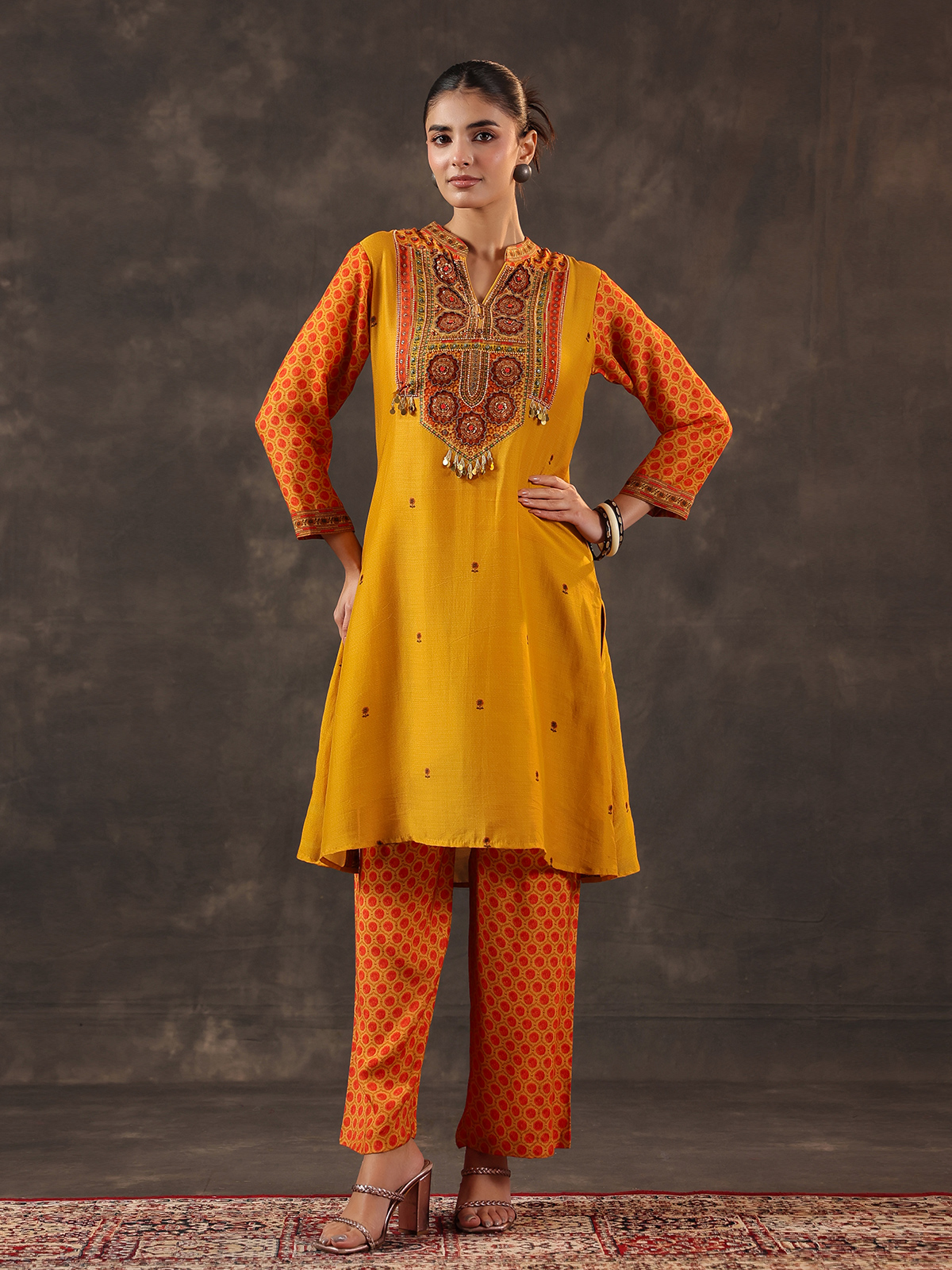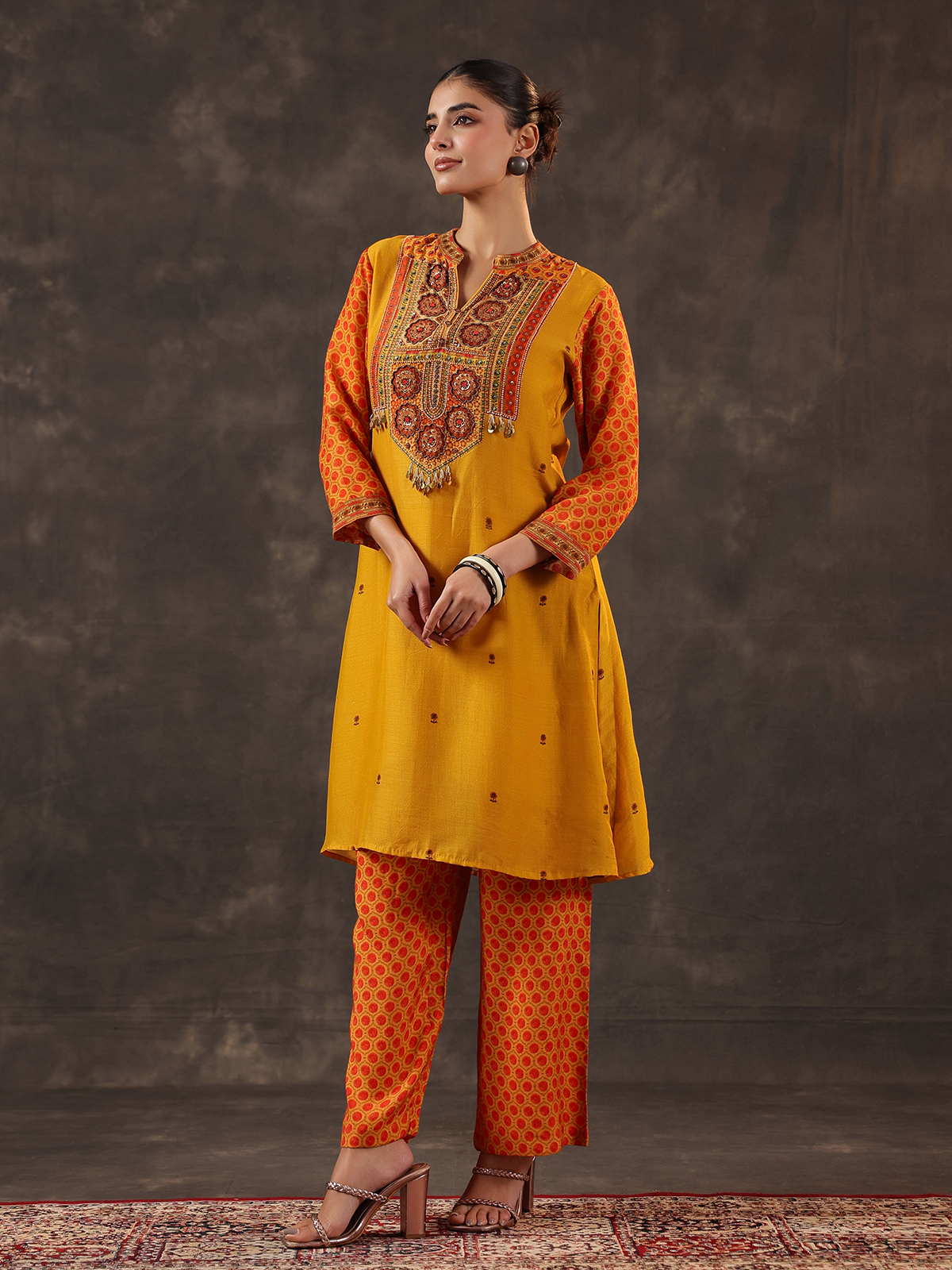 Radiating subtle festive charm mustard yellow chanderi silk kurti set celebrates traditional elegance. The yoke style printed kurti features a graceful stand collar and quarter sleeves. Beautifully decorated with cutdana, sequins, beads and coin embellishments. Paired with pants, the ensemble creates a light and graceful silhouette perfect for casual gatherings and festive celebrations.