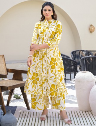 This cotton-fabric palazzo kurti set with a mustard yellow design can add some new style to your closet. This ensemble, which features a stand collar neck and quarter sleeves, is ideal for daily wear.