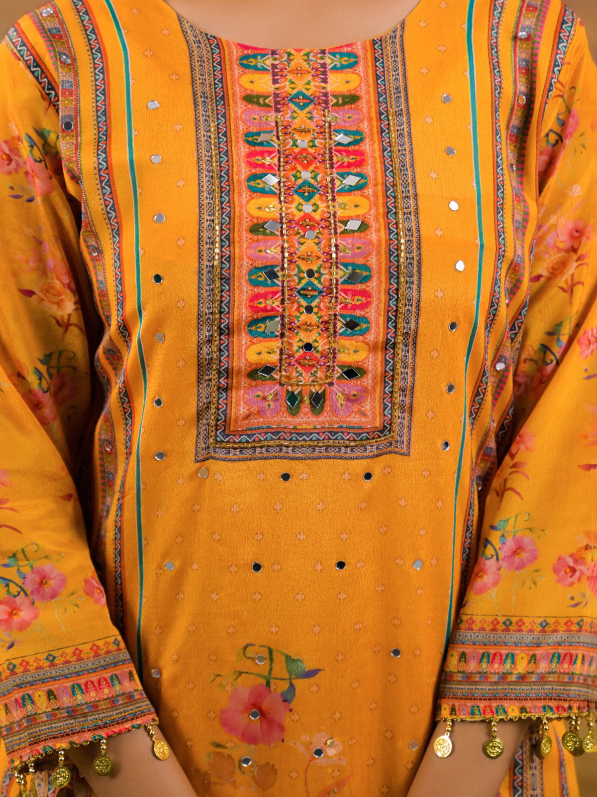 Mustard Yellow Embellished Printed Silk Kurti Set