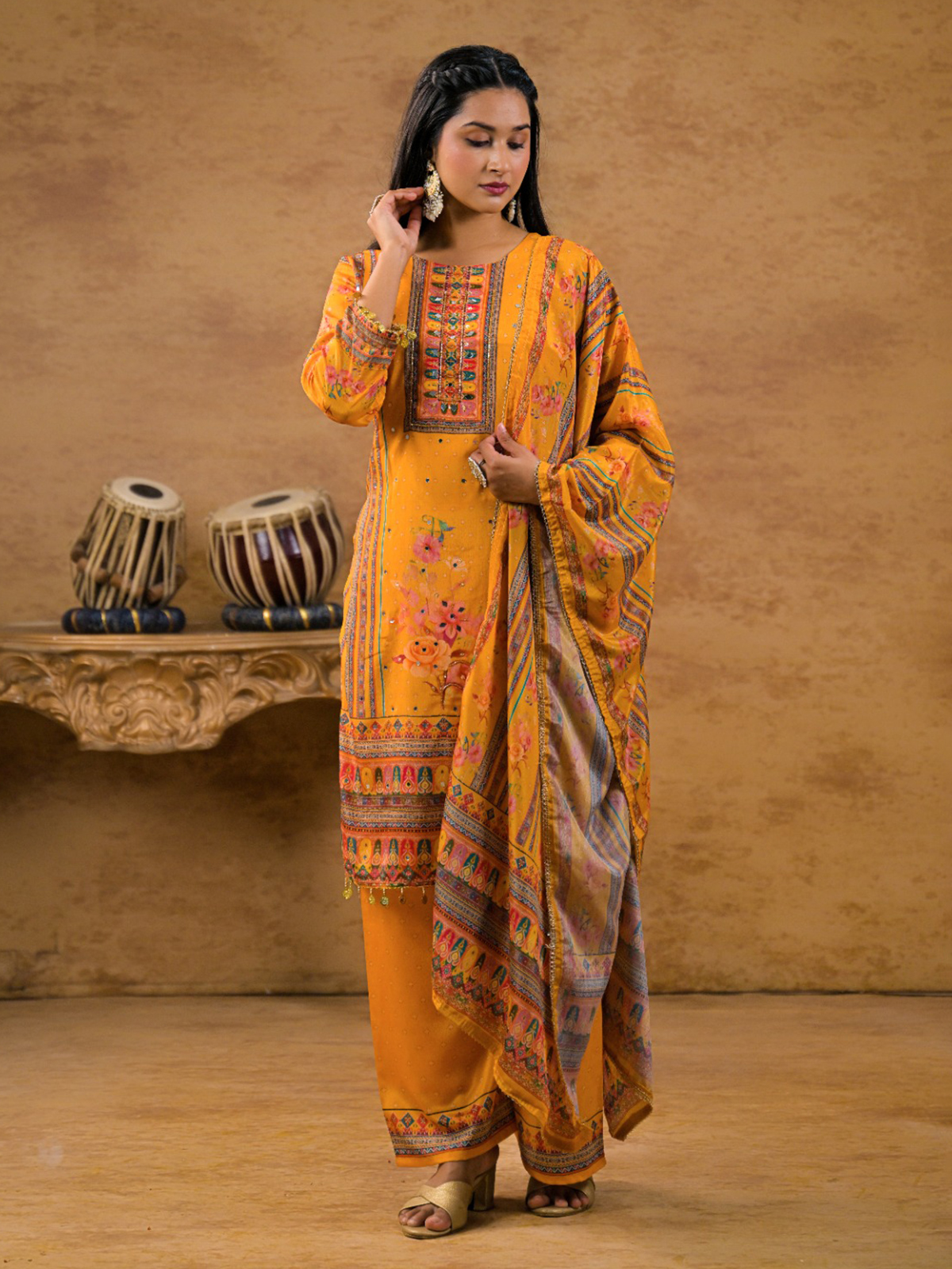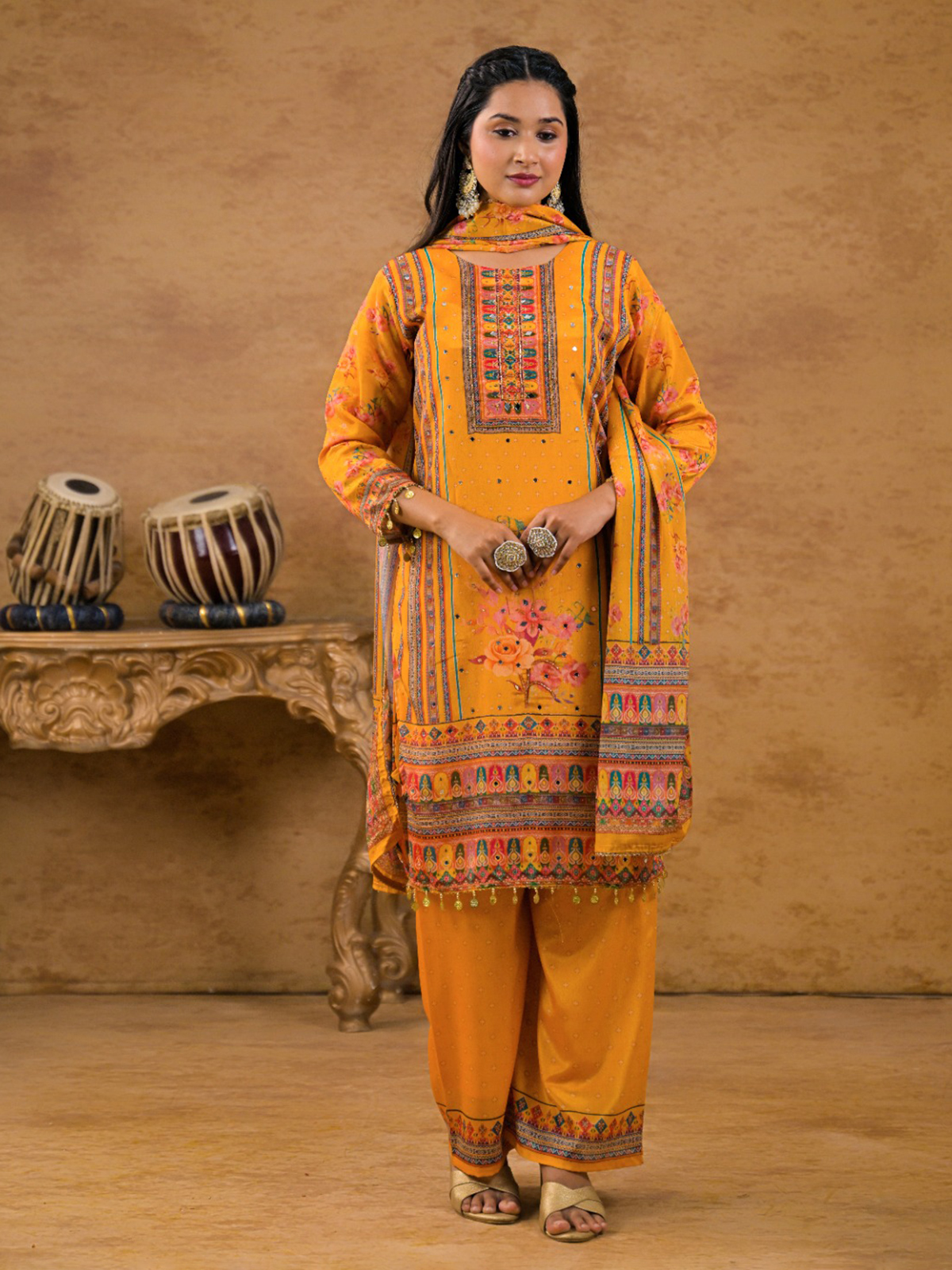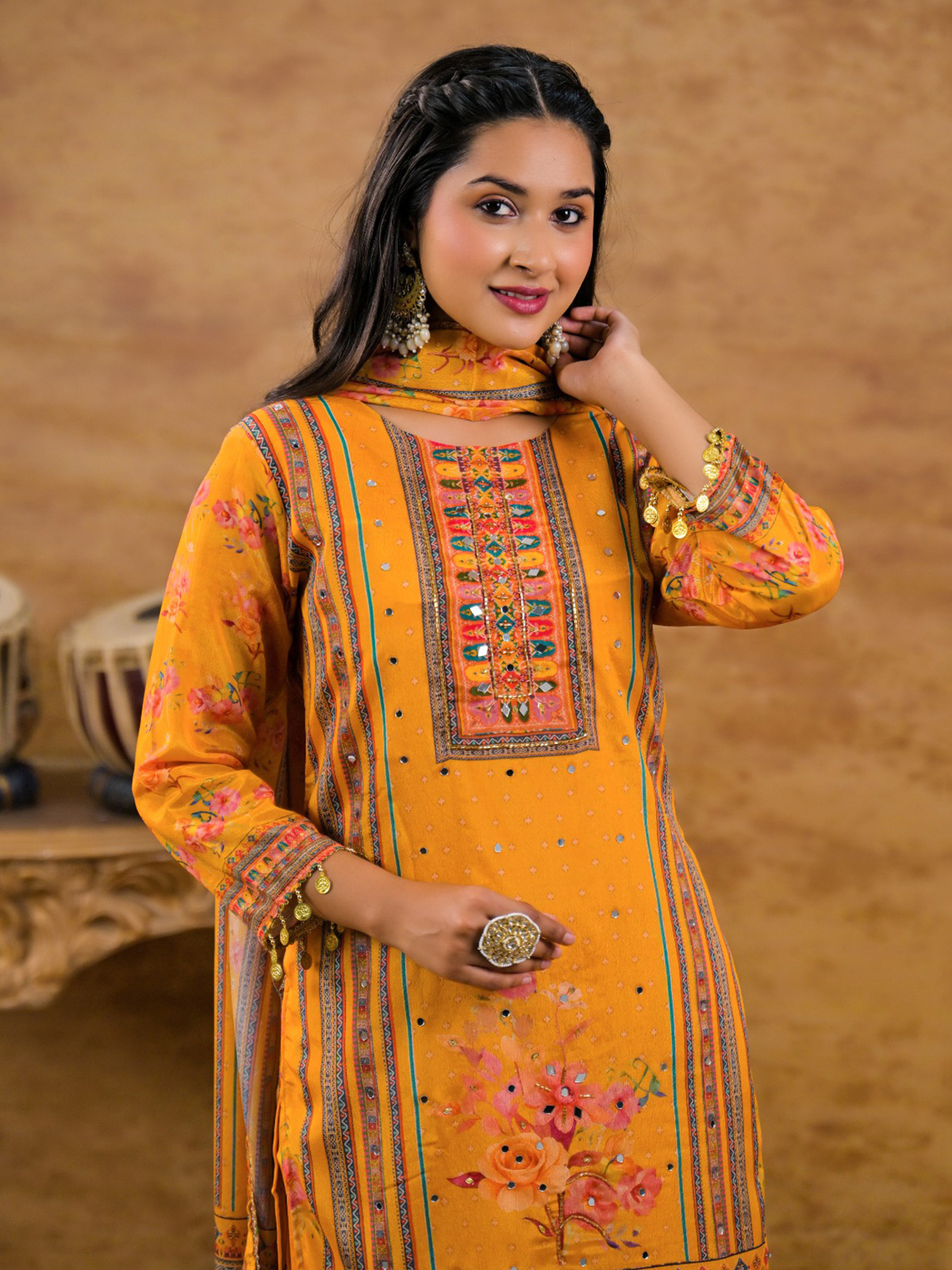 Adorned with cutdana, mirror, coin, and bead embellishments, this mustard yellow silk kurti set showcases a vibrant printed base. Featuring a round neckline and quarter sleeves, it is paired with a palazzo and dupatta, making it ideal for festive celebrations.