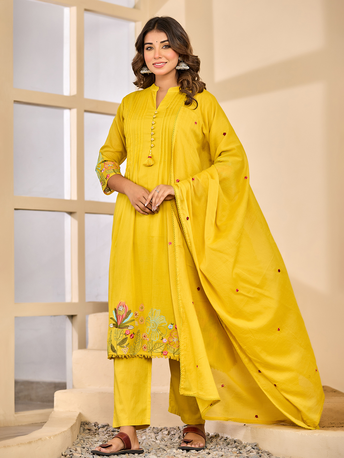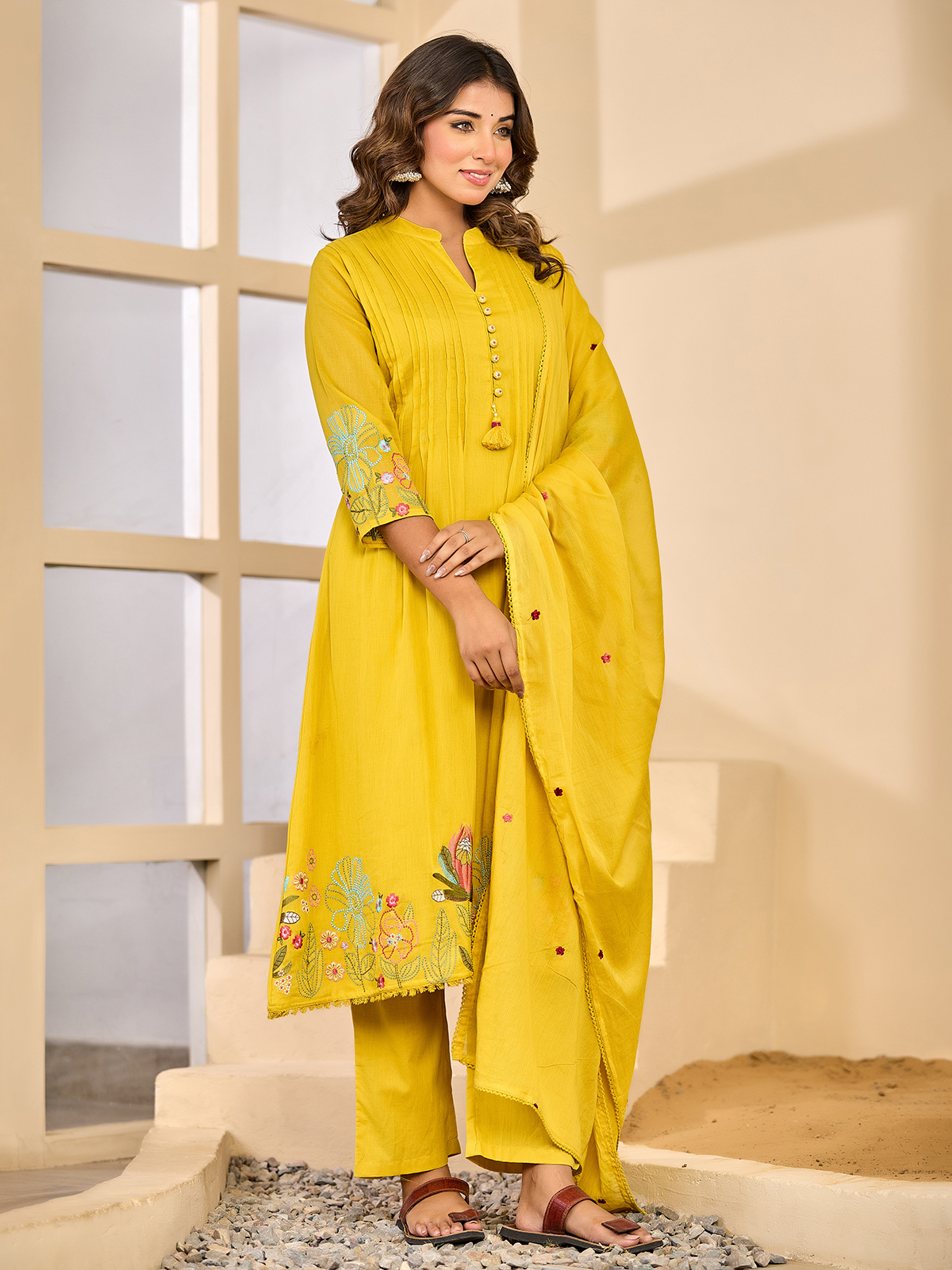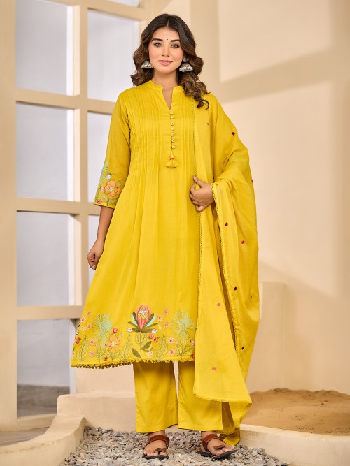 Glow with elegance in this mustard yellow silk kurti set, beautifully highlighted with intricate embroidery. Styled with a sophisticated stand collar and quarter sleeves, it is complemented with pant and dupatta. A perfect festive ensemble that combines ethnic richness with modern grace for special occasions.