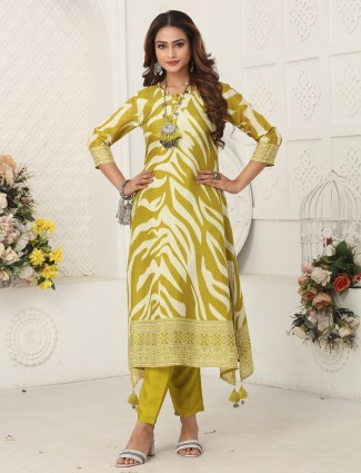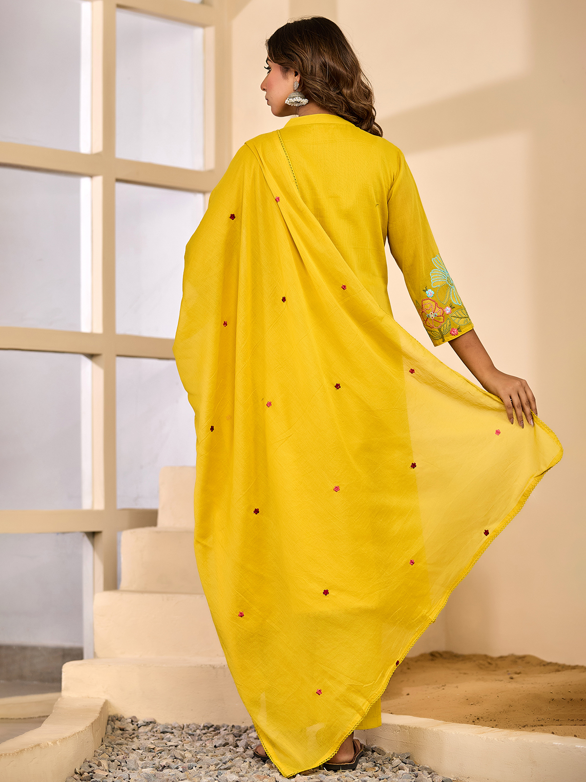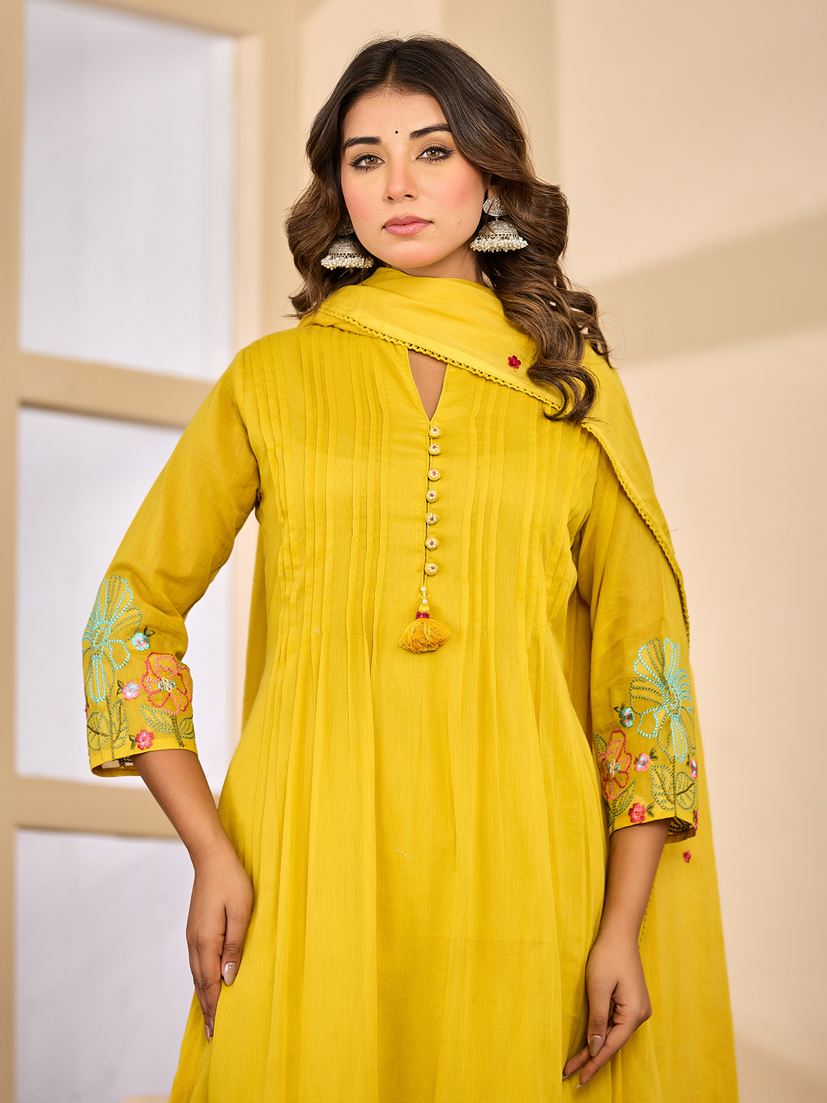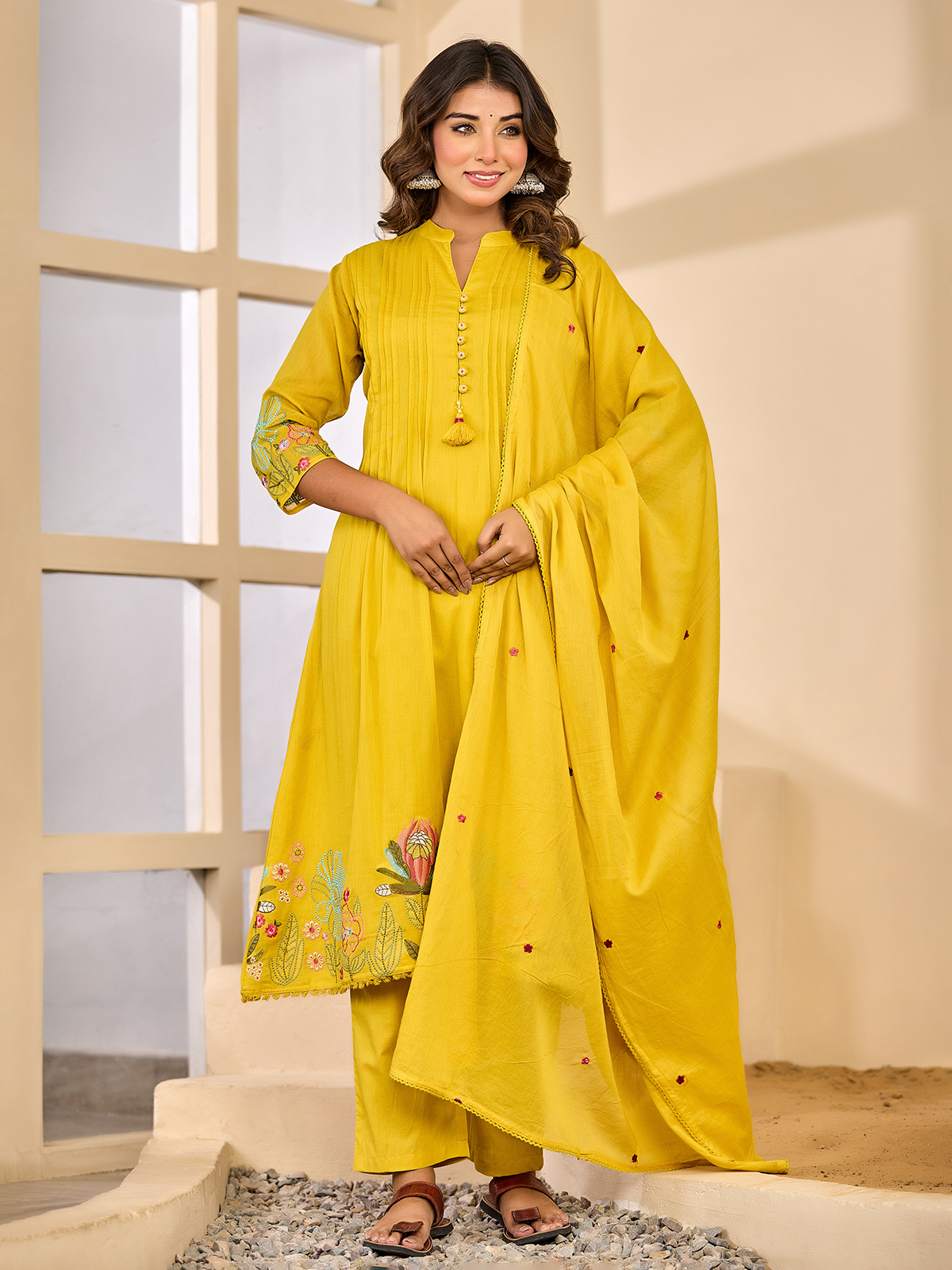 Glow with elegance in this mustard yellow silk kurti set, beautifully highlighted with intricate embroidery. Styled with a sophisticated stand collar and quarter sleeves, it is complemented with pant and dupatta. A perfect festive ensemble that combines ethnic richness with modern grace for special occasions.