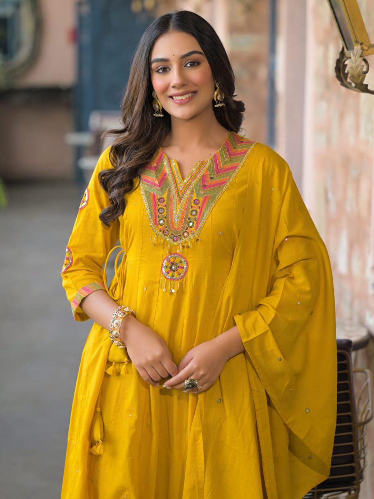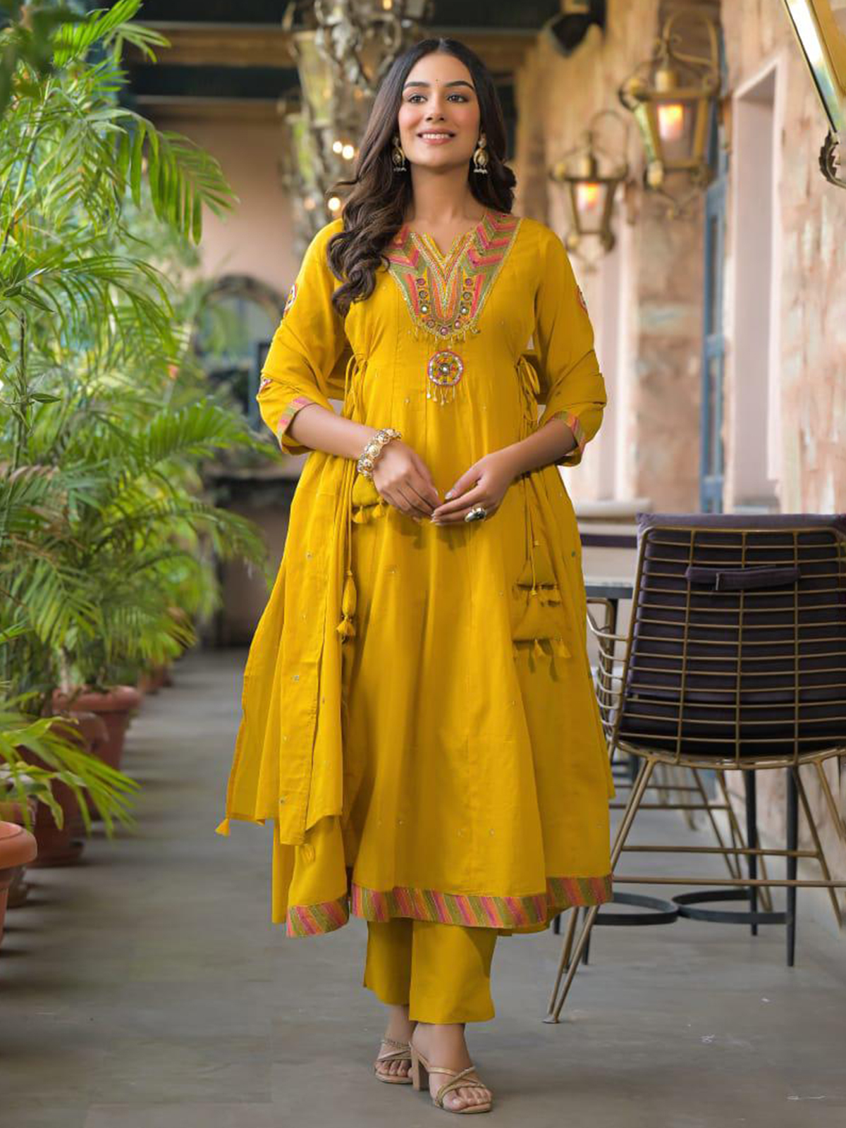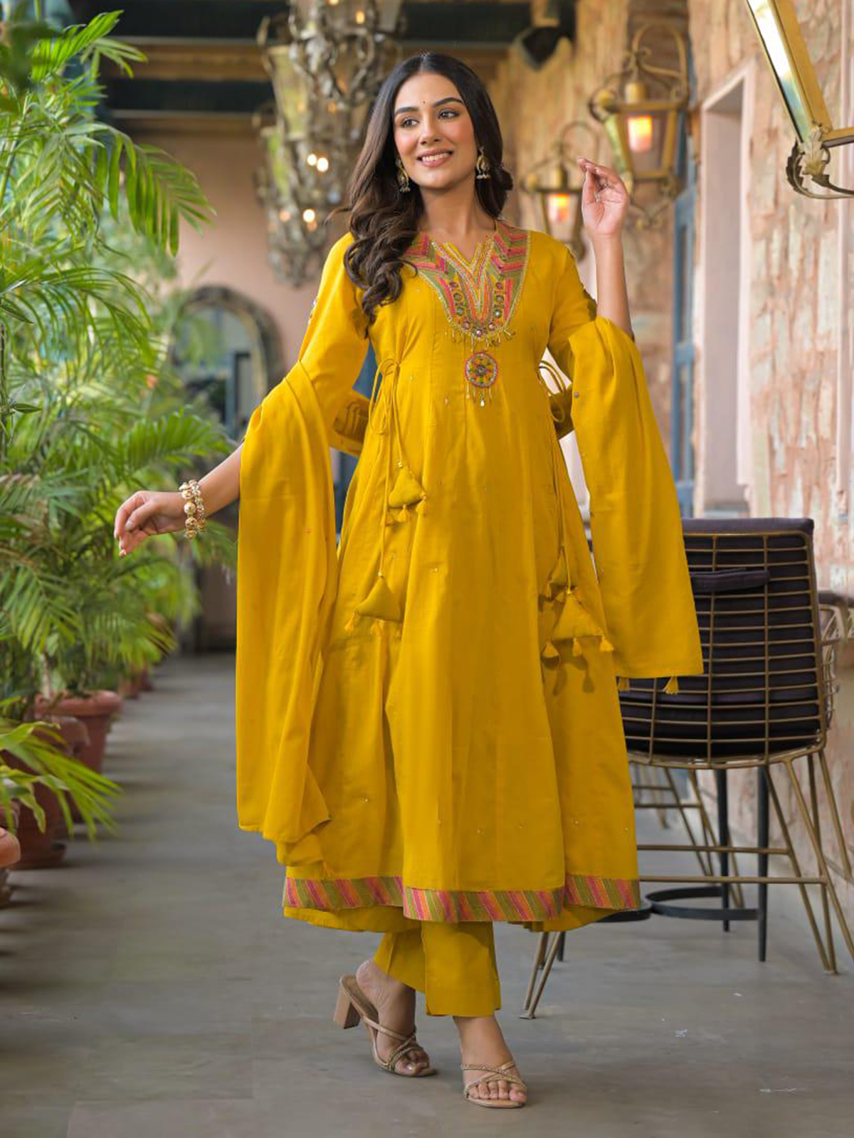 Bright mustard yellow cotton silk kurti set beautifully detailed with aabla, cutdana, beads, sequins and thread work. Designed with a sweetheart neckline and quarter sleeves, it is paired with a pant and dupatta, ideal for haldi and festive functions.