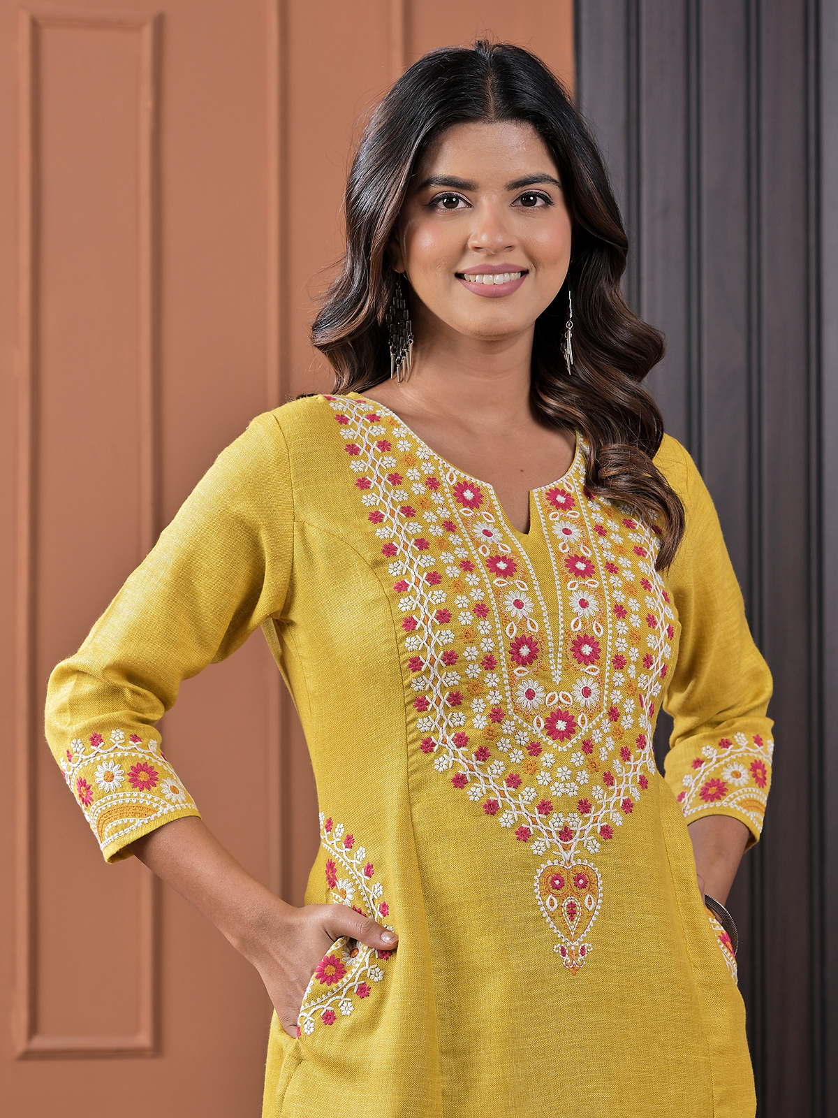Crafted from breathable linen, this mustard yellow kurti set is highlighted with delicate thread work for subtle handcrafted appeal. Featuring a sweetheart neckline and quarter sleeves, it is paired with a pant, making it ideal for both festive moments and relaxed casual wear.