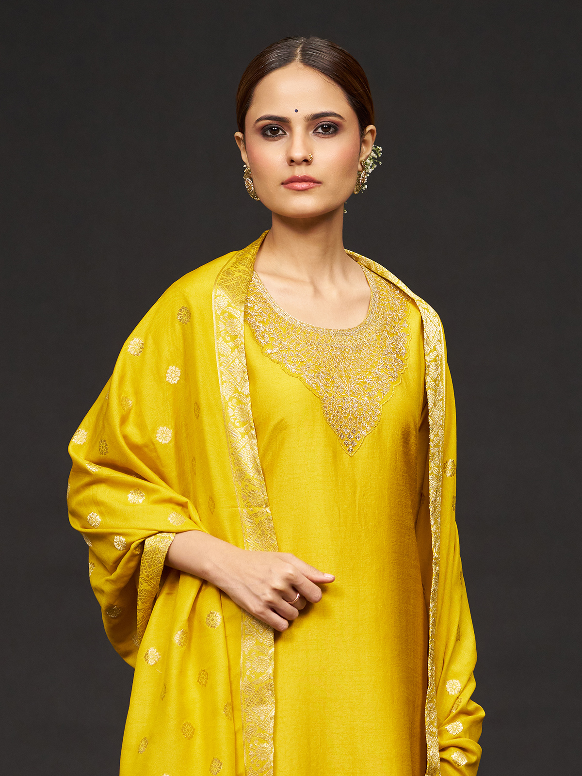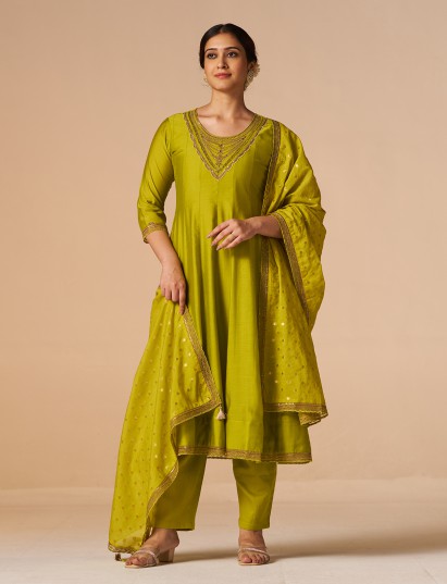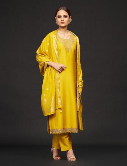 Bright and graceful, this mustard yellow silk kurti set is detailed with fine resham embroidery highlighted by gentle sequin work. Styled with a round neckline and quarter sleeves, it includes a pant and dupatta, offering a perfect blend of festive elegance and everyday comfort.