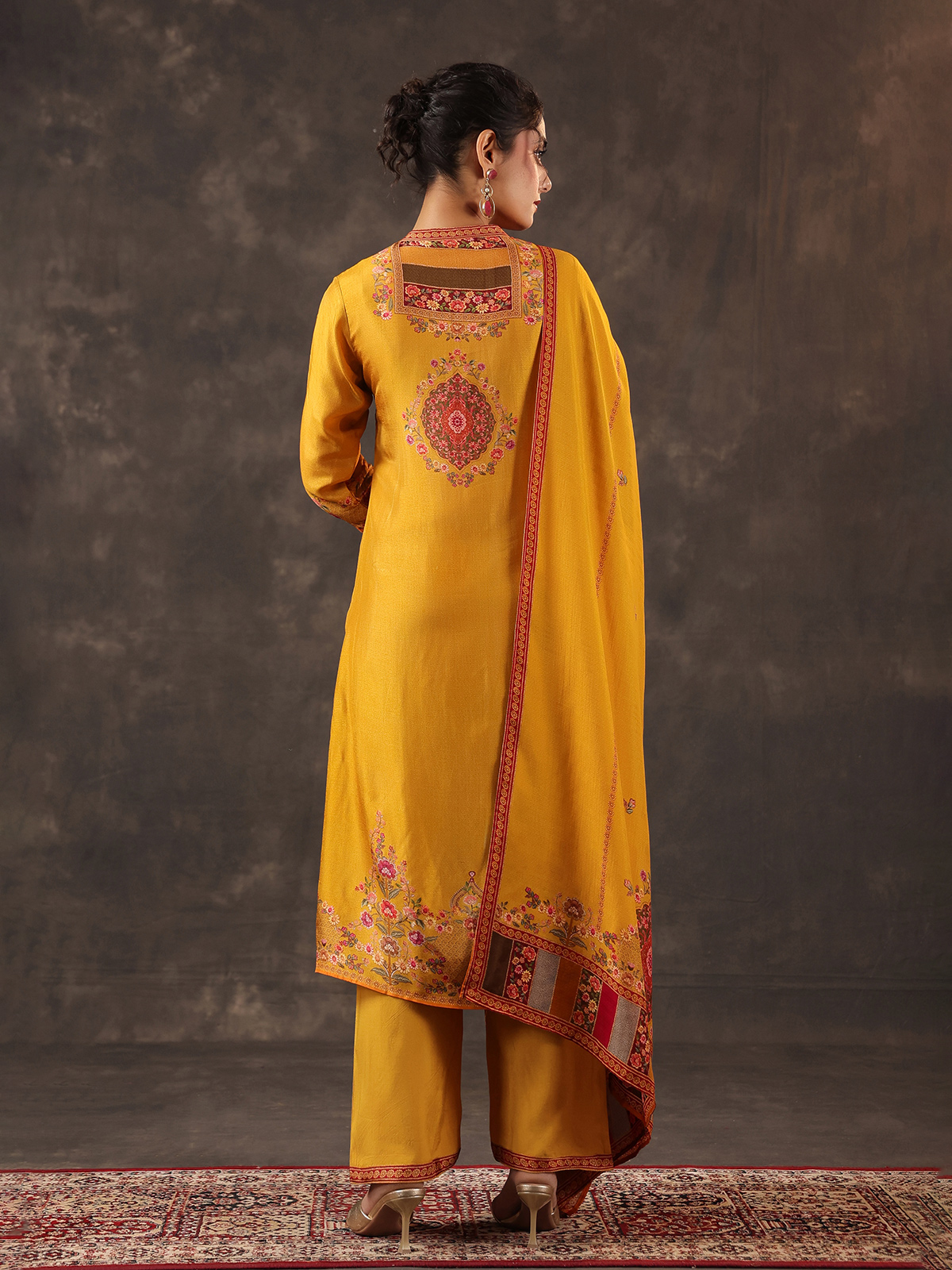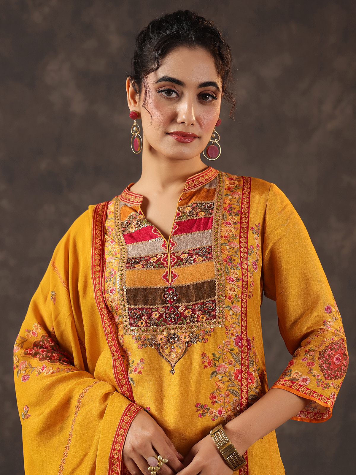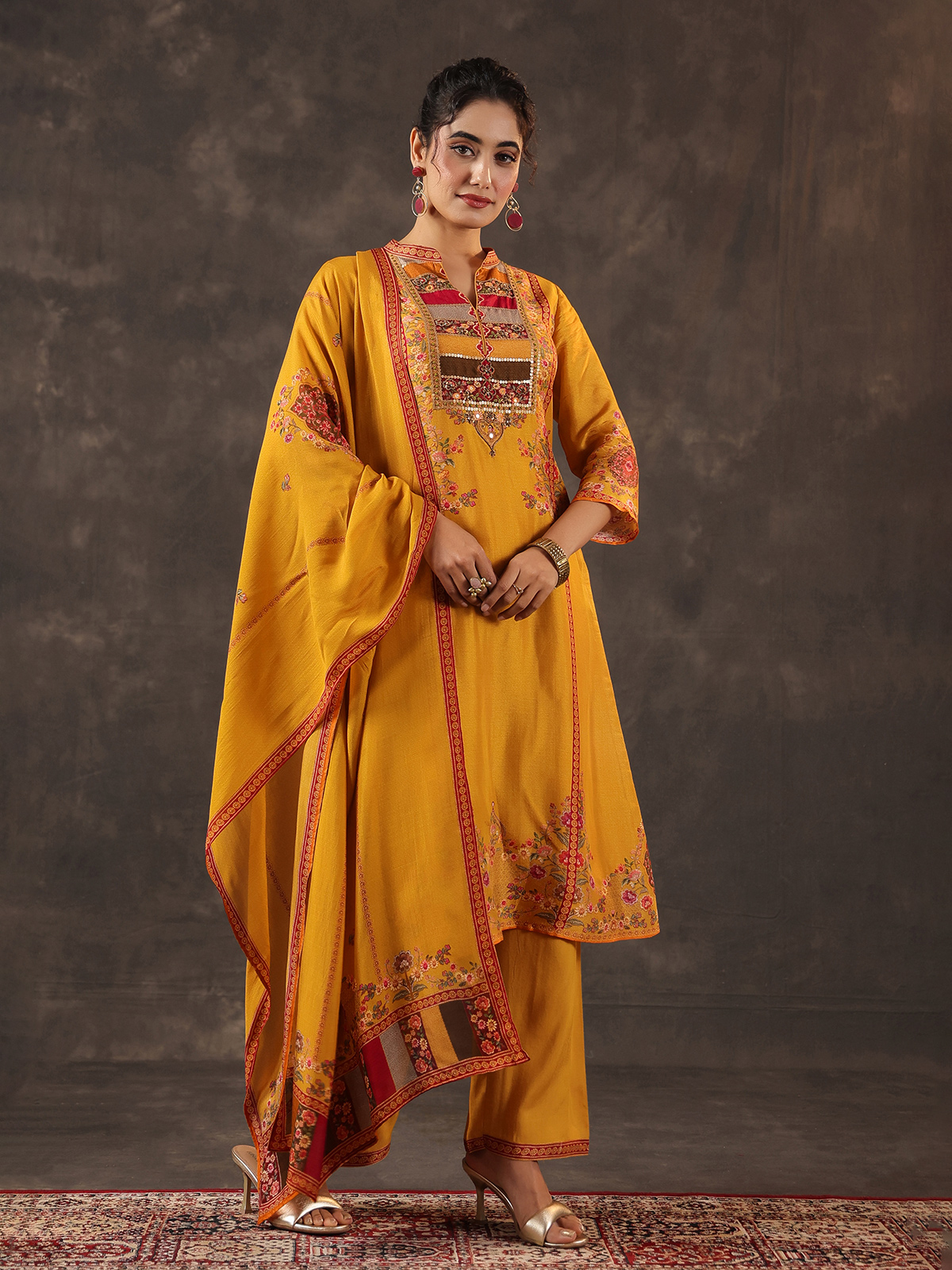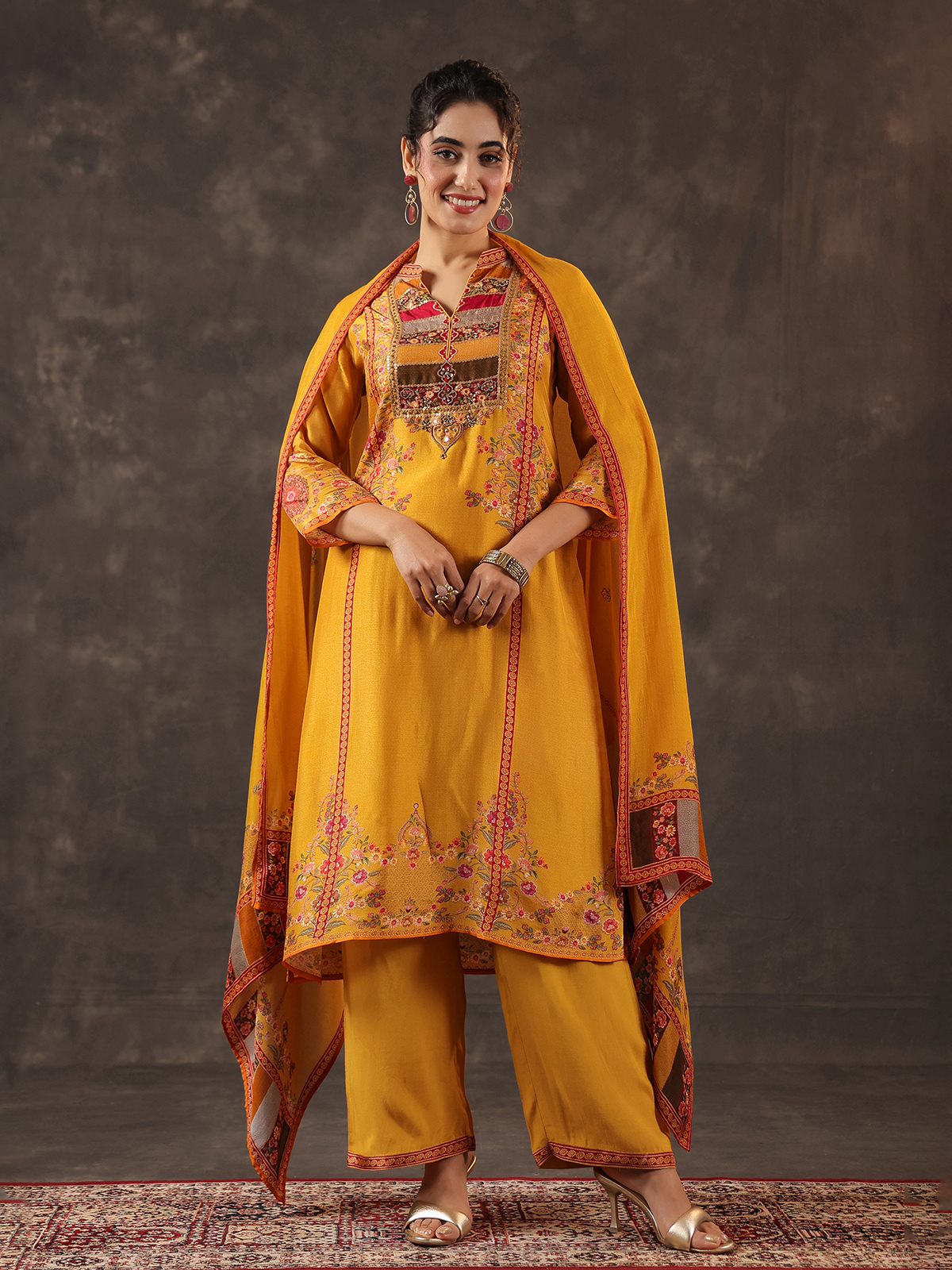 Radiating festive warmth mustard yellow russian silk kurti set reflects timeless ethnic charm. The printed yoke style kurti features a graceful collar neckline and quarter sleeves. Adorned with cutdana, sequins, mirror, thread and bead embellishments. Paired with tailored pants and a coordinated dupatta, the ensemble creates a traditional silhouette perfect for casual celebrations, festive gatherings and vibrant haldi ceremonies.