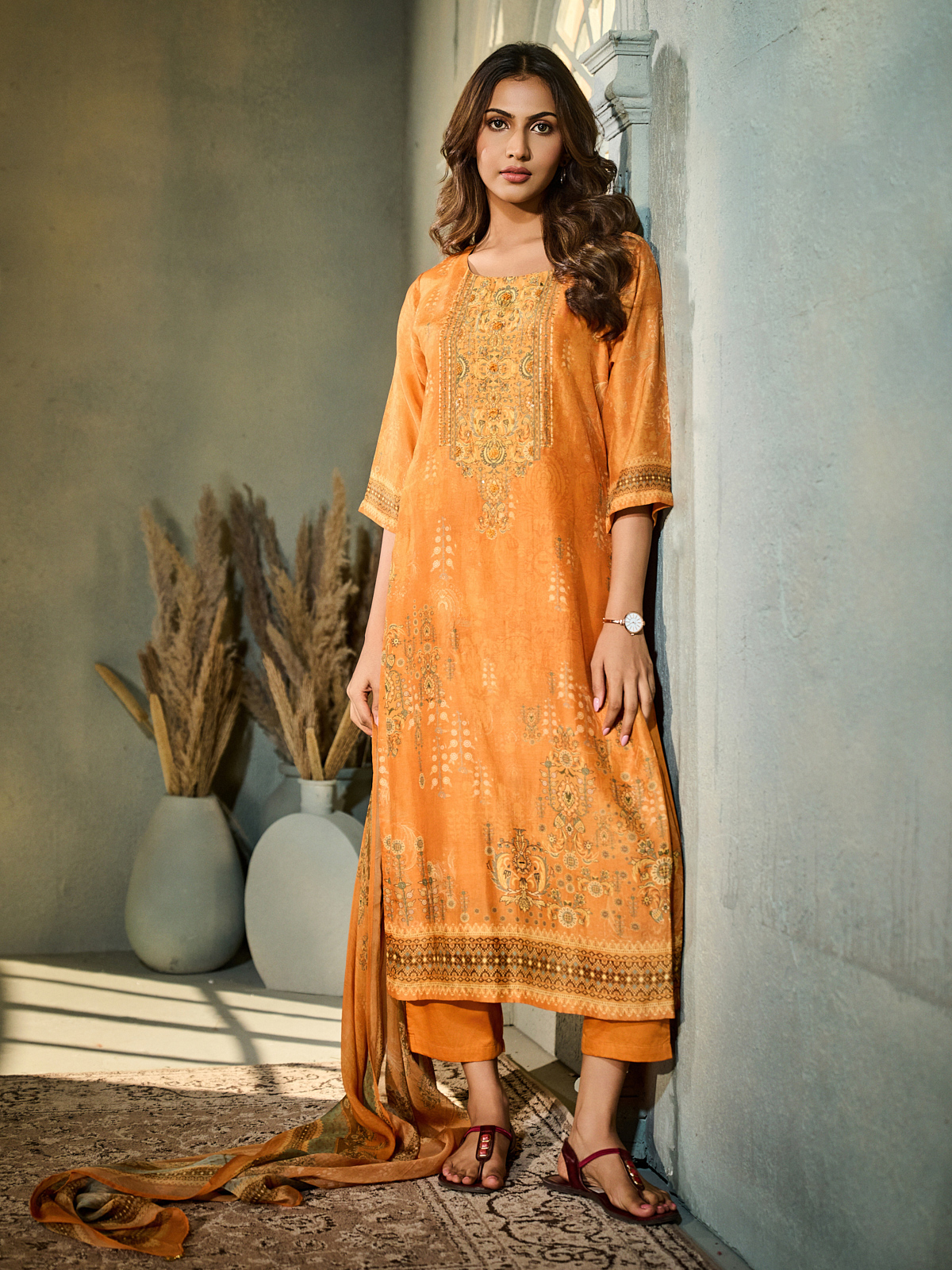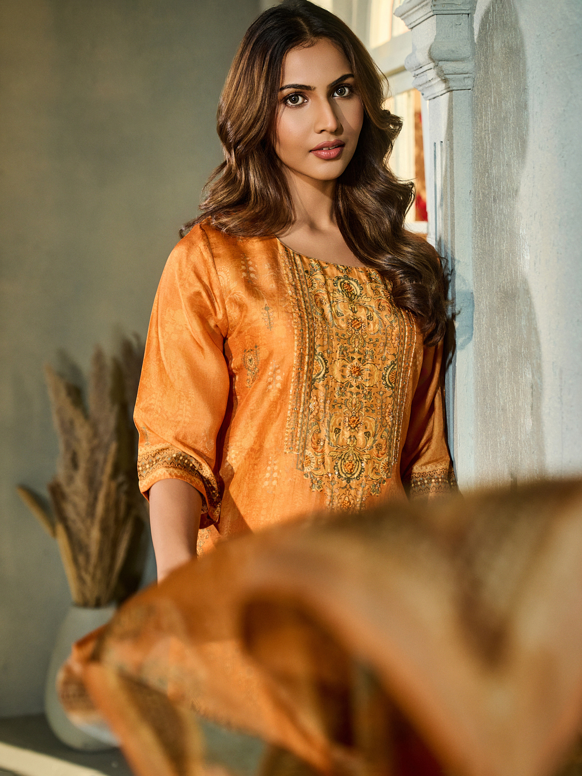 In mustard silk warm embrace, this printed kurti set blooms with intricate thread, sequins, and beads. The round neckline and quarter sleeves carry delicate poise. Styled with pant and dupatta, it evokes timeless charm, blending festive richness with everyday elegance.