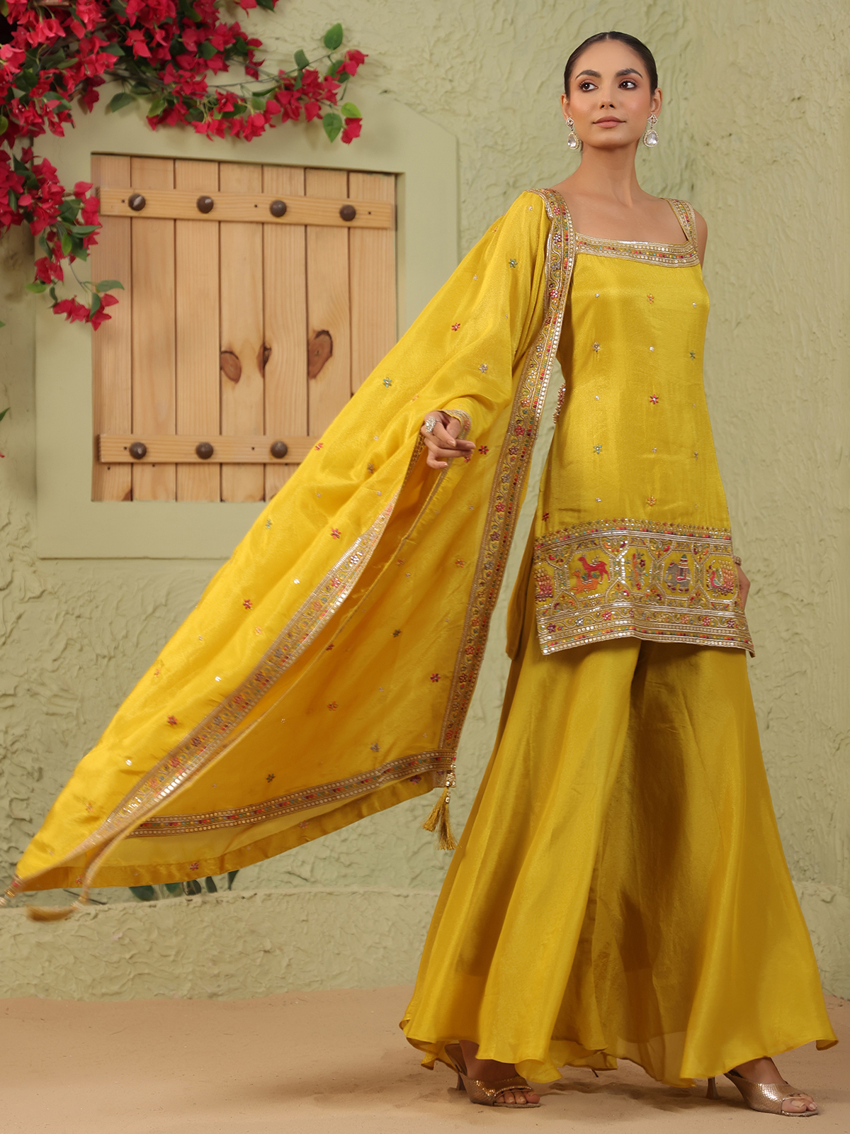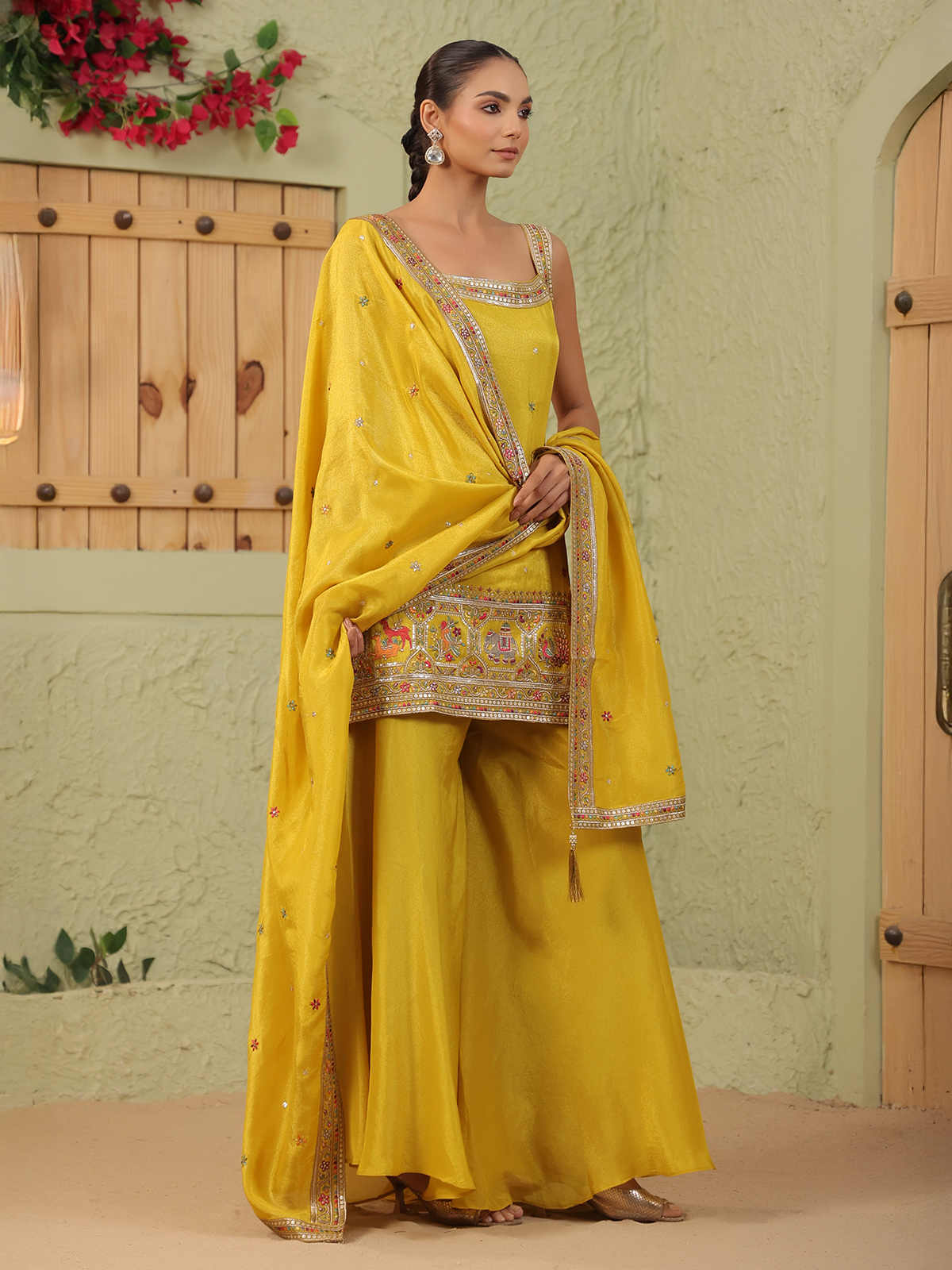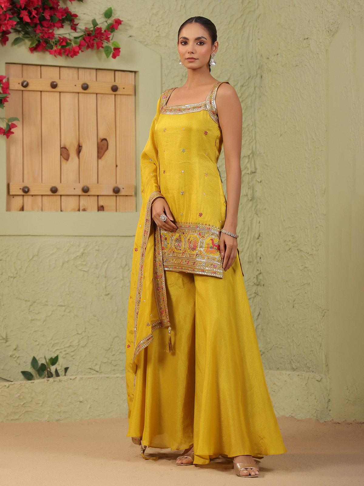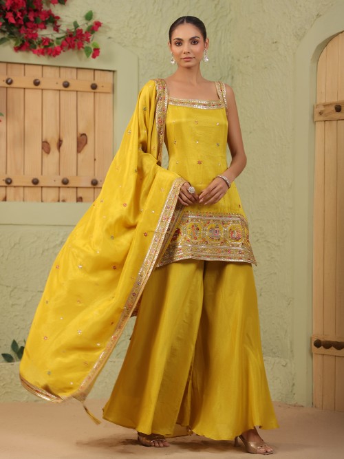 Mustard Yellow Silk Palazzo Kurti Set For Women