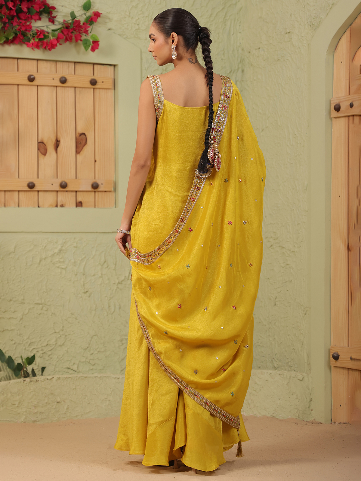 Bright and cheerful, this mustard yellow silk kurti set sparkles with embroidery and sequins. Designed with a sleeveless square neckline, it is paired with a palazzo and dupatta for complete elegance. A stunning pick for haldi ceremonies, weddings, and festive occasions, radiating joyous energy.
