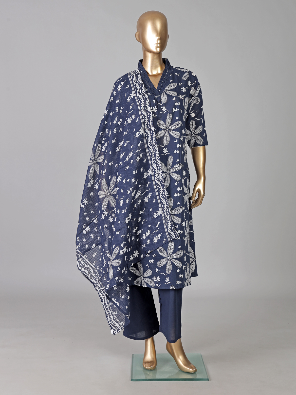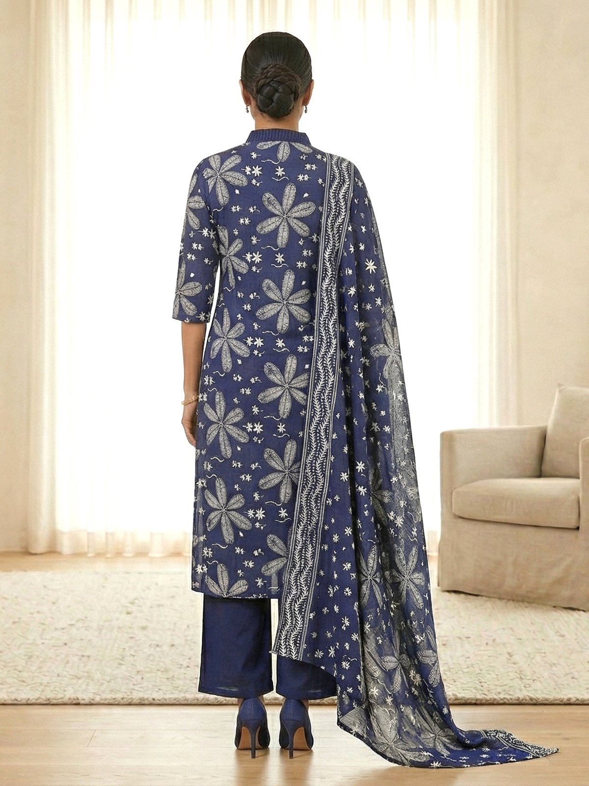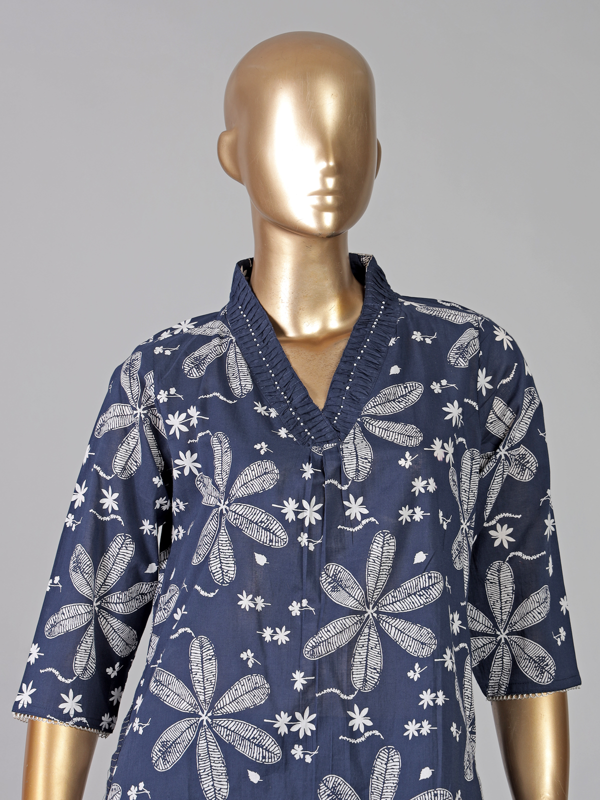 Simple and stylish navy cotton silk kurti set is perfect for casual and festive wear. Featuring a V neckline and quarter sleeves. It showcases elegant floral prints. Paired with pants. It ensures a comfortable and graceful everyday look.