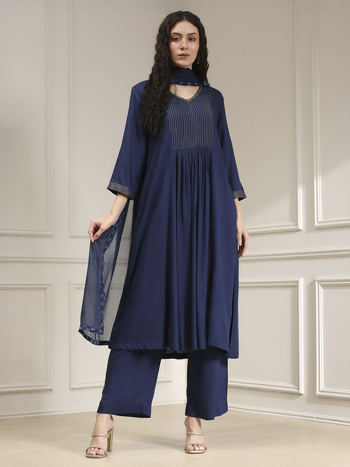 Navy cotton silk kurti set exudes timeless charm, enveloping you in refined textures for vibrant gatherings. Intricate thread and sequins adorn the V-neck and quarter sleeves with gentle gleam. Complemented by tailored pants and a coordinating dupatta, the ensemble flows with soft, festive grace.