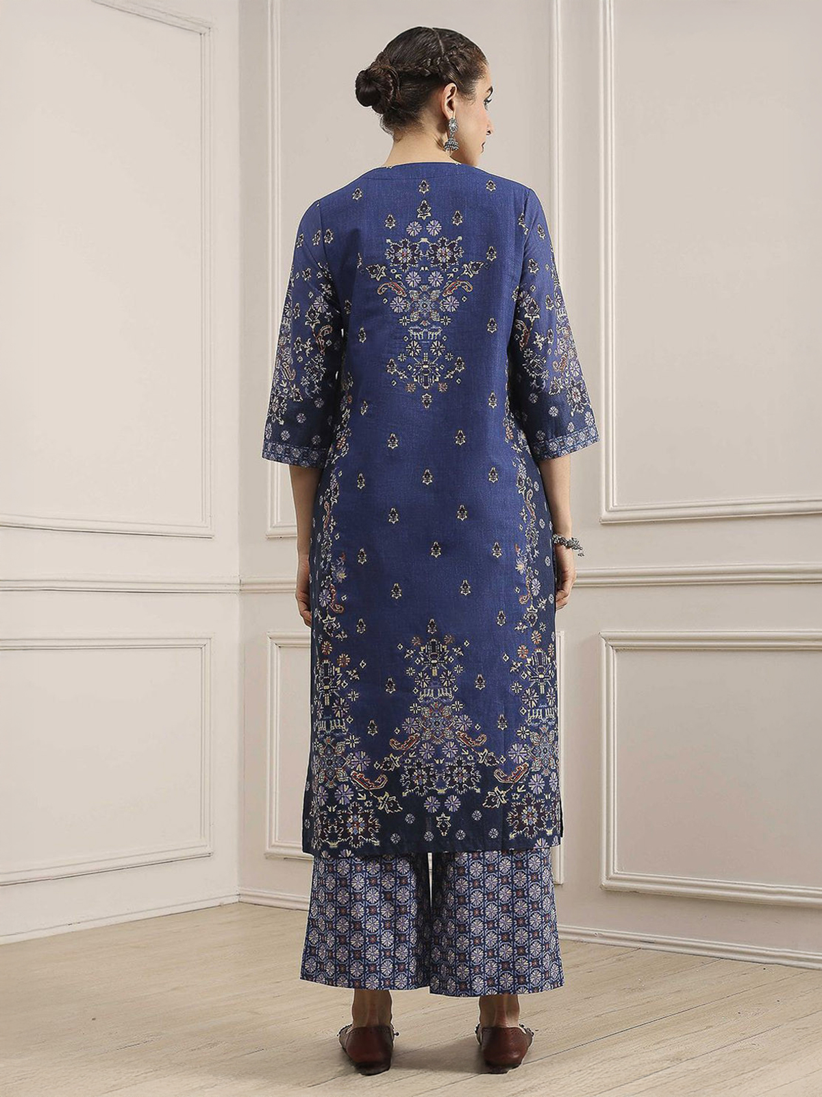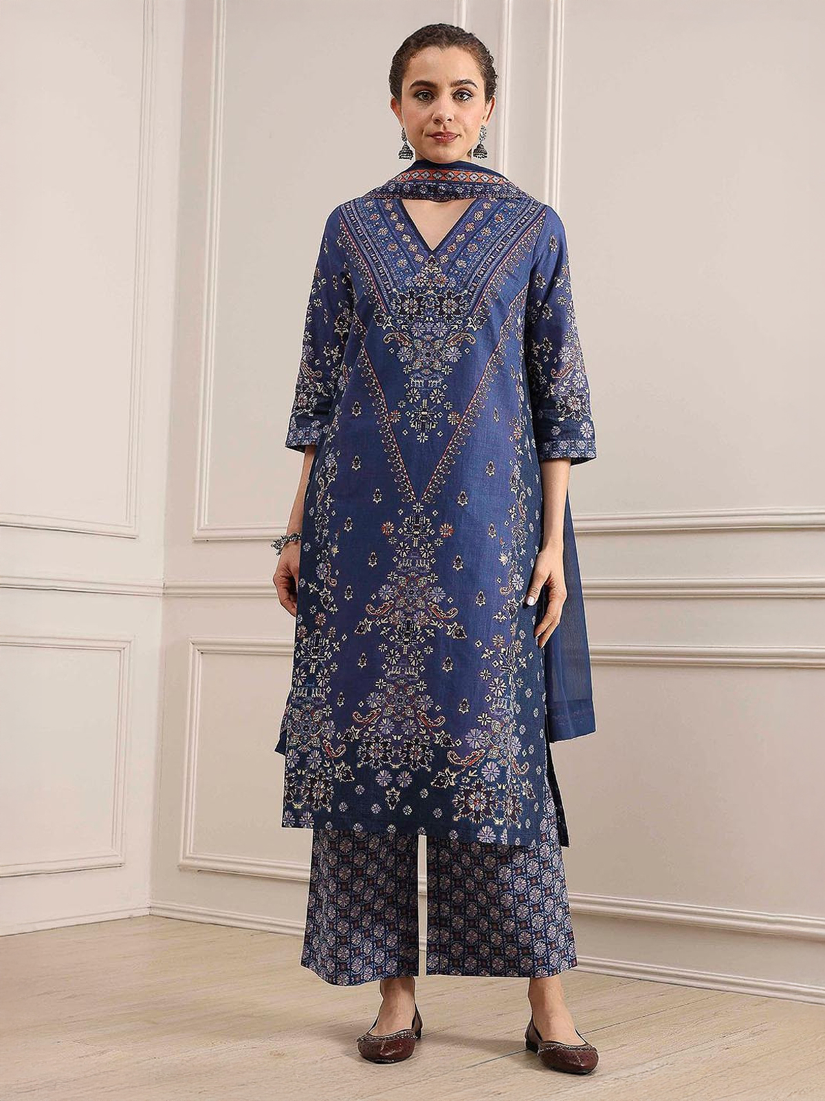 Deep navy cotton kurti set glides with understated sophistication for festive occasions. Sequins and beads trace the V-neck and quarter sleeves, adding subtle sparkle that dances with every movement. Matching pants and a soft dupatta bring harmony, blending modern style with traditional festivity.