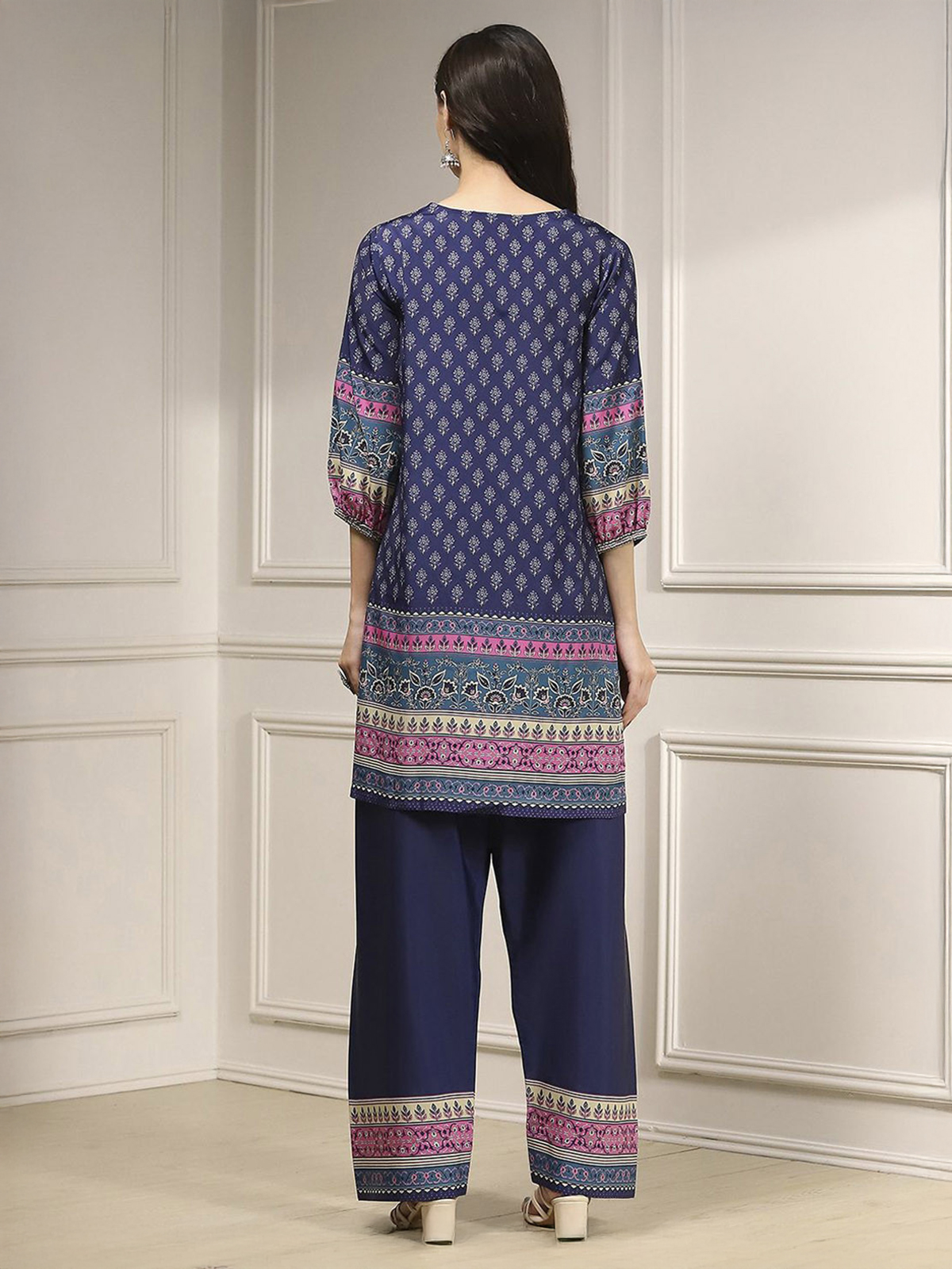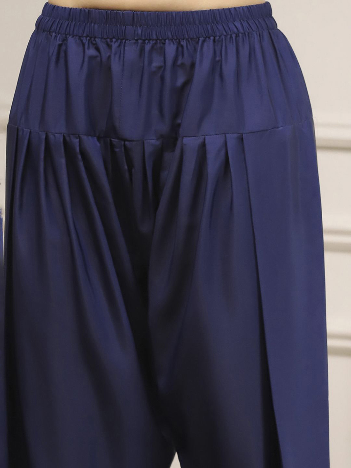 Navy cotton silk kurti set flows with sleek contemporary style, perfect for celebratory evenings. Minimal printed patterns enhance the round neckline and quarter sleeves with delicate visual appeal. Coordinated pants and a soft dupatta complete the set, combining festive warmth with modern elegance.