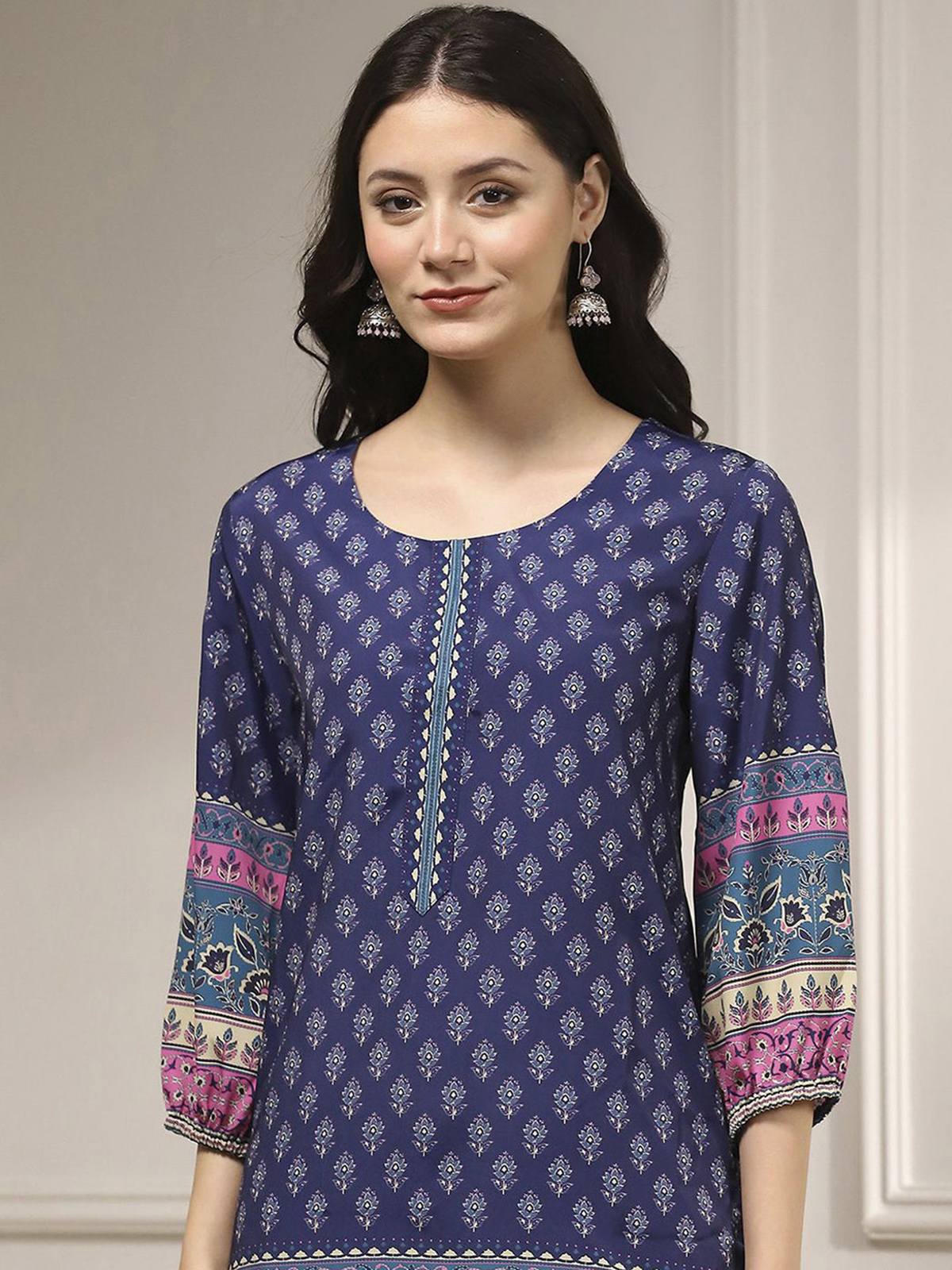 Navy Printed Cotton Silk Kurti Set With Stylish Dupatta