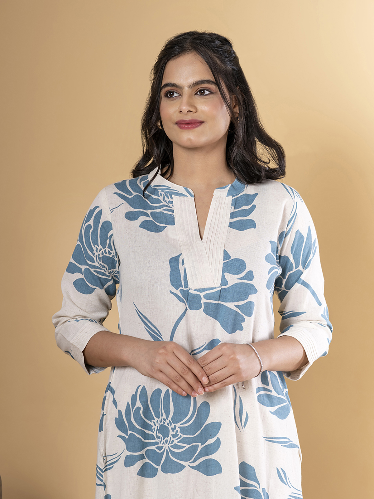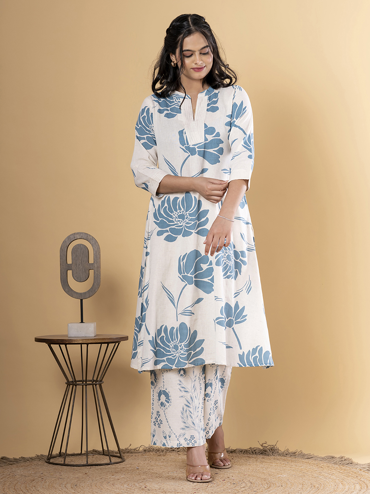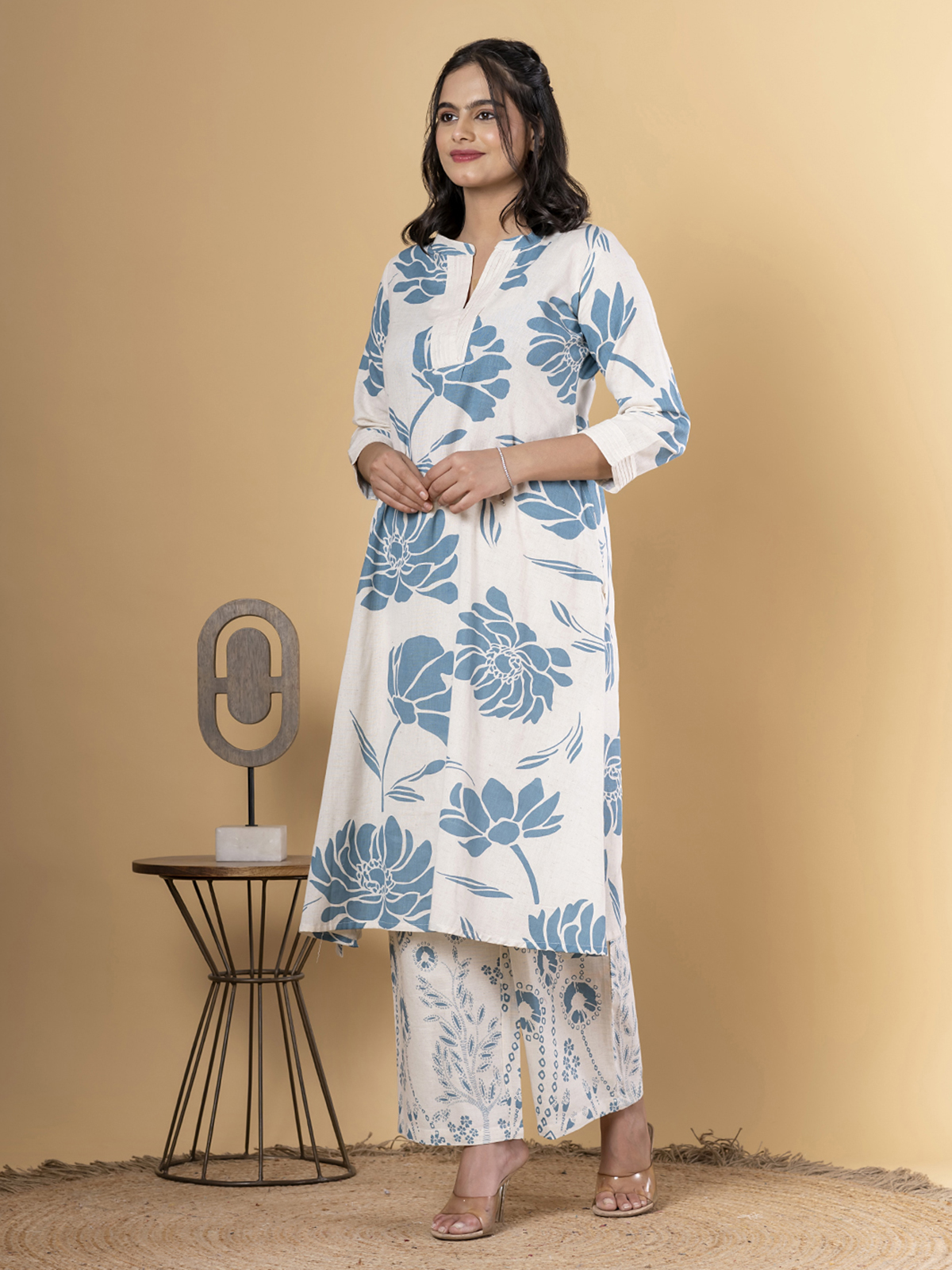This off white and grey cotton silk kurti set features graceful prints, a stand collar, and quarter sleeves. Paired with a palazzo, it blends contemporary elegance with festive appeal.