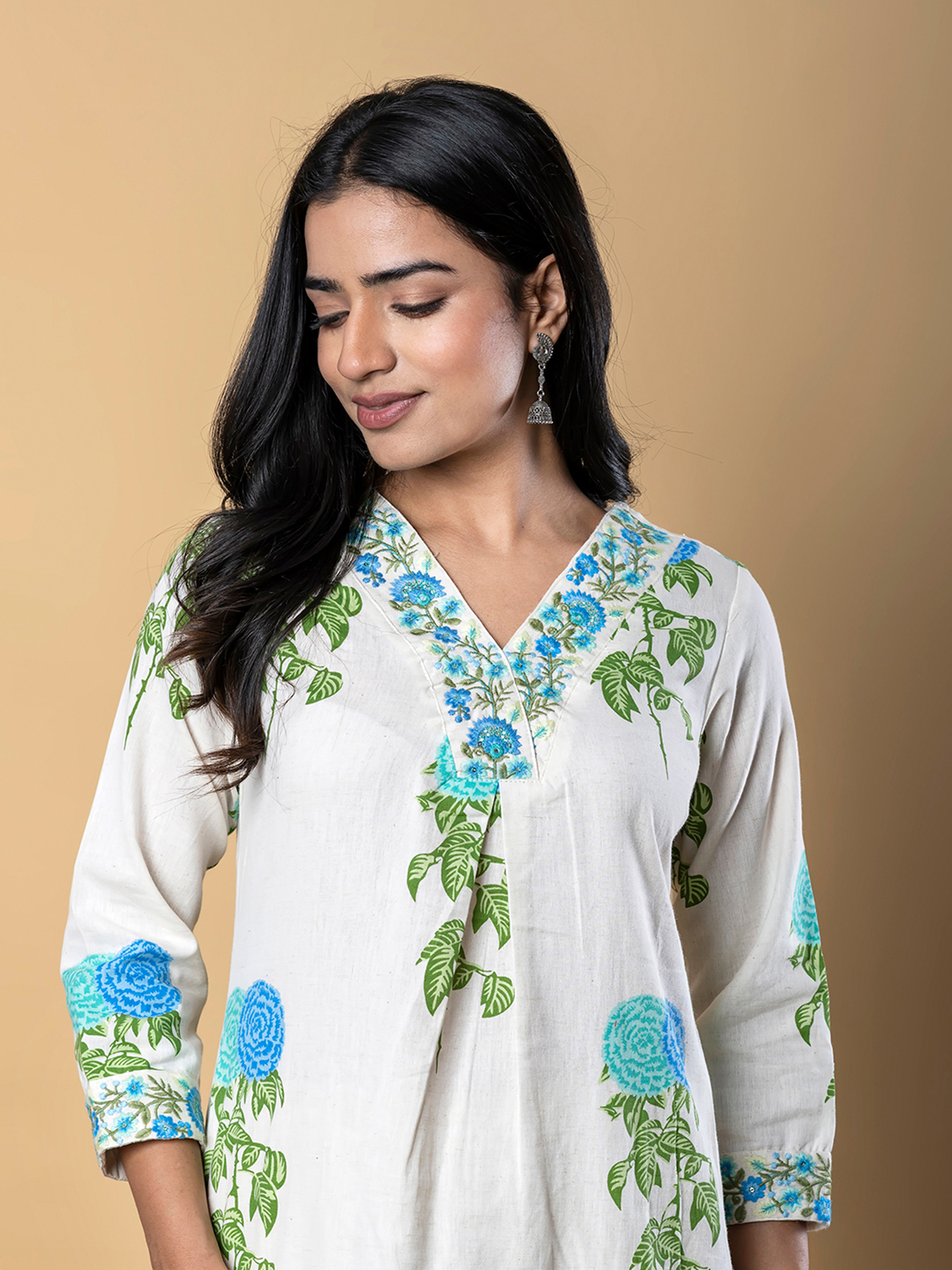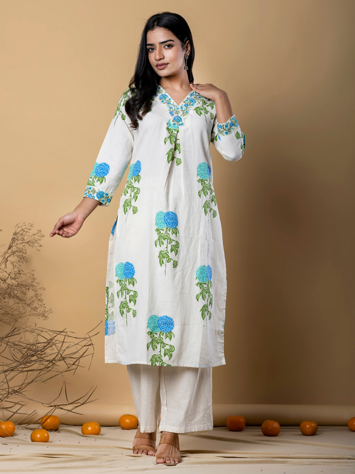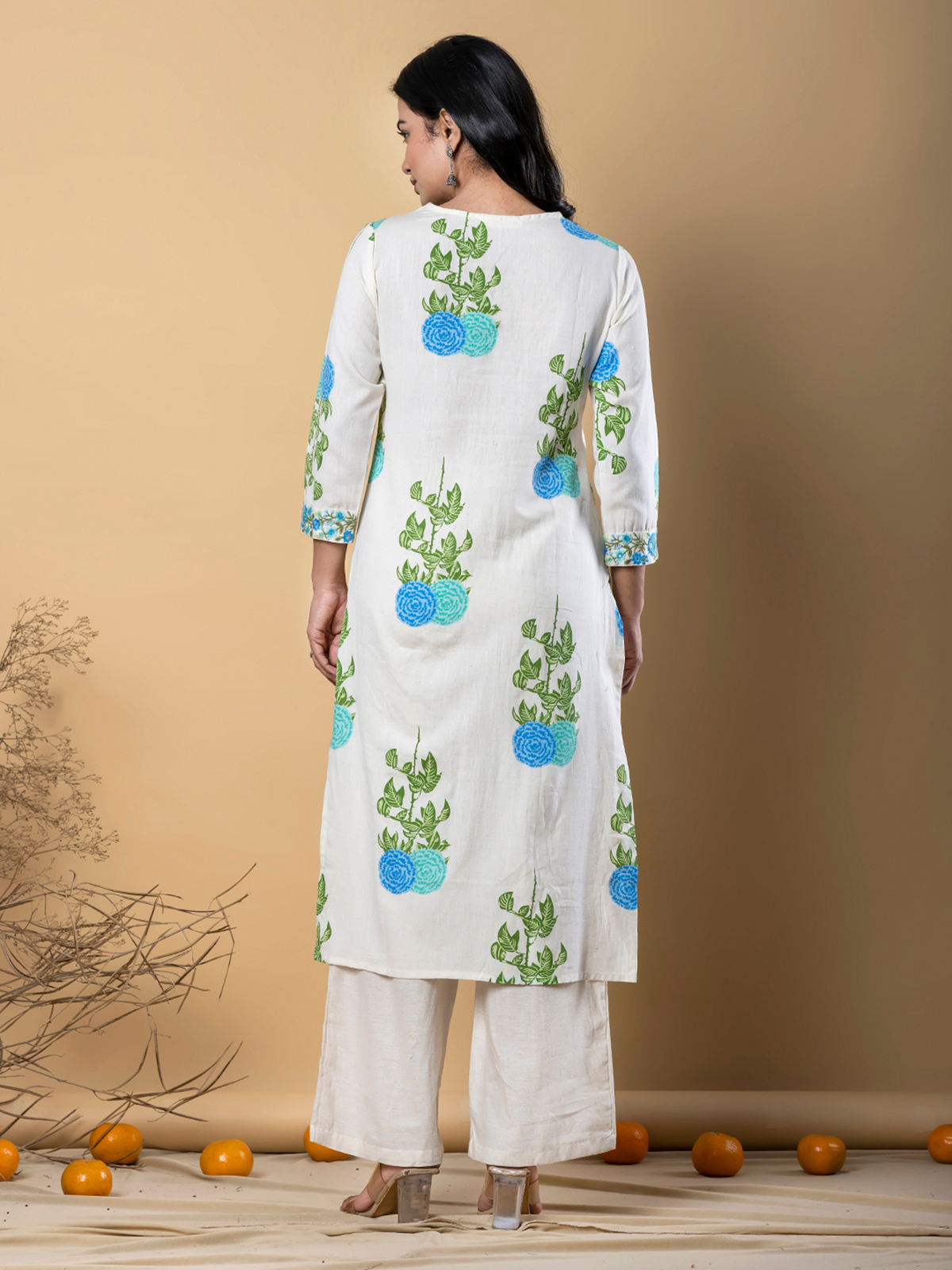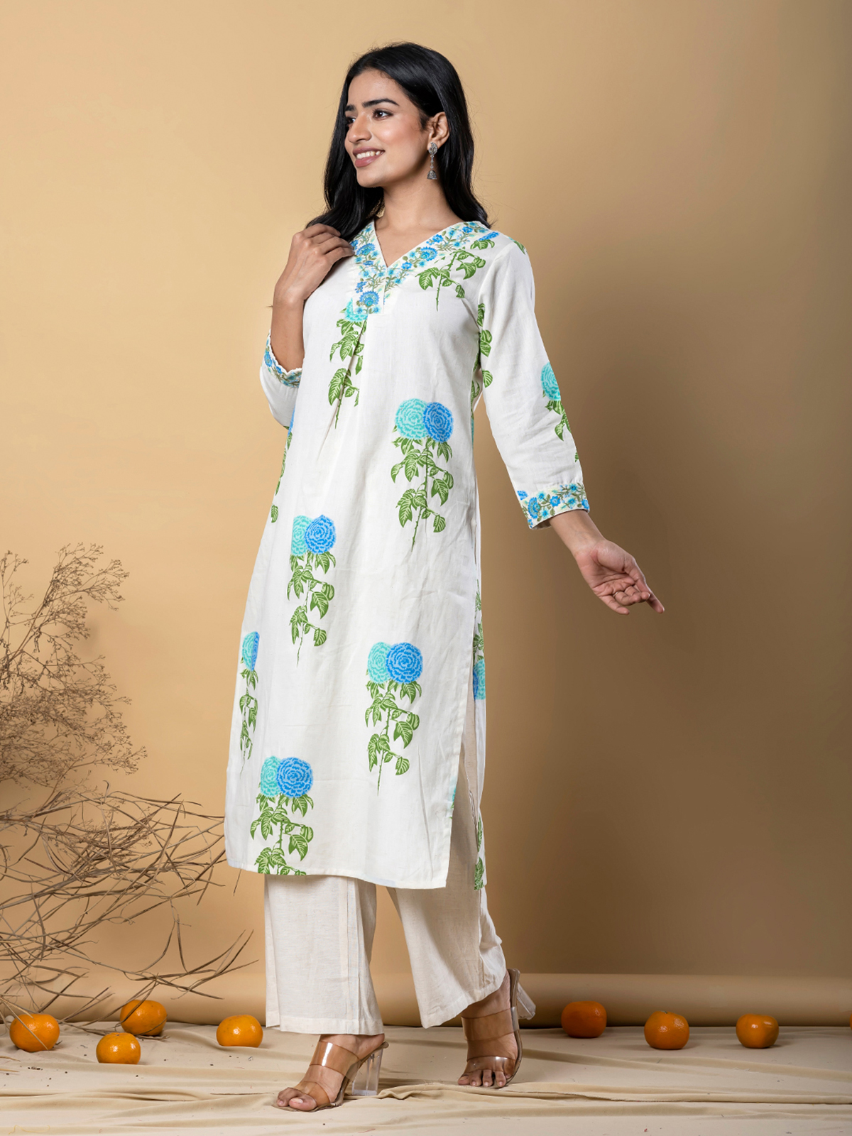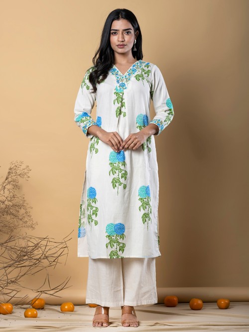 This off white cotton silk printed kurti set sparkles with embroidery and sequins for festive charm. Featuring a V-neckline and quarter sleeves, it is paired with a comfortable palazzo, blending artistry with elegance for celebrations.