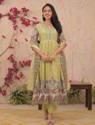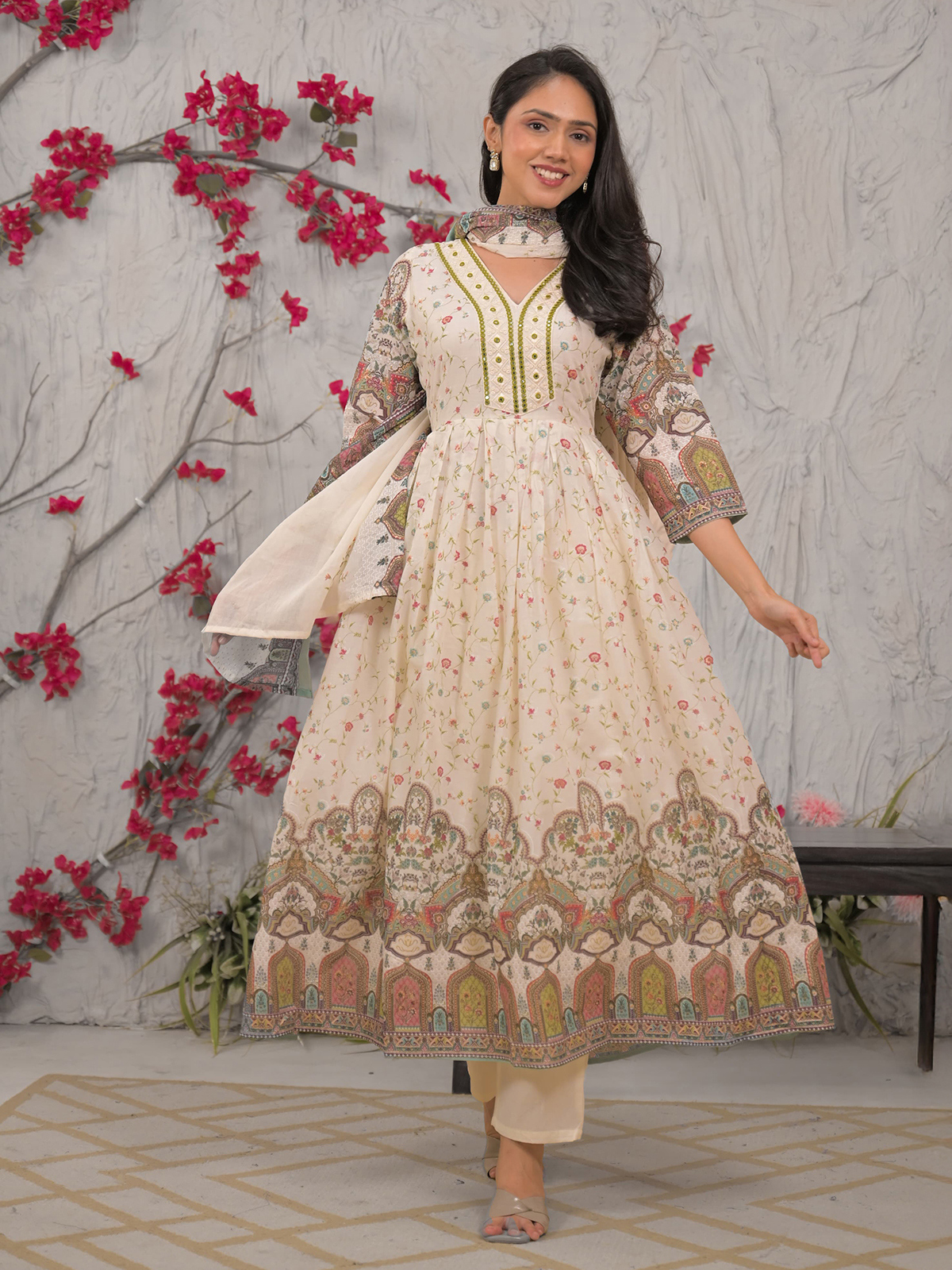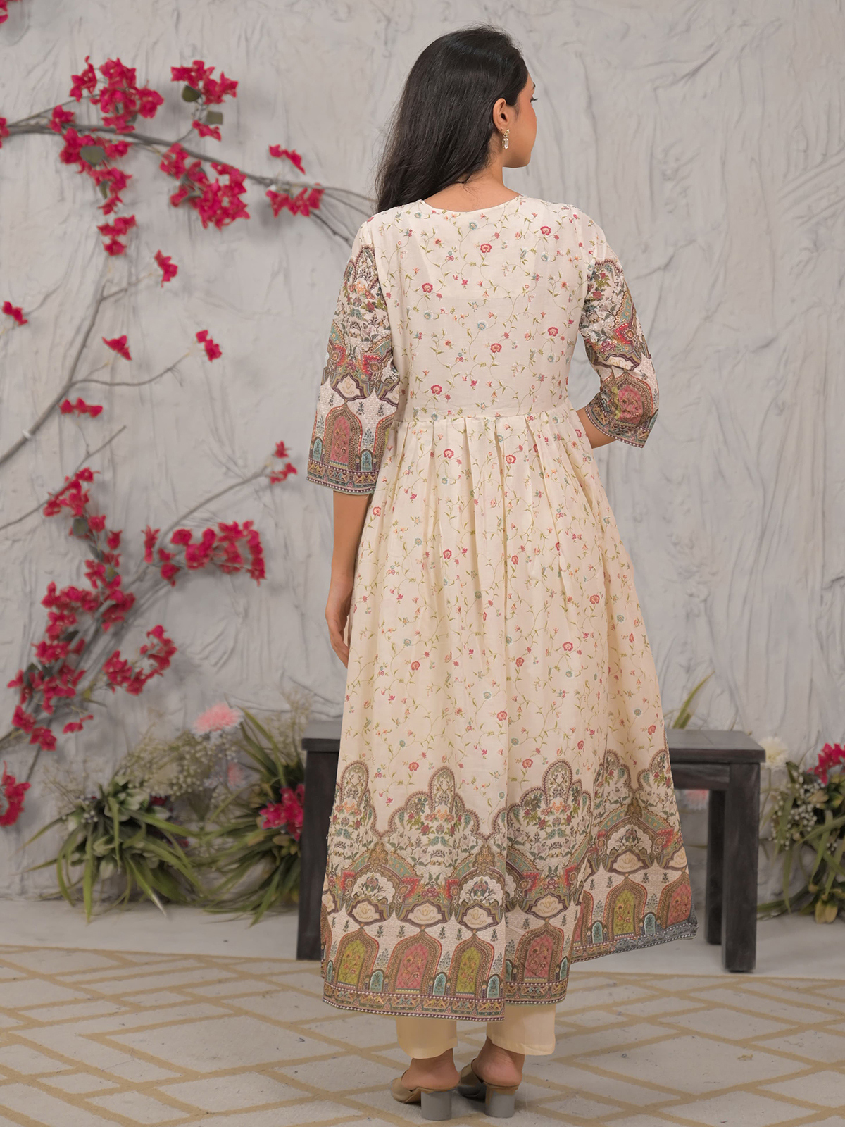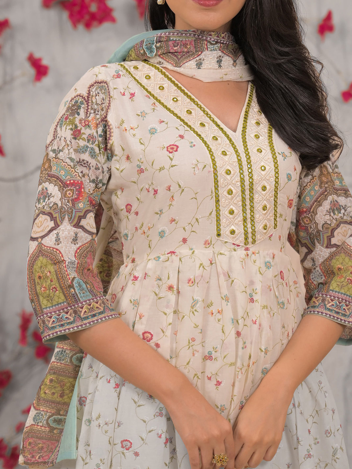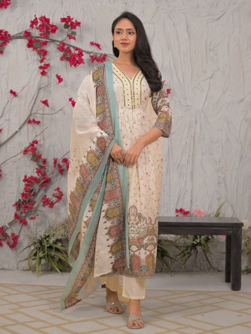 This off white kurti set in mulmul cotton is adorned with delicate aabla, embroidery, and thread accents over printed fabric. Featuring a V neck and quarter sleeves, its paired with matching pant and dupatta for a graceful ethnic festive look.