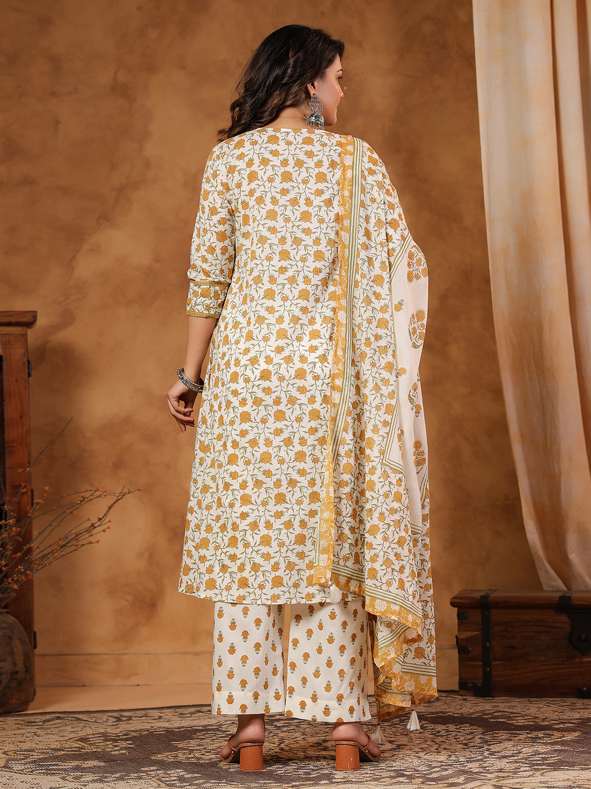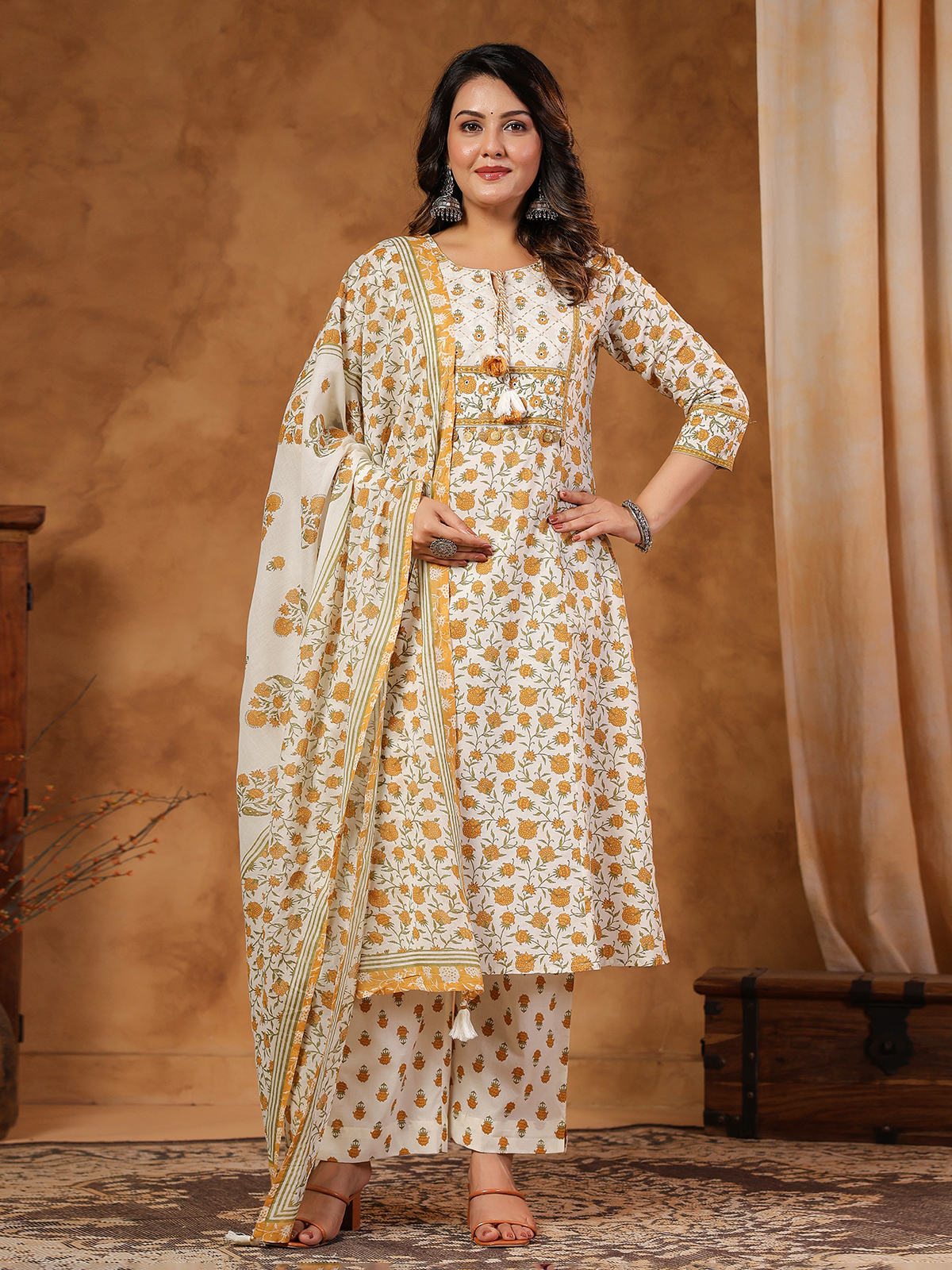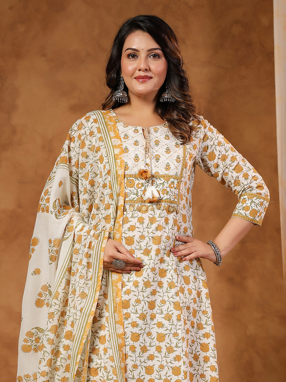 Bring vibrant elegance to your festive style with this graceful off-white cotton kurti set featuring a bright yellow printed design. The kurti is enhanced with thread and sequin detailing that adds a refined festive sparkle. Designed with a keyhole neckline and quarter sleeves, it is paired with a pant and a printed dupatta, making it ideal for festive occasions and Eid celebrations.