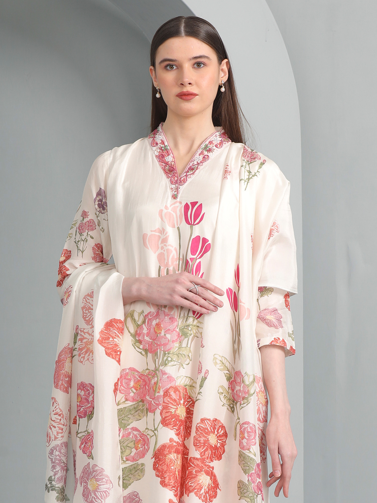 Elegant in off white silk, this kurti set features delicate floral prints uplifted with cutdana, sequins, and beads. Completed with a V neckline, quarter sleeves, dupatta, and pant, it makes a timelessly festive choice with refined grace.