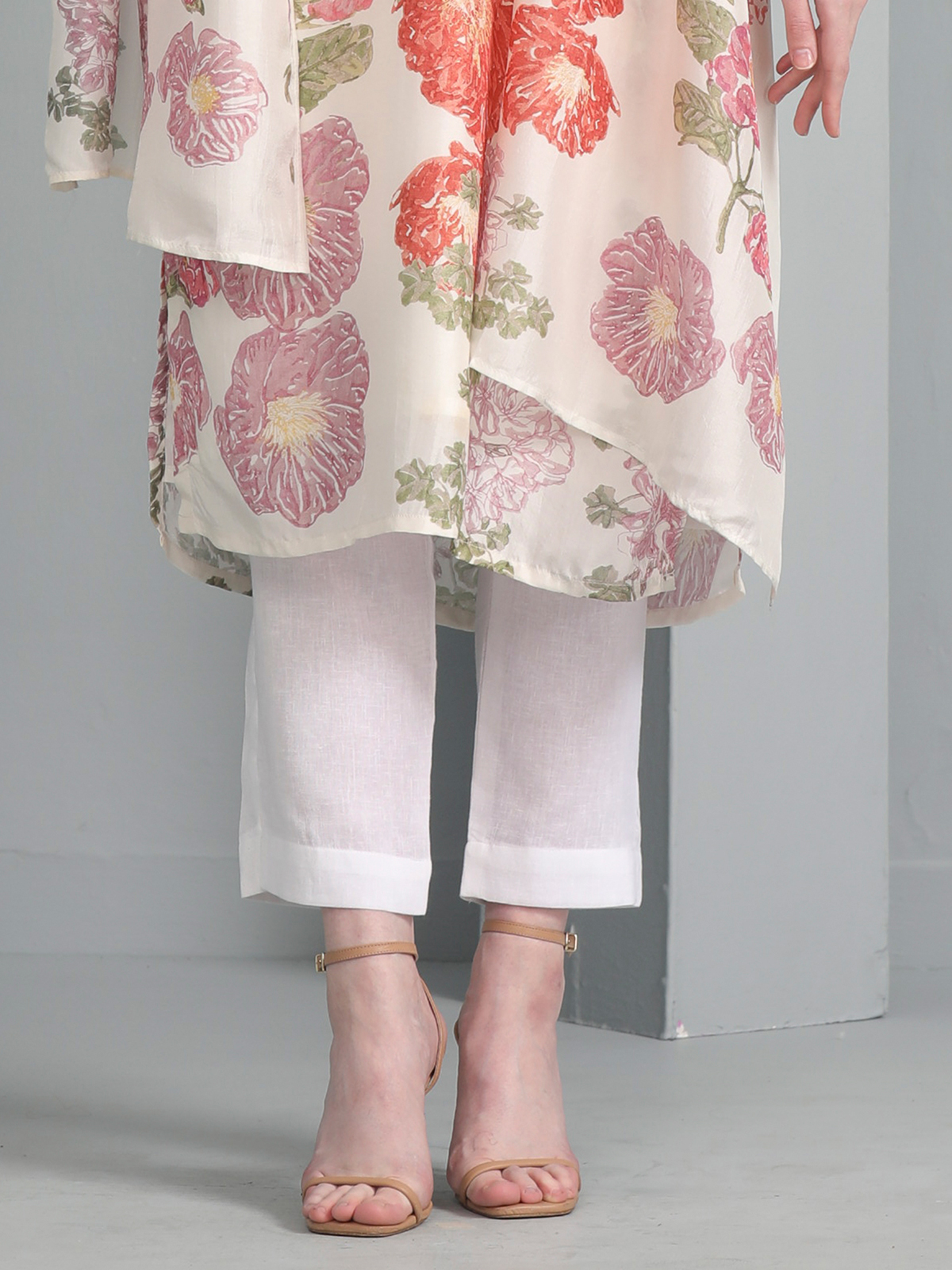 Off White Floral Printed Silk Kurti Set