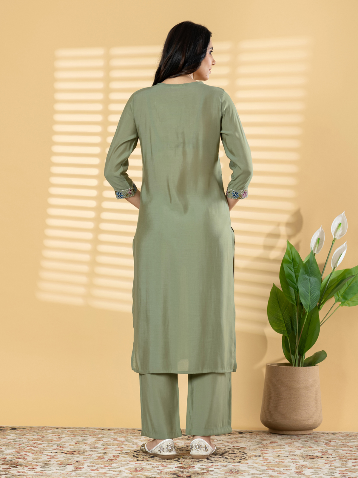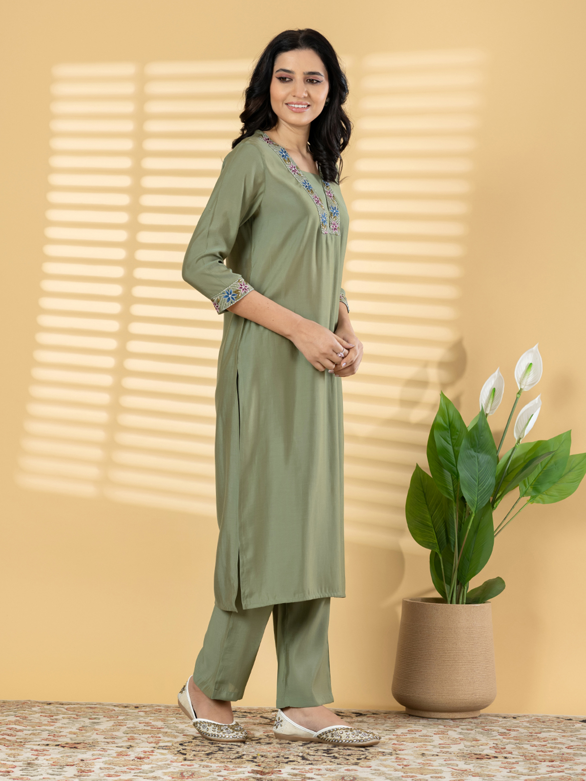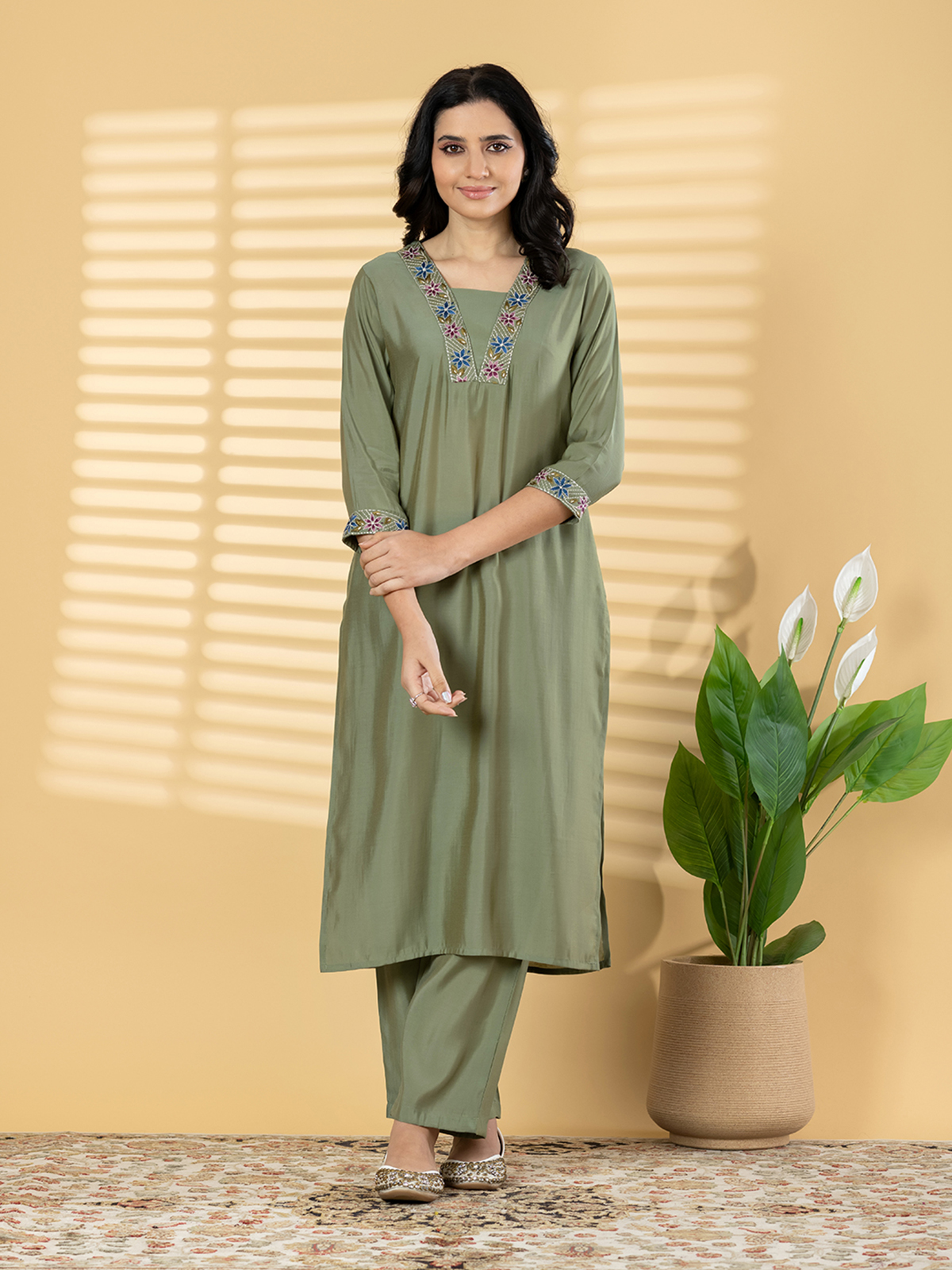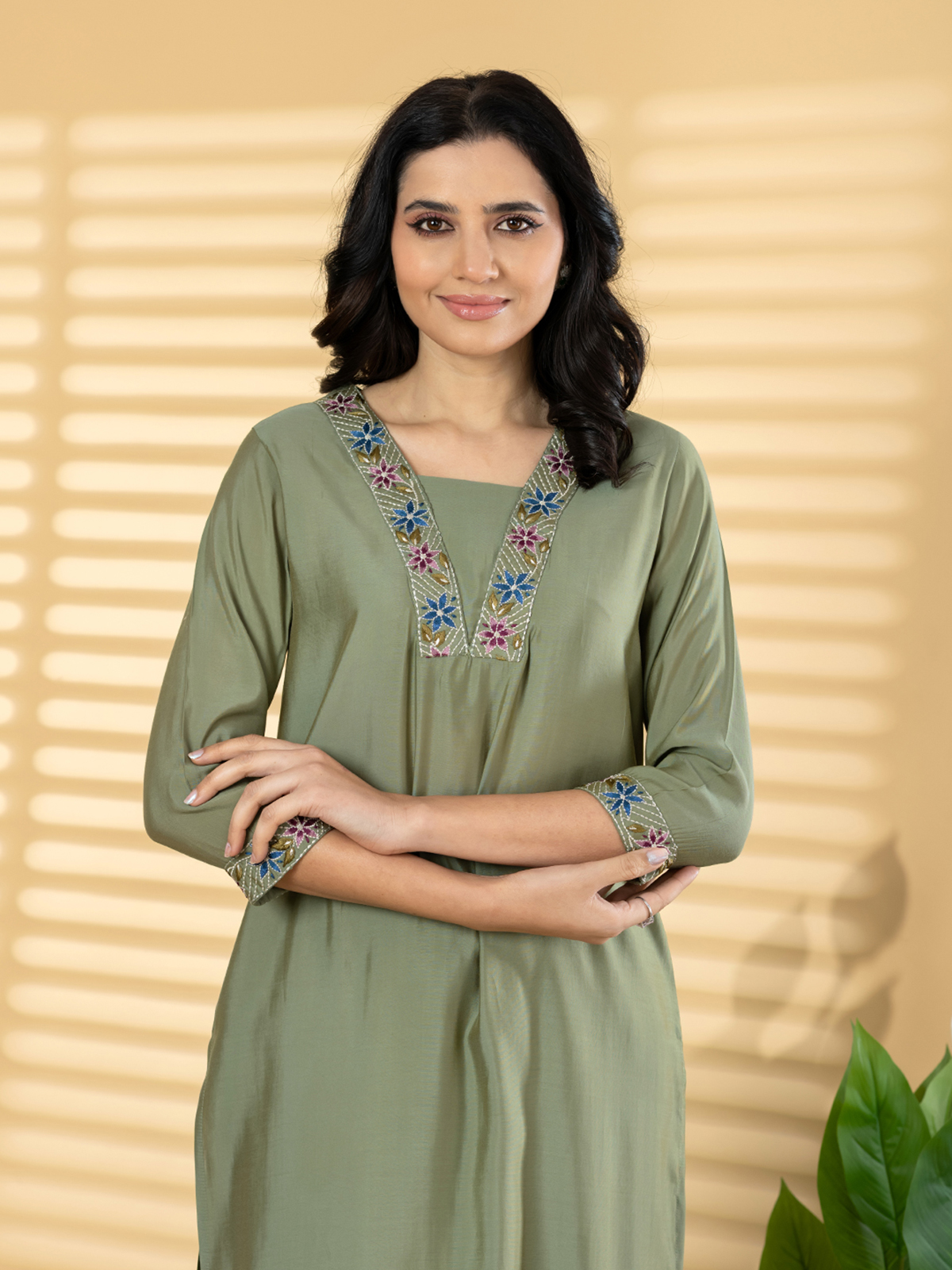 Highlighting your graceful beauty, this olive green silk kurti set reflects rich and timeless festive appeal. Styled with a simple neckline and quarter sleeves, it features elegant embroidery work that adds subtle sophistication. Ideal for festive wear, it comes with a pant and a dupatta, creating a balanced and stylish ethnic look.