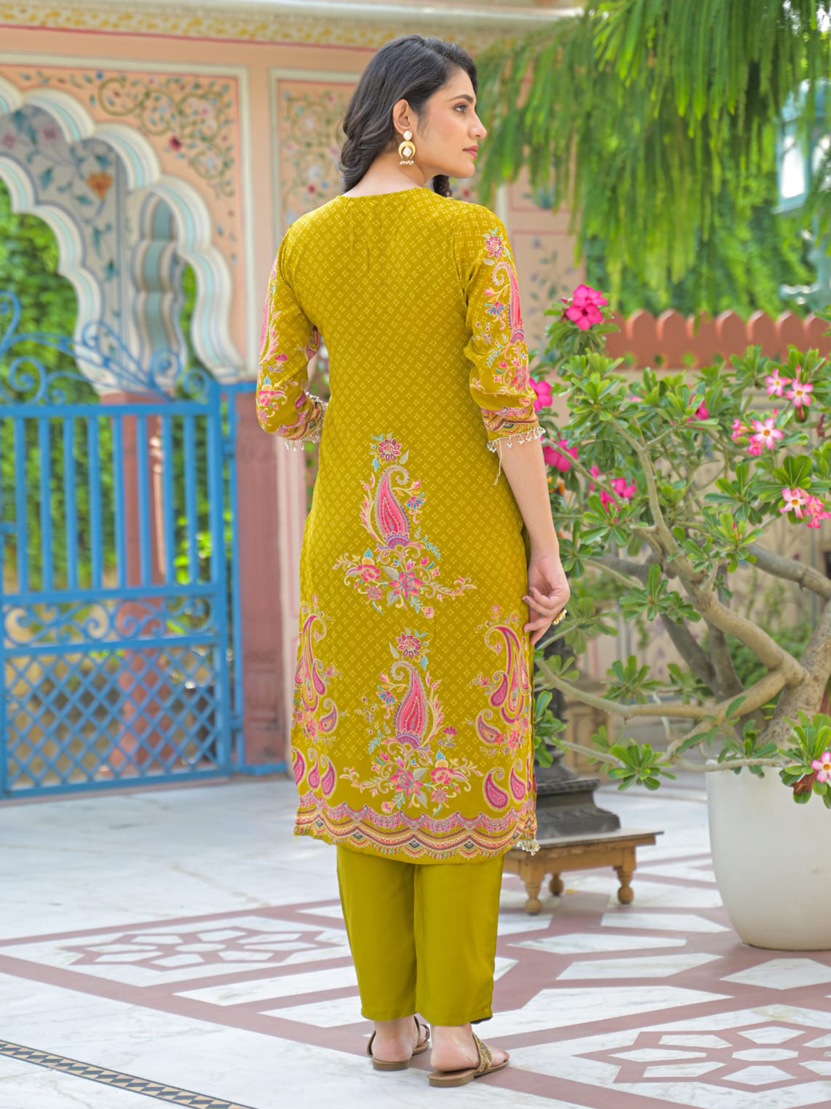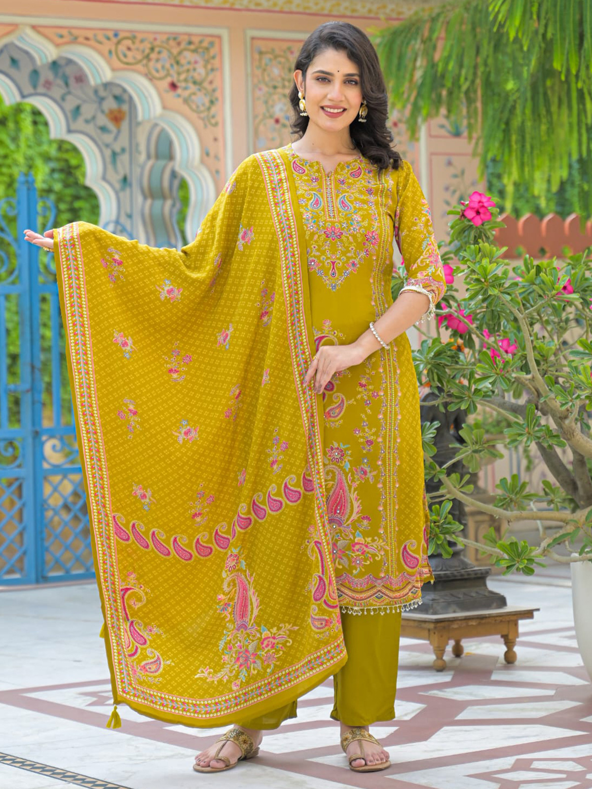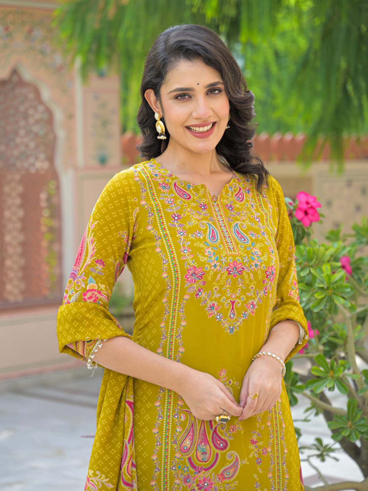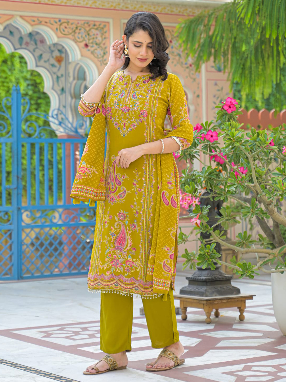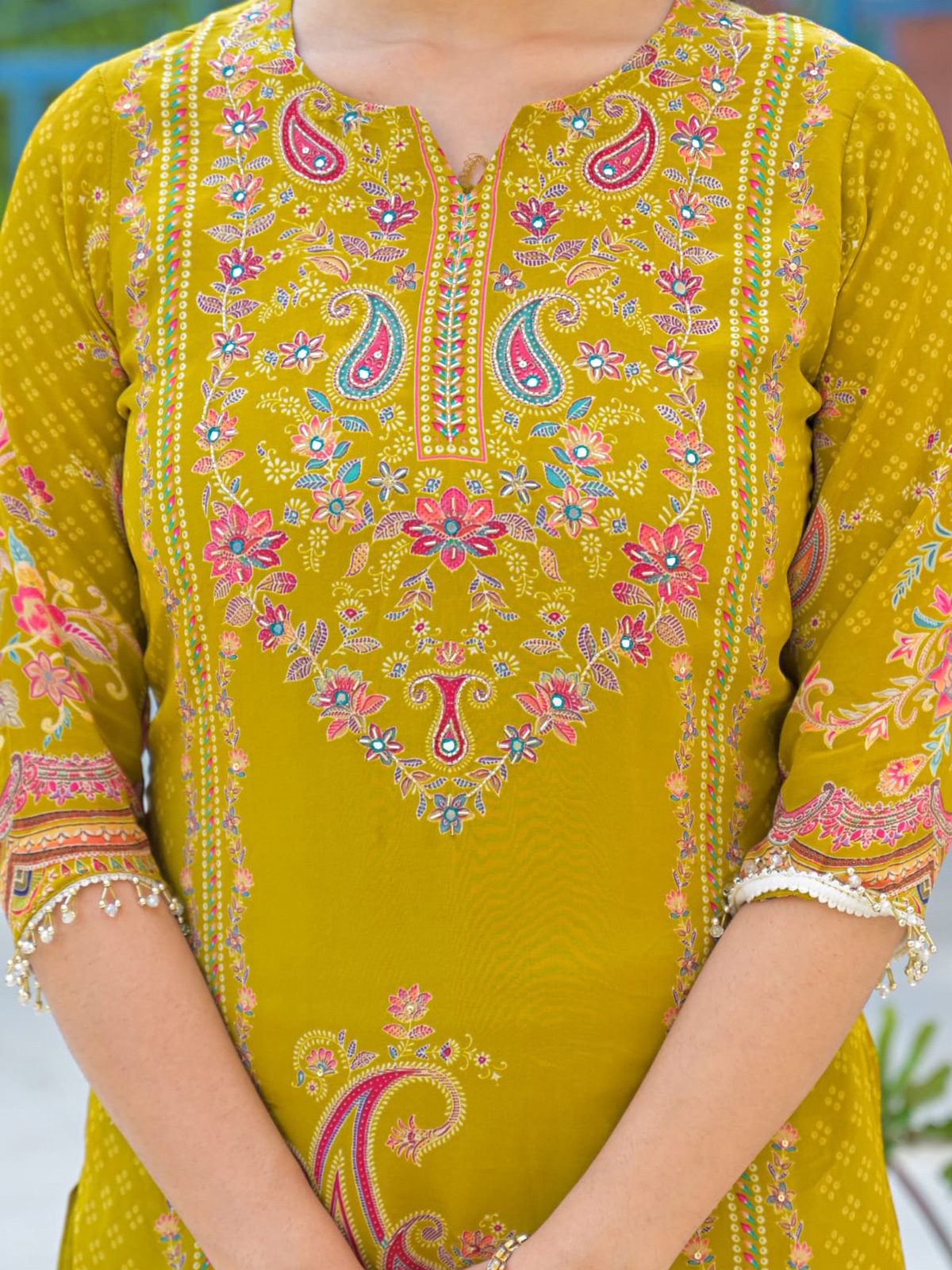 Earthy olive silk kurti exudes quiet poise, its printed surface enriched with sequins, cutdana, and beads sparkling like drops of light. Designed with quarter sleeves, and paired with pant and a delicate dupatta, it becomes a graceful festive ensemble crafted for cultural occasions and intimate celebrations.