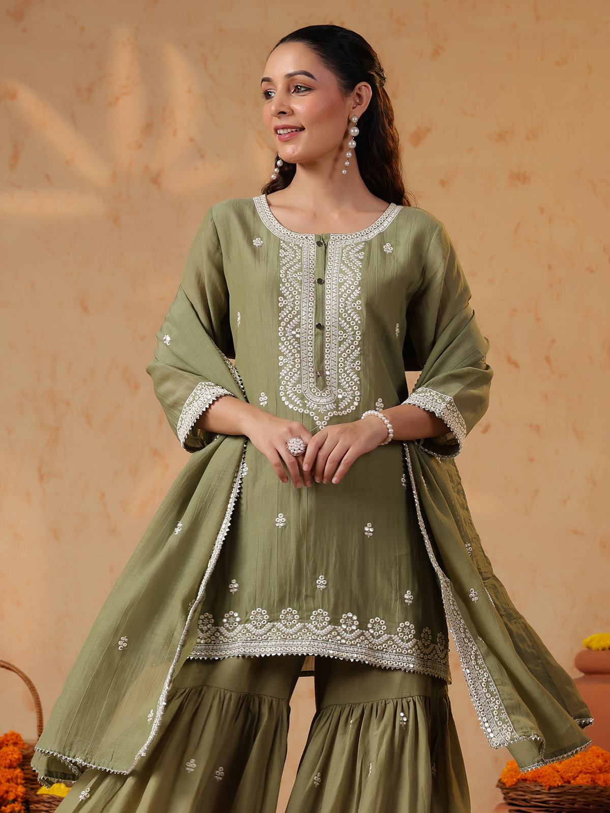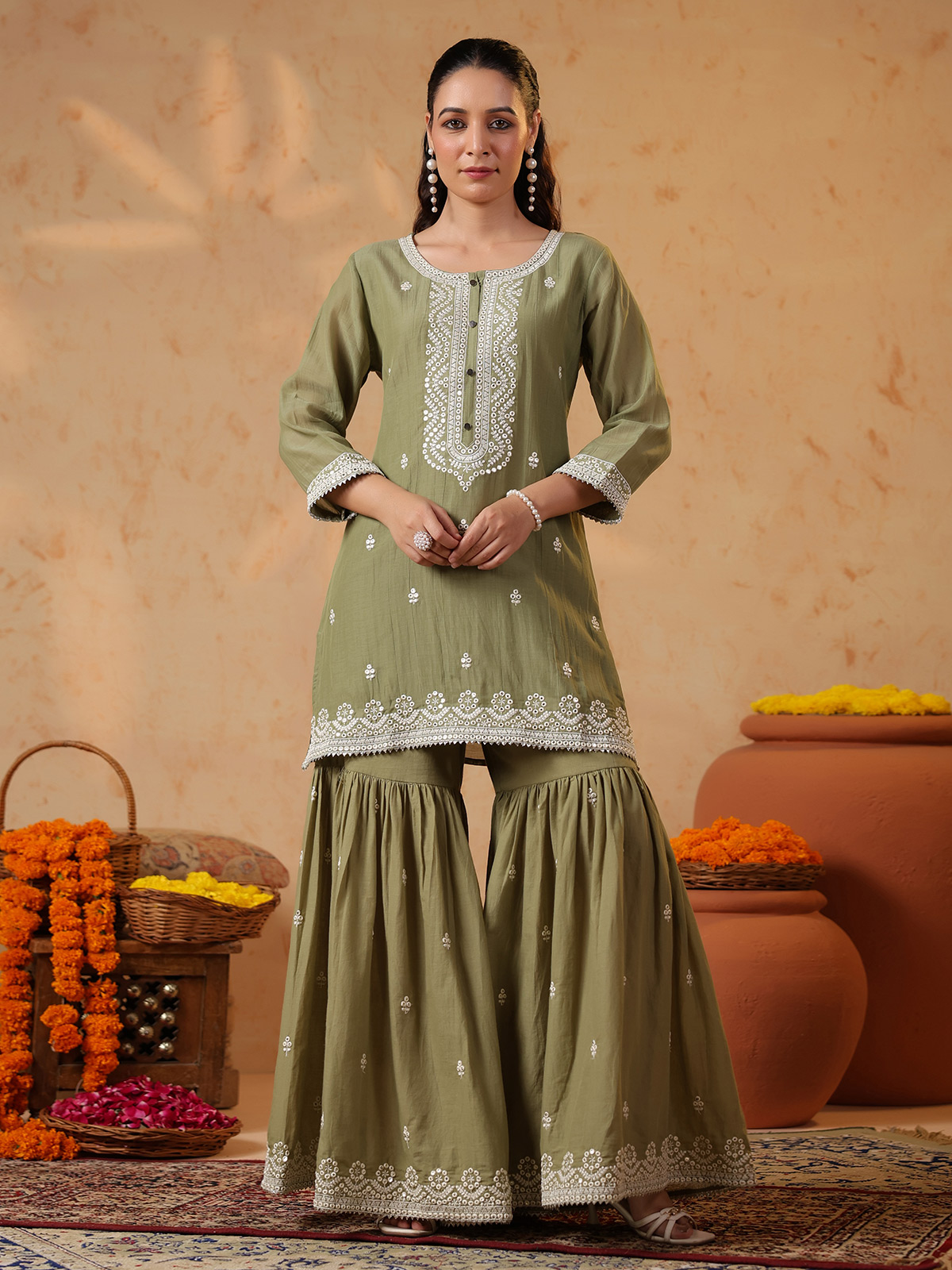 Olive Radiance Embroidered Silk Pakistani Sharara Set