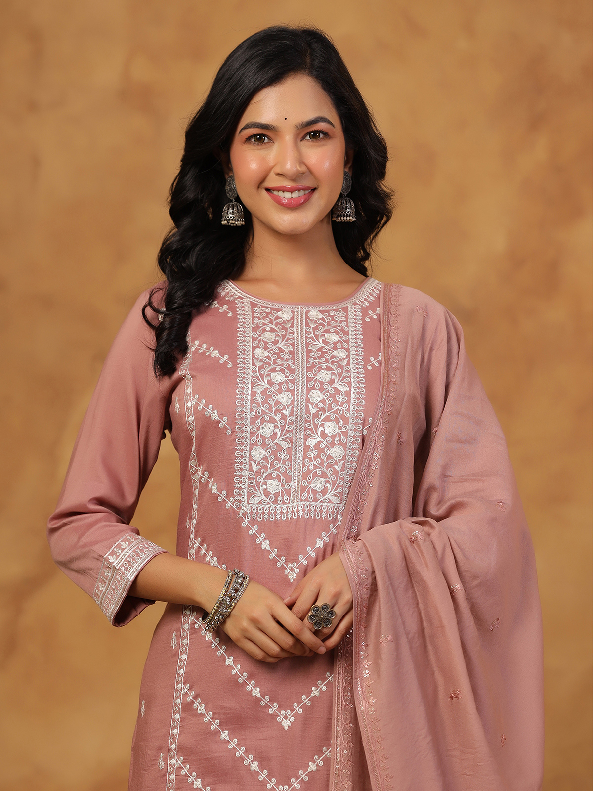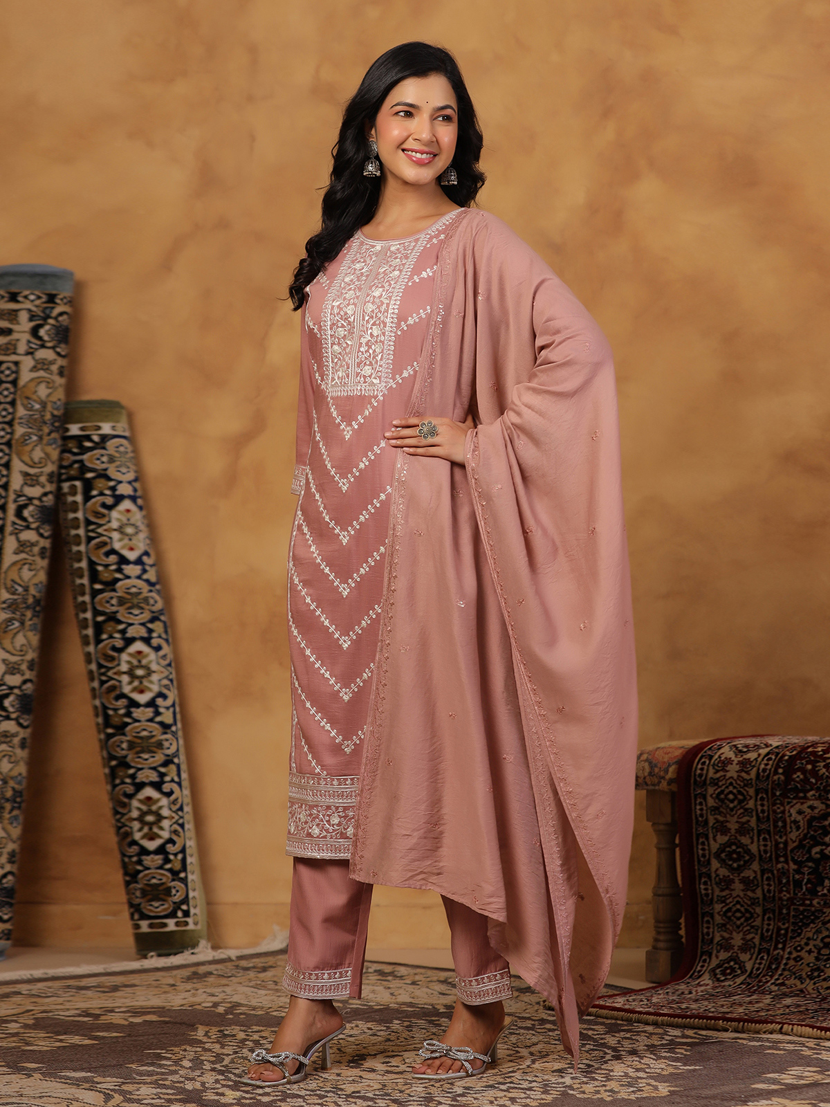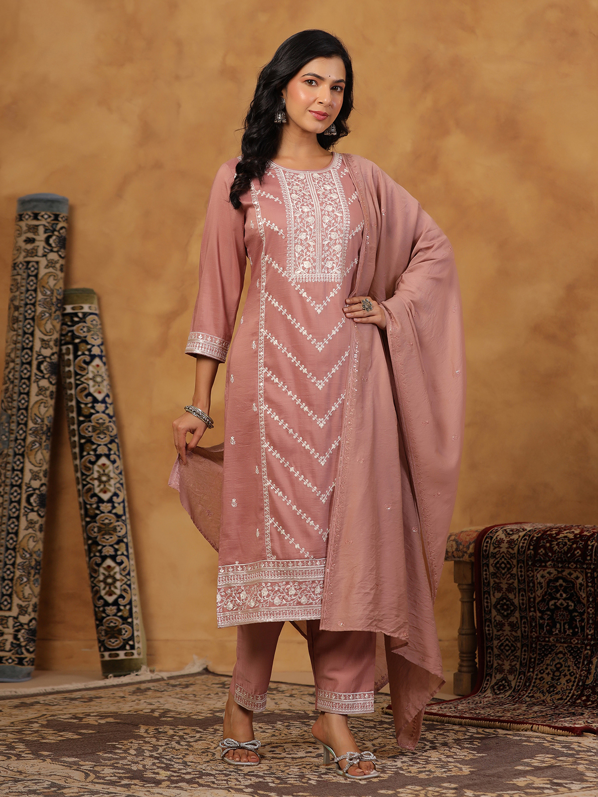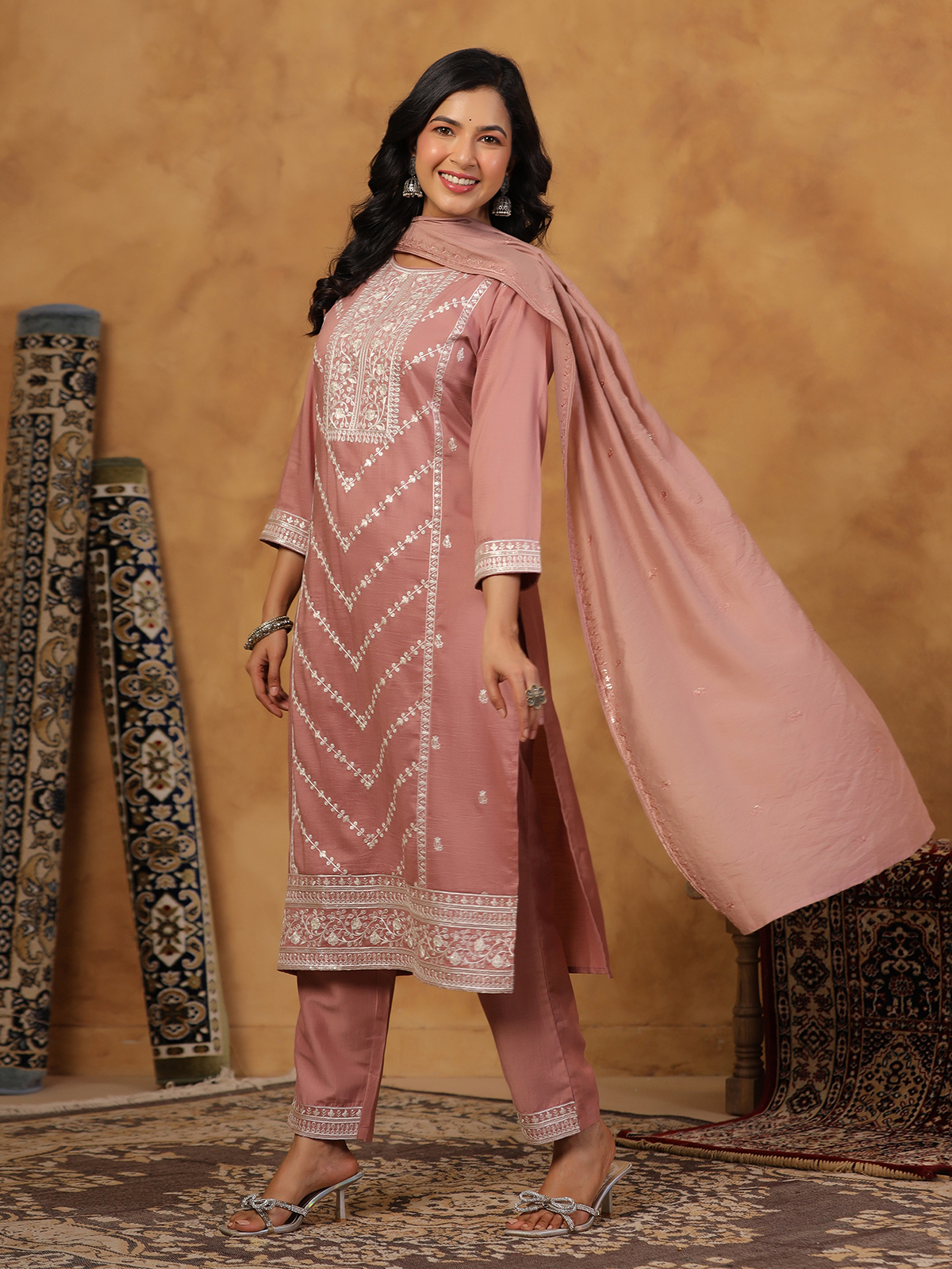 Designed to reflect understated beauty and classic elegance, this soft onion pink silk kurti set flatters effortlessly. Featuring a round neckline and quarter sleeves, it is enhanced with refined embroidery and delicate sequin detailing. Perfect for festive gatherings, the set is paired with a stylish pant and a dupatta for a complete ethnic look.