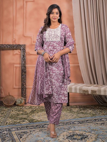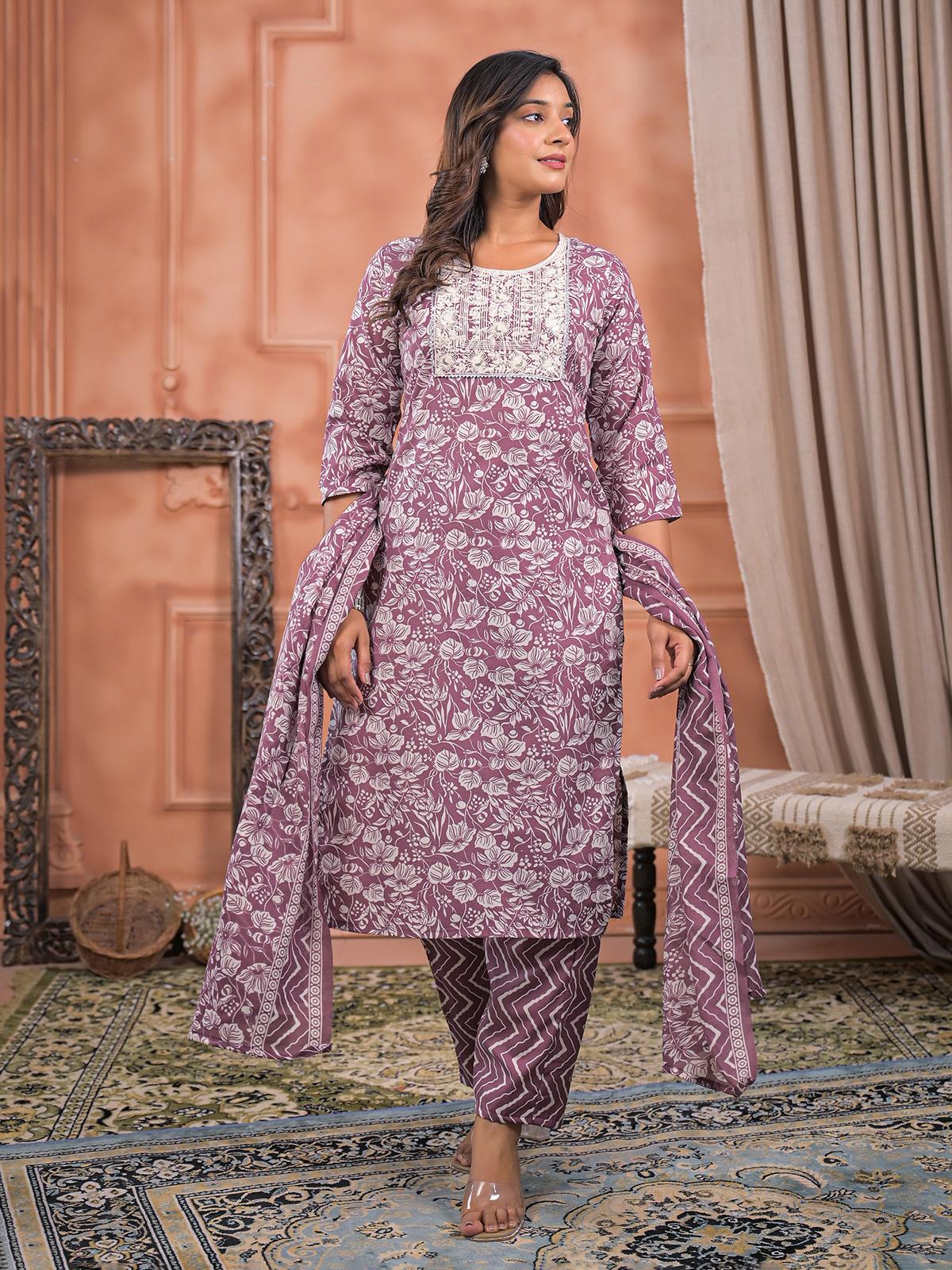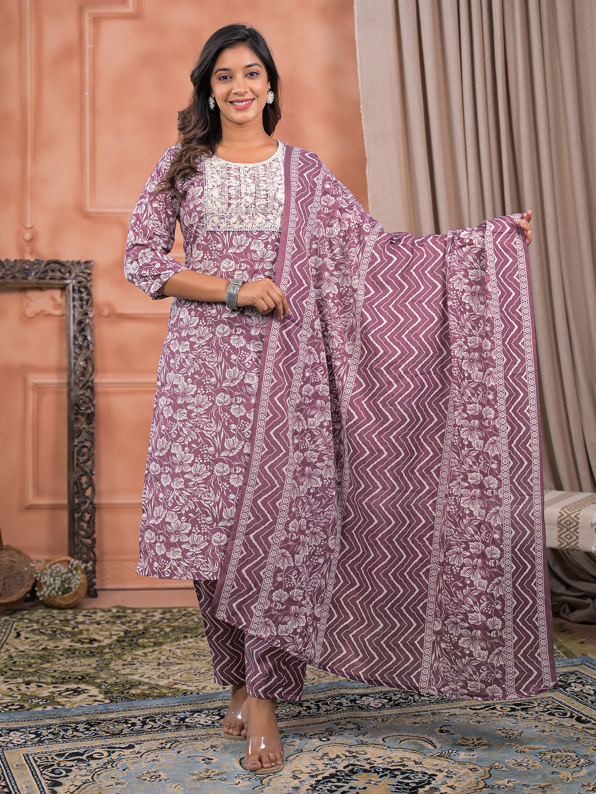 Thoughtfully created to enhance feminine charm, this soft onion pink cotton silk kurti set reflects subtle festive appeal. Styled with a round neckline and quarter sleeves, the kurti is adorned with fine thread and sequins work layered over gentle prints, making it perfect for festive and casual wear, completed with a comfortable pant and a complementing printed dupatta.