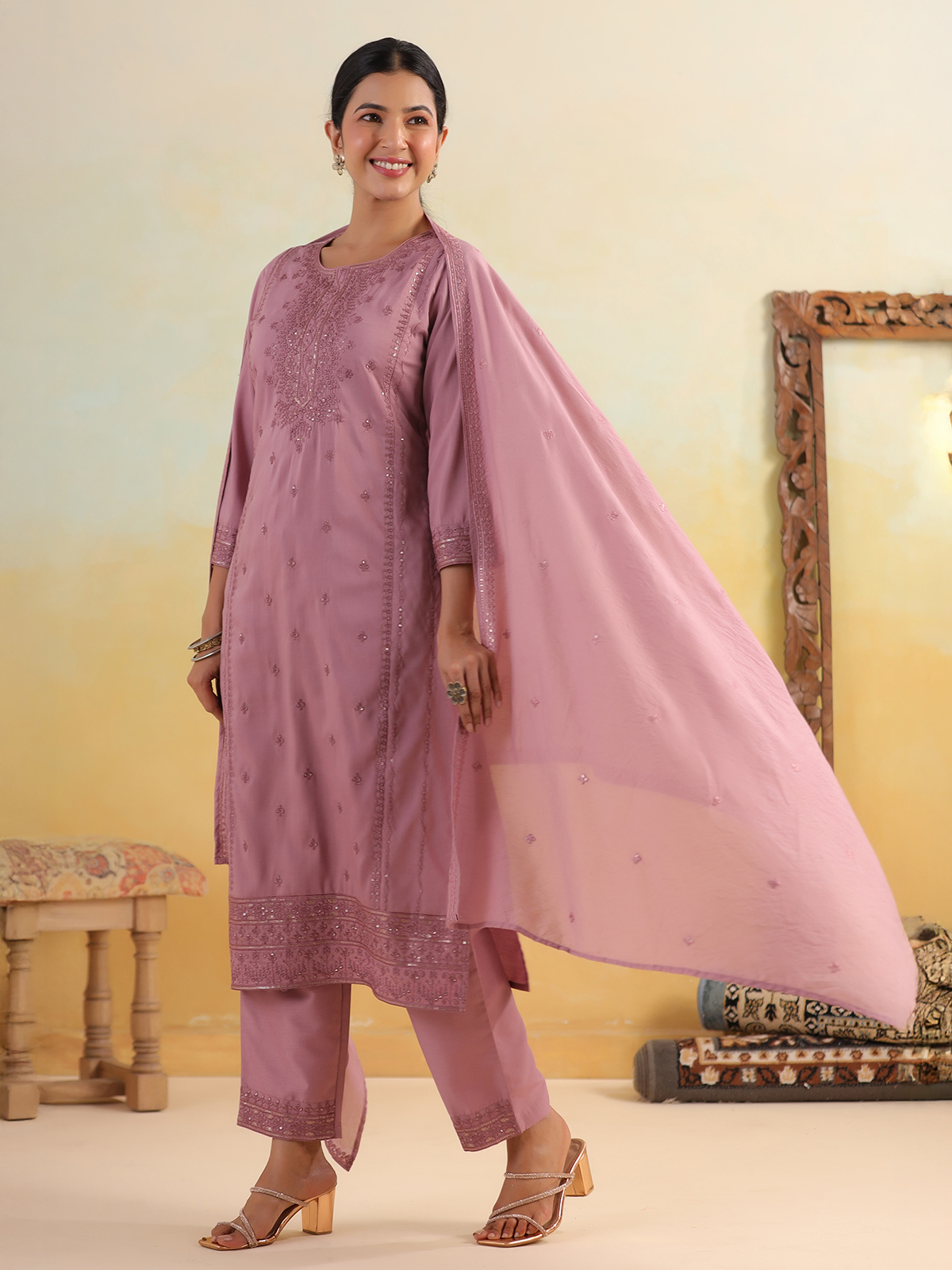 Soft and elegant, this onion pink silk kurti set is enhanced with delicate embroidery and sequin work. Styled with a dupatta and pants, the round neckline and quarter sleeves offer a balanced festive look with subtle color and traditional sophistication.