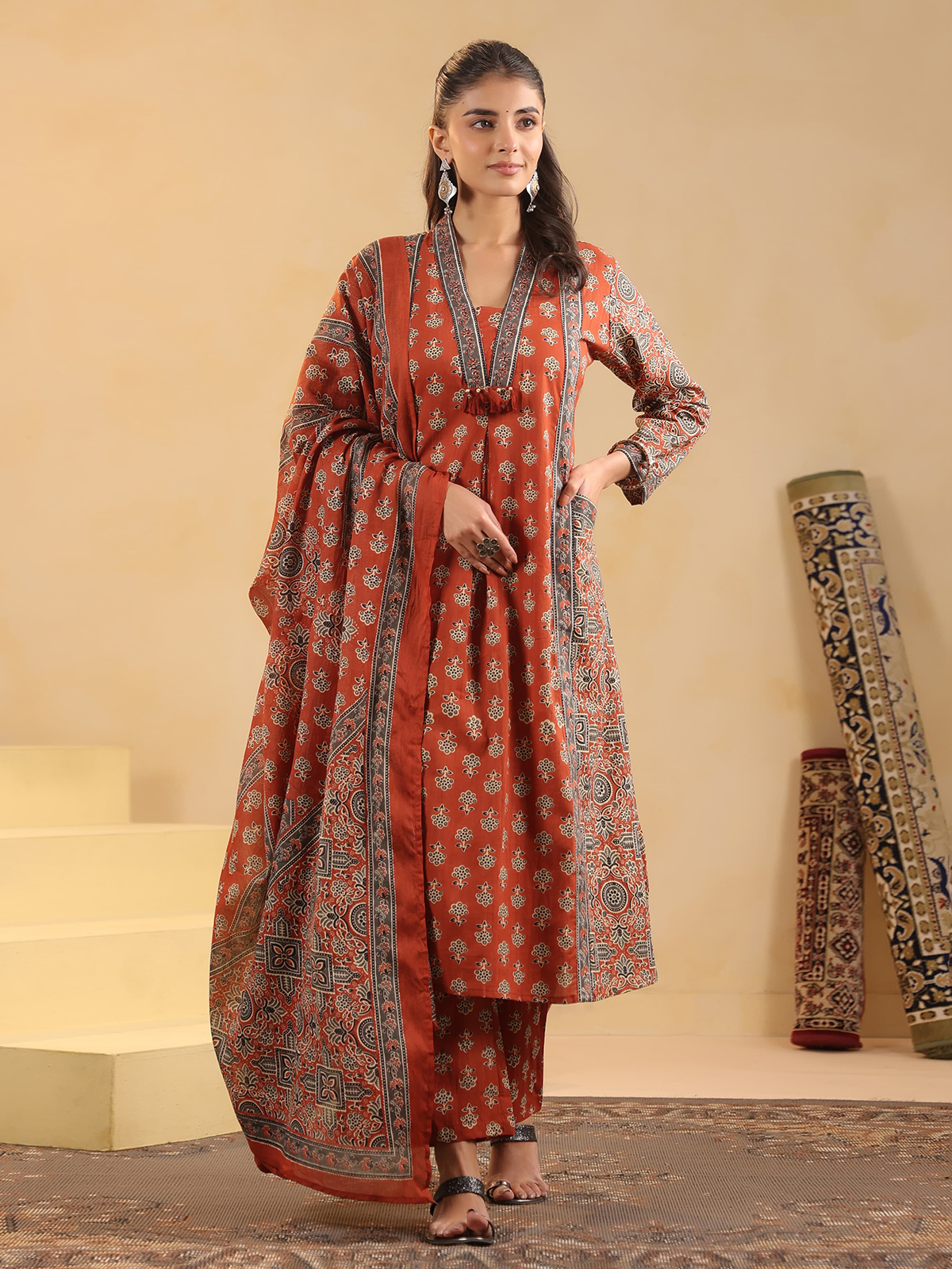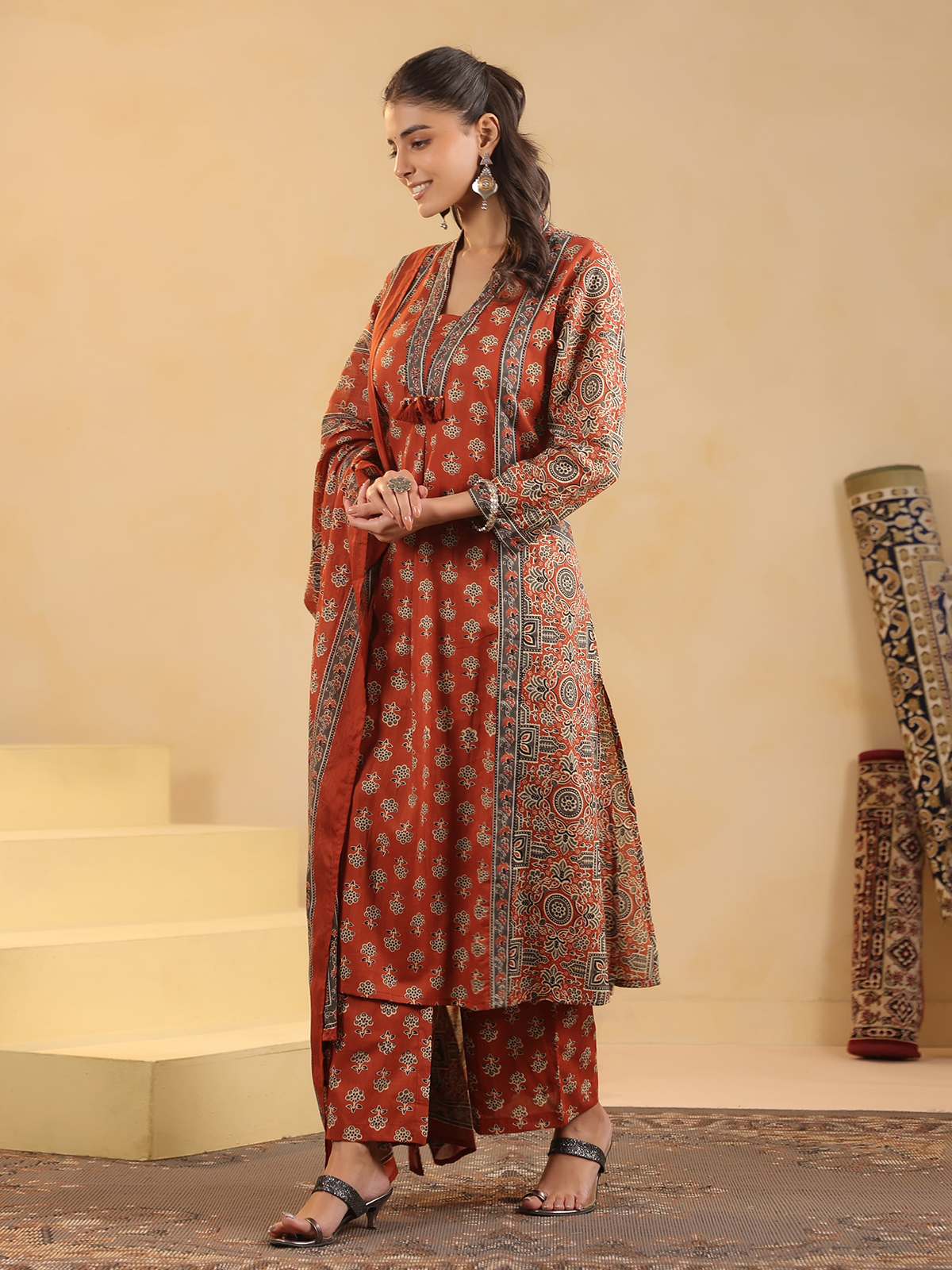 Orange Cotton Silk Ajrakh Artisan Kurti Set