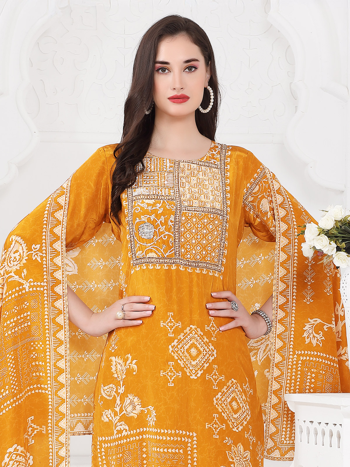 A radiant orange silk kurti set glows with festive vibrance and timeless grace. Printed accents come alive beneath the sparkle of cutdana and sequins along its round neckline and quarter sleeves. Paired with smart pants and a light dupatta, the ensemble blends joyful warmth with refined artistry, ideal for celebratory gatherings.