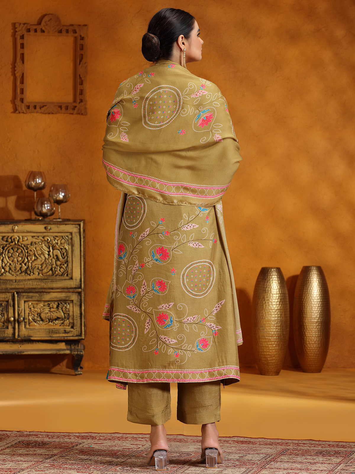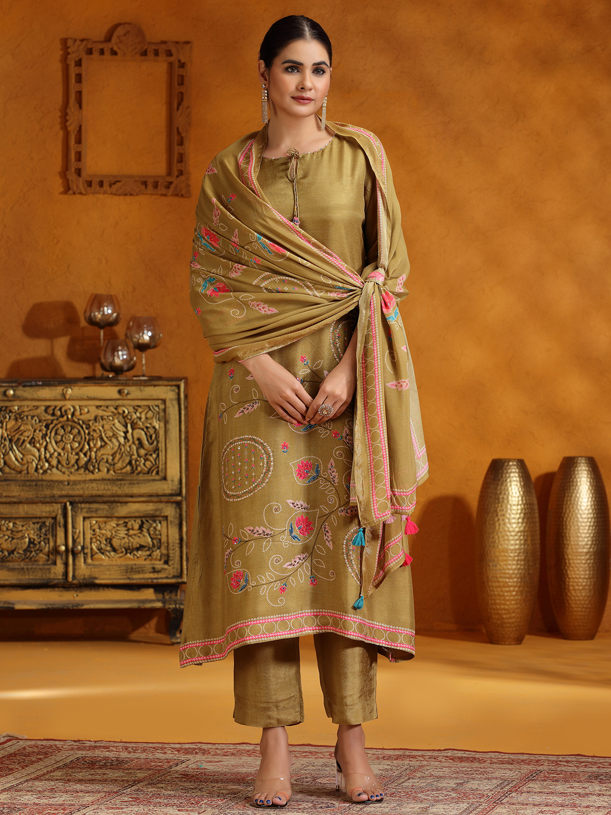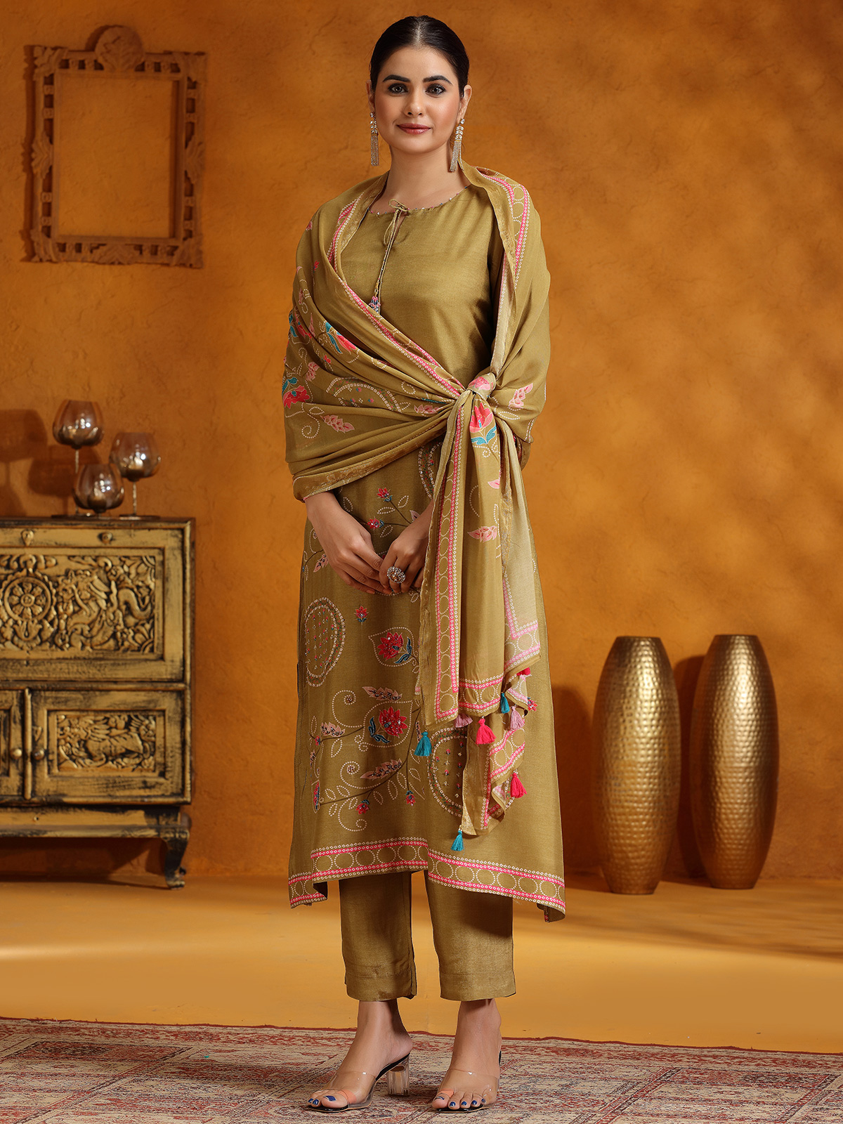 Crafted from premium silk, this pastel olive kurti set is beautifully embellished with delicate beads and sequins work, adding a subtle sparkle to your look. Featuring a graceful keyhole neck and quarter sleeves, it offers both comfort and elegance, making it perfect for casual occasions. The set comes complete with a dupatta, completing your ensemble with effortless style.