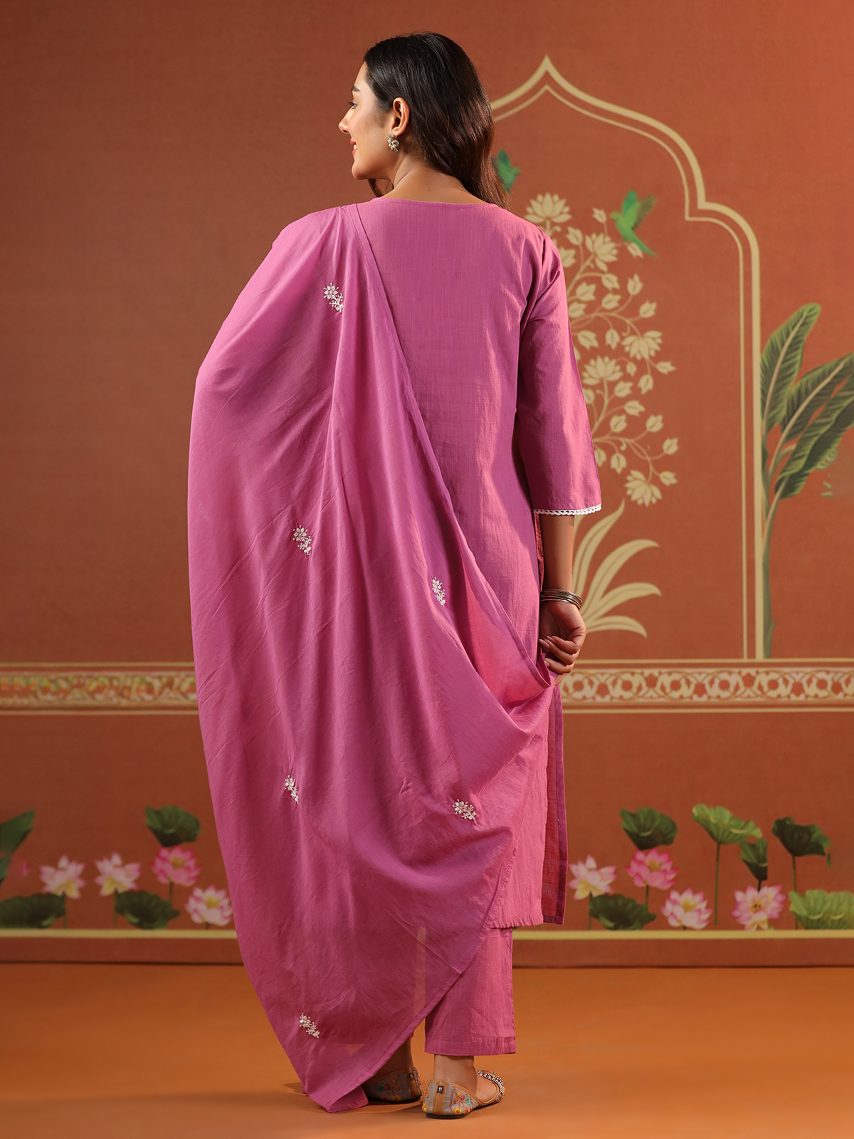Showcasing understated festive sophistication, this pastel purple cotton kurti set reflects refined beauty. Styled with a round neckline and quarter sleeves, it features delicate thread work that adds subtle texture and detail. Perfect for festival occasions, it is paired with comfortable pant and a coordinated dupatta to complete the ensemble gracefully.