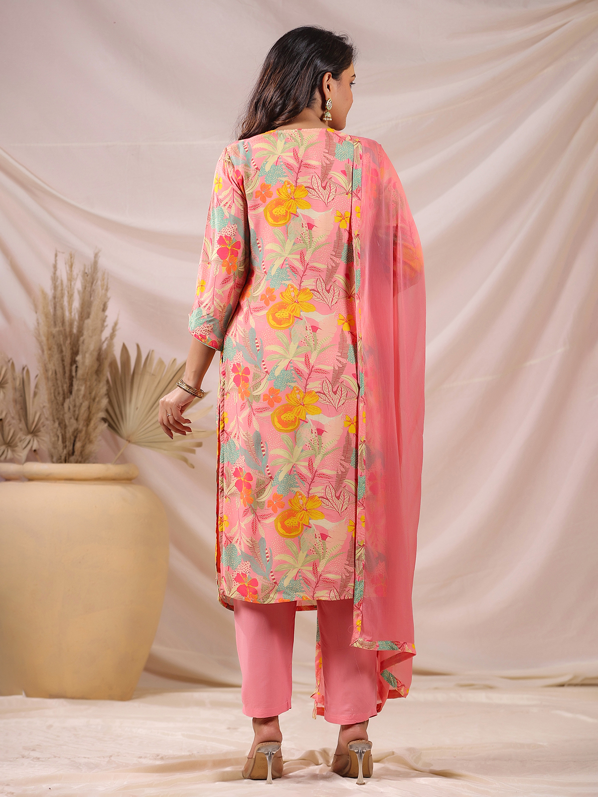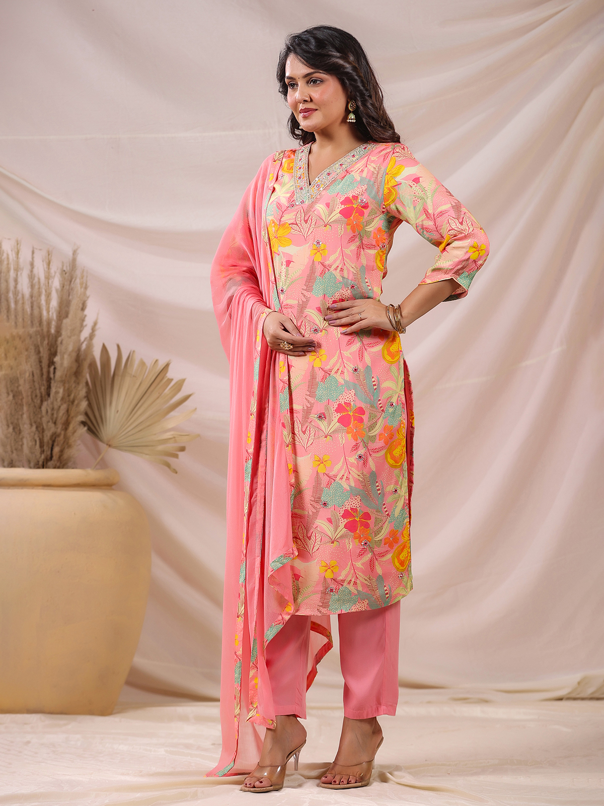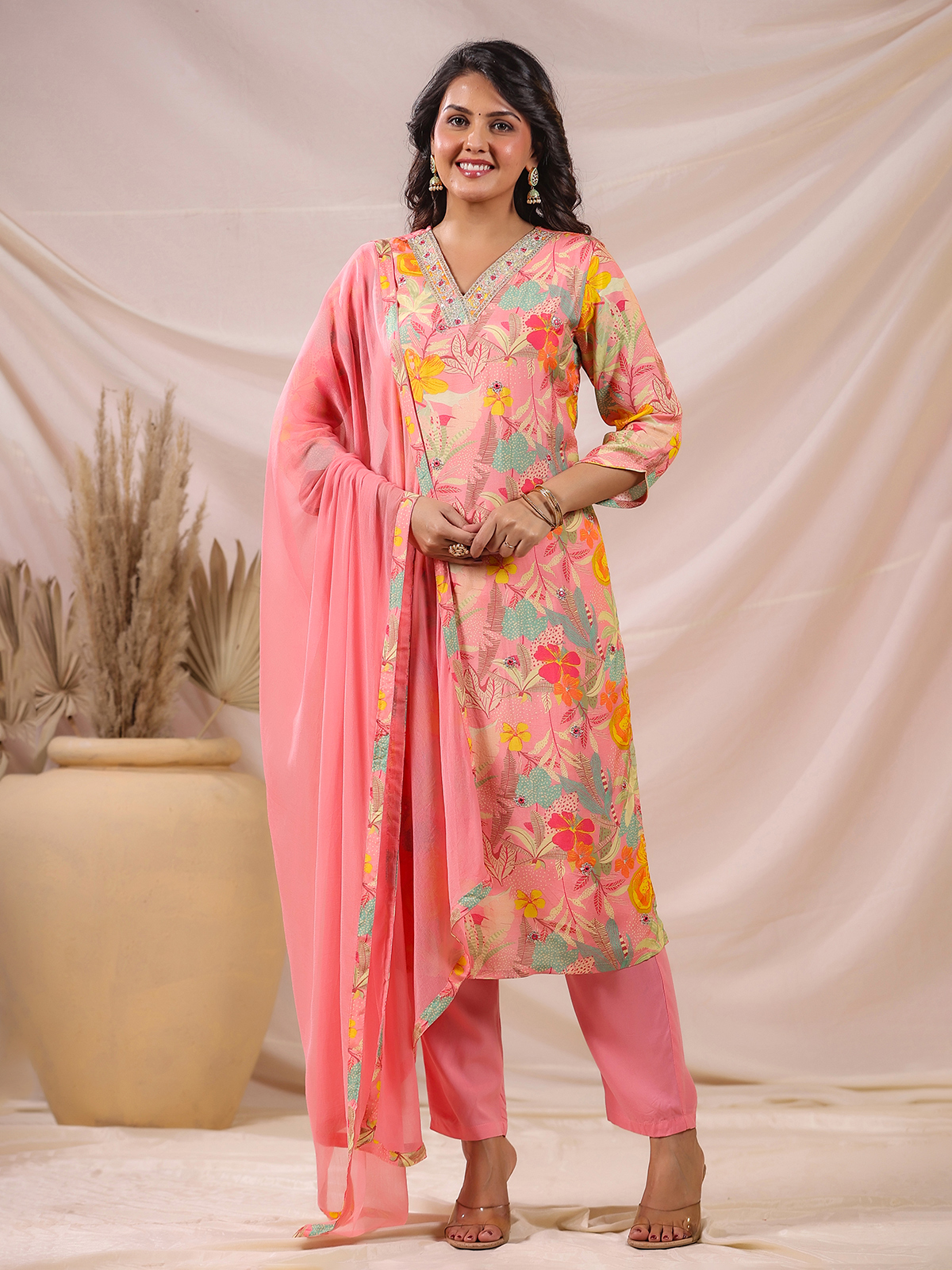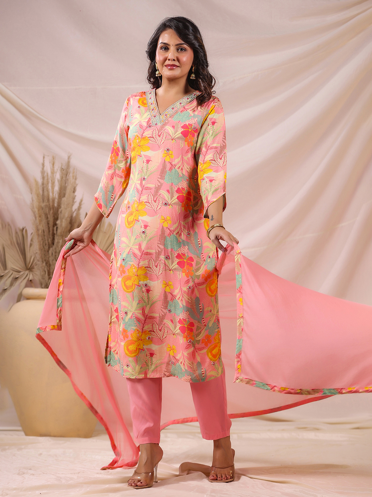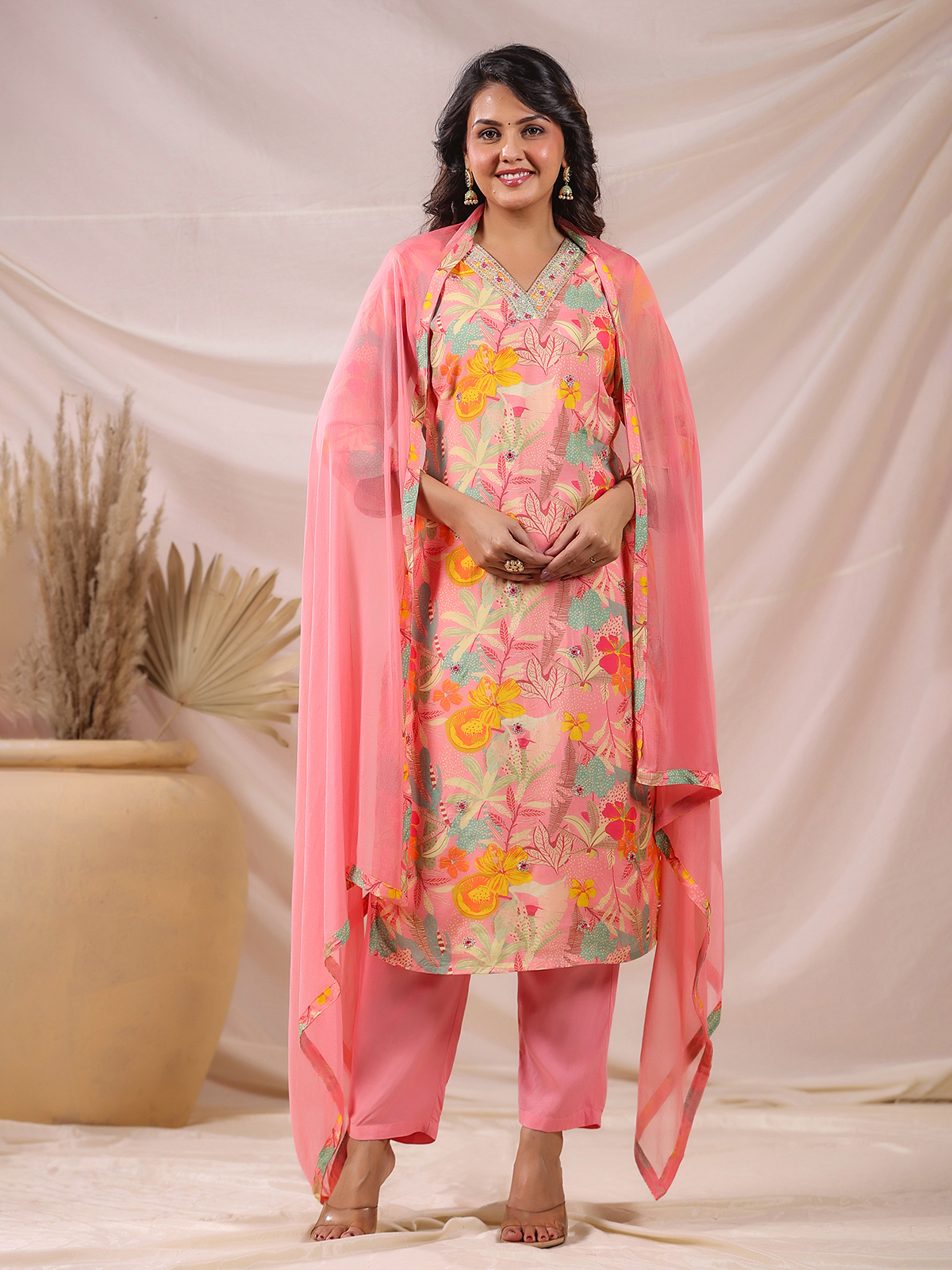 Chic and subtle, this light pink cotton silk kurti set has aabla, sequins, resham, and embroidery work. The printed straight-cut kurti with V-neck and quarter sleeves is paired with matching pant and dupatta—great for festive lunches or family events.