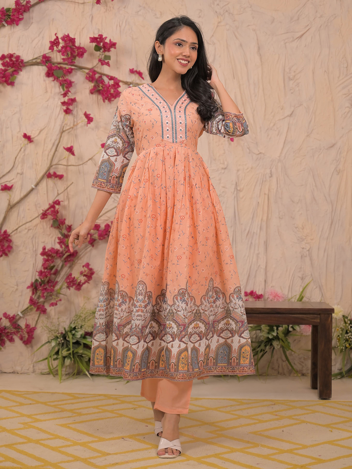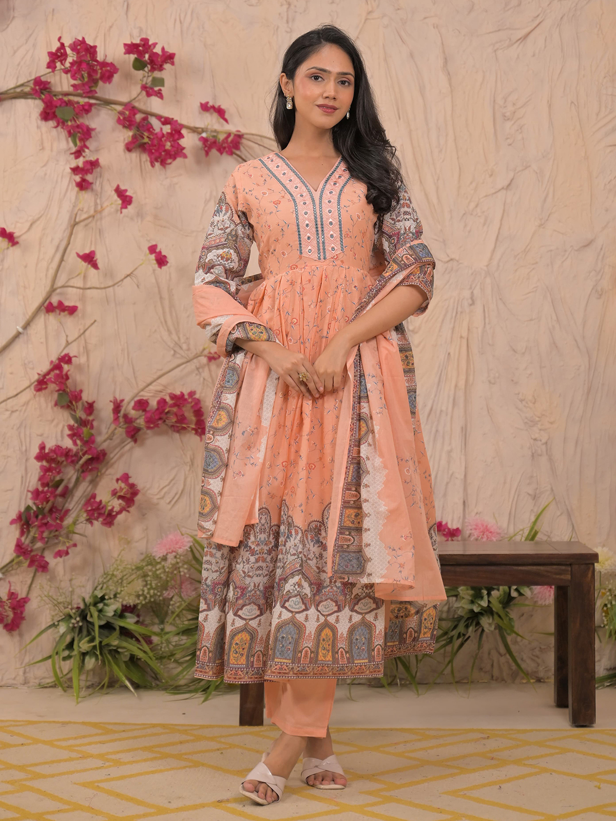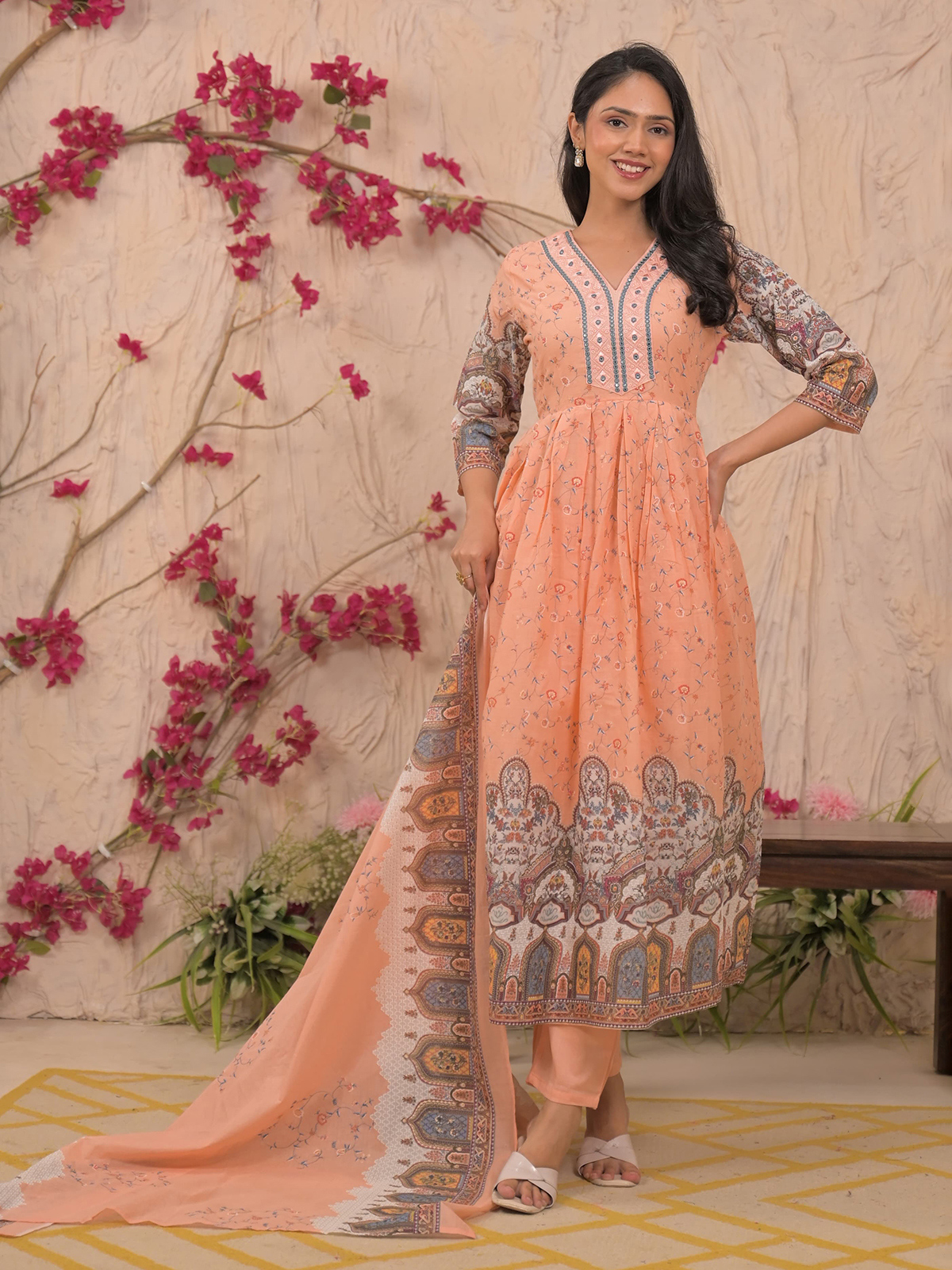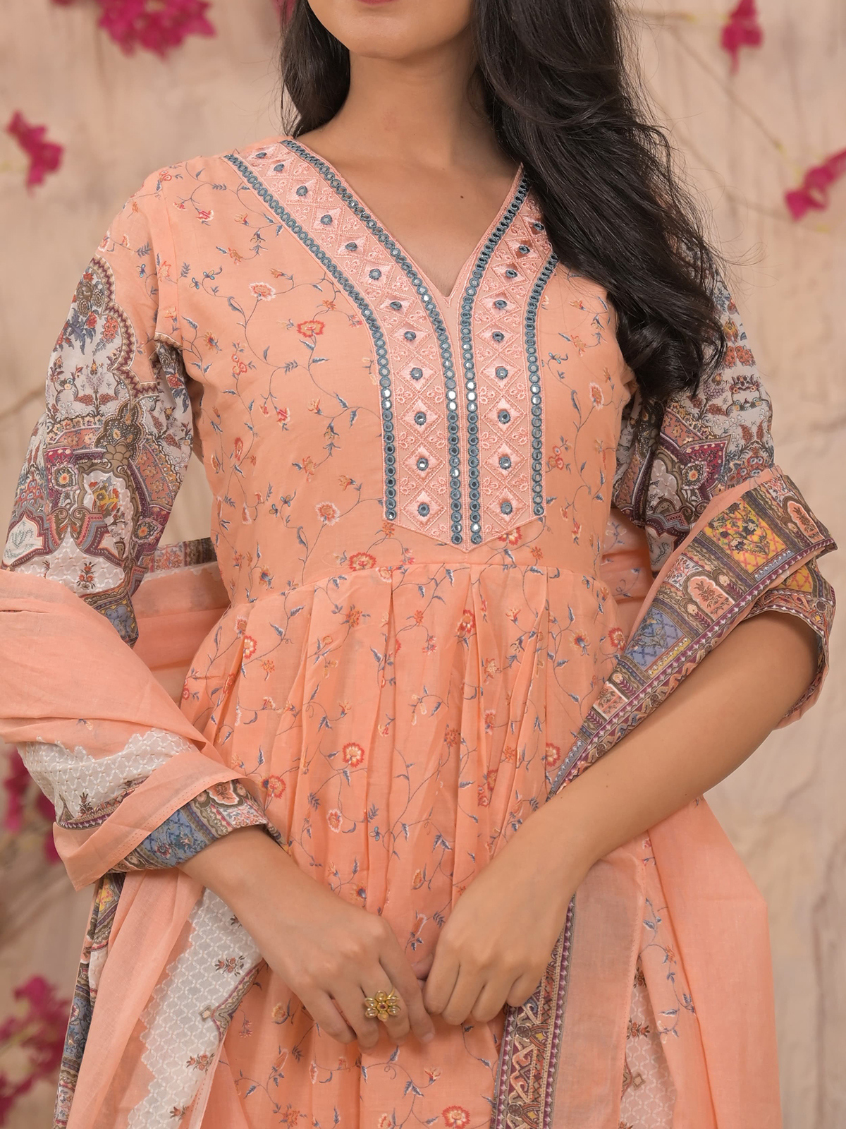 Crafted in peach-hued mulmul cotton, this kurti set features aabla embellishments, thread detailing, and embroidery. The V neckline and quarter sleeves enhance its feminine grace. Includes a matching printed dupatta and pants, making it ideal for daytime festive wear.