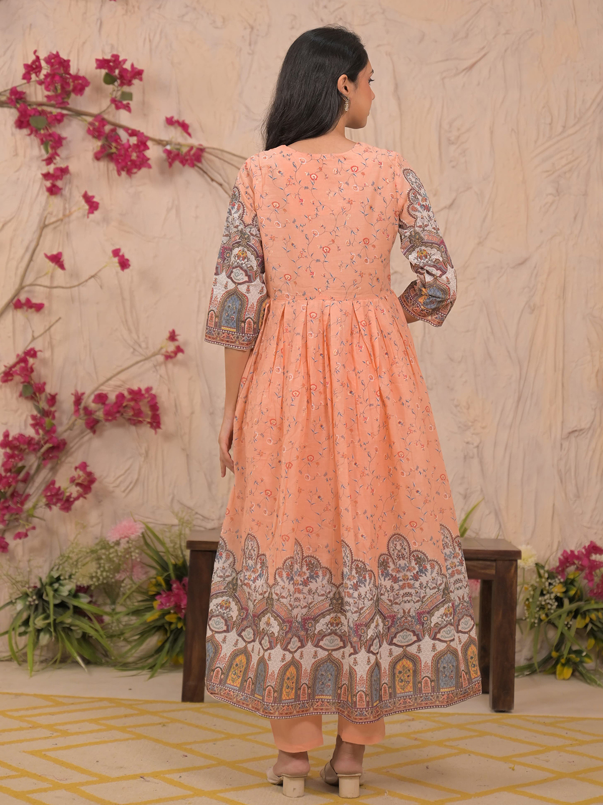 Peach Printed Mulmul Cotton Kurti Pant Set