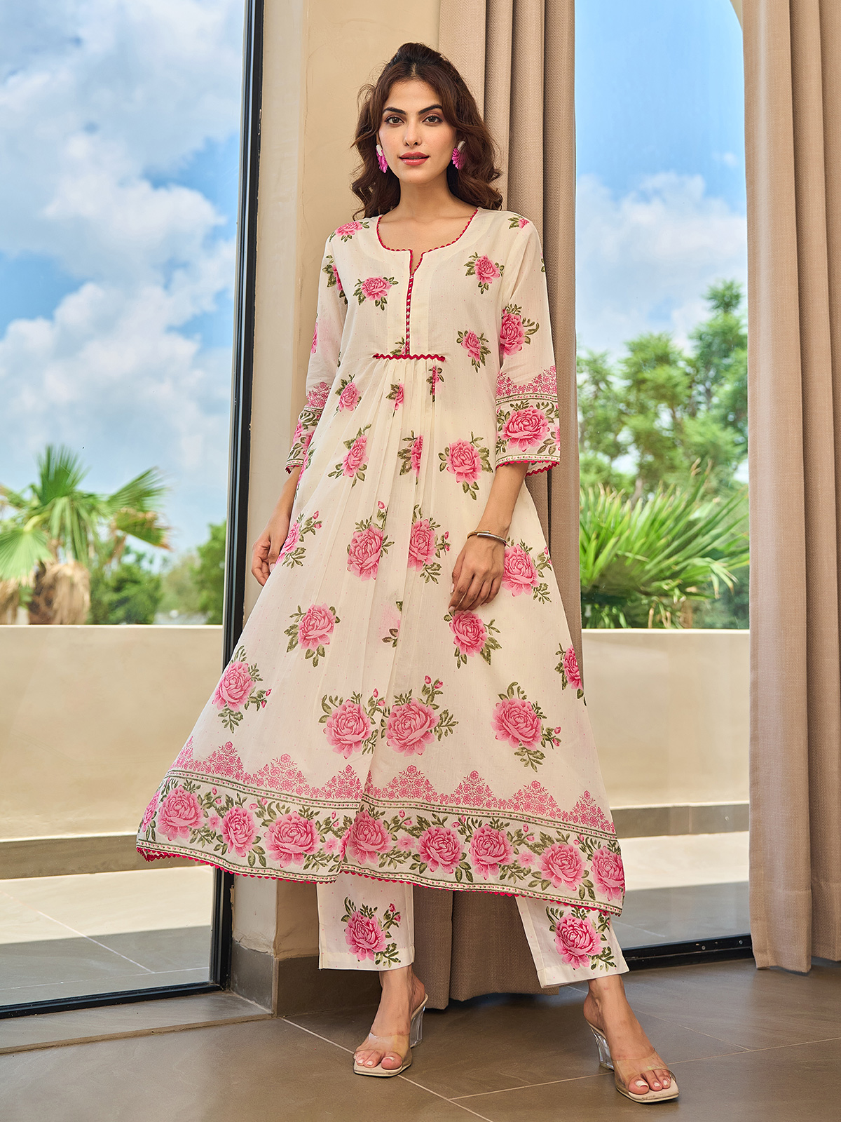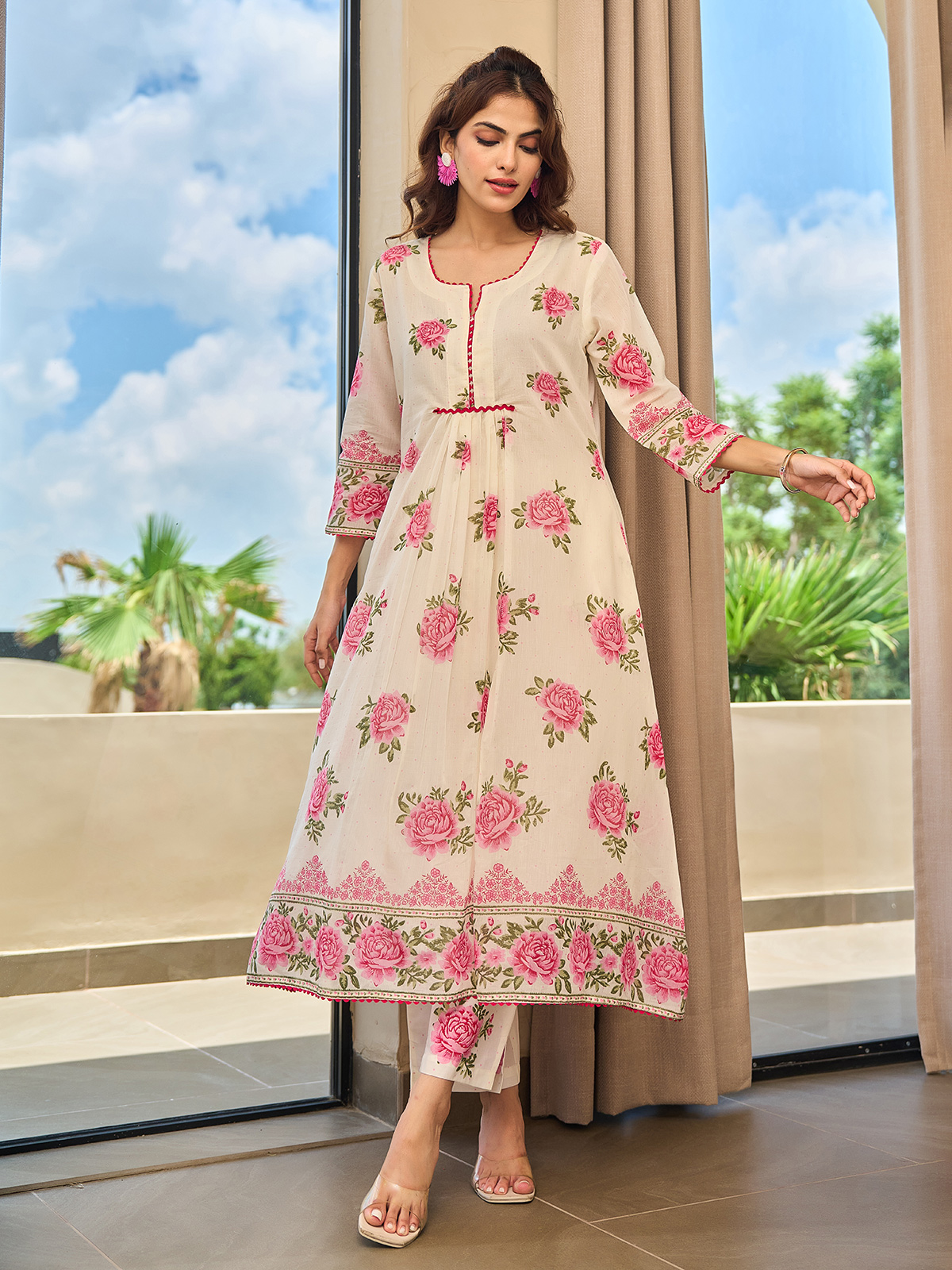 Step into festive grace with this pink and cream cotton silk kurti set. Styled with a sweetheart neckline and quarter sleeves, it comes with a matching pant. Lightweight yet elegant, it’s perfect for family gatherings, poojas, and traditional celebrations.
