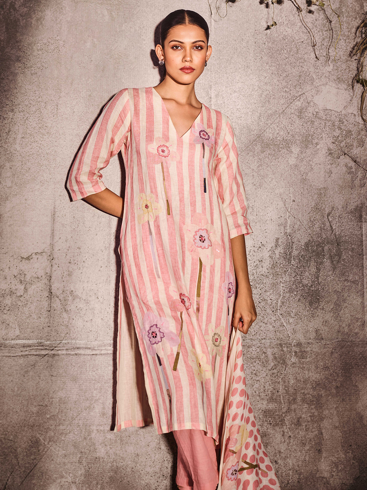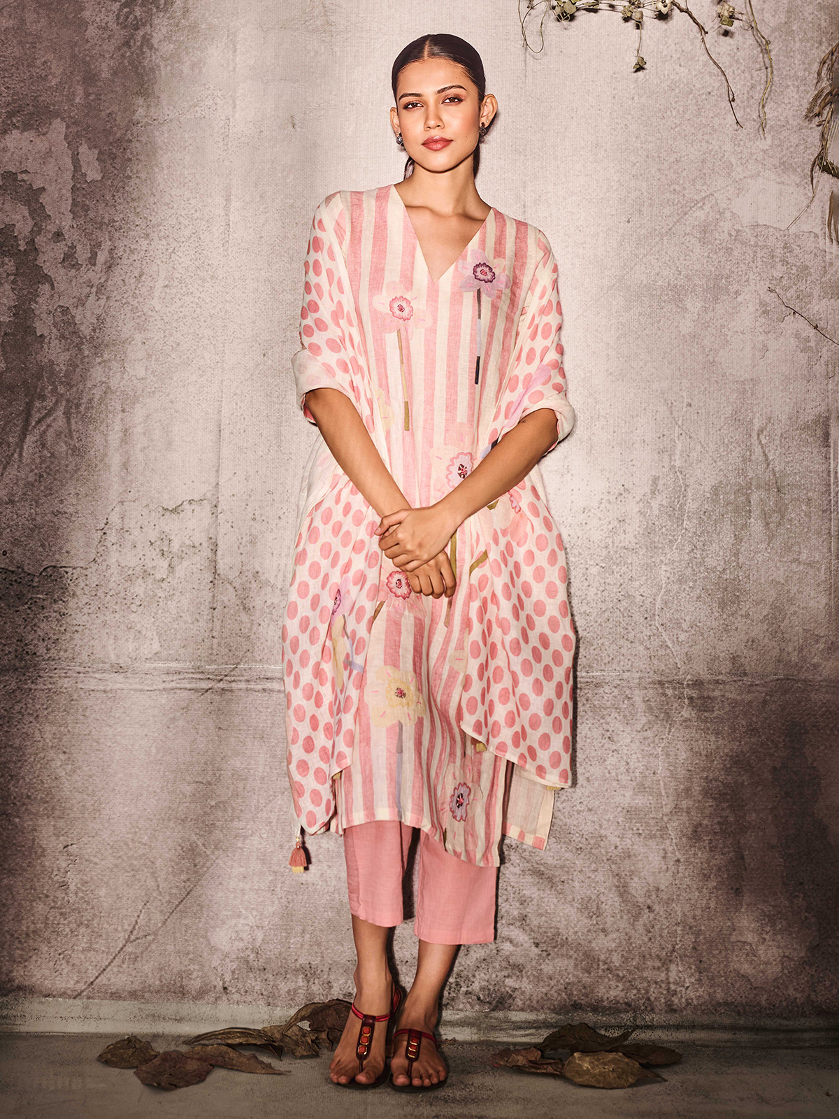 Soft pink merges with white in this printed cotton kurti set, adorned with thread, beads, and sequins that sparkle tenderly. A V-neckline and quarter sleeves heighten its subtle grace. Worn with pant and dupatta, it breathes joy and softness into every festive moment.