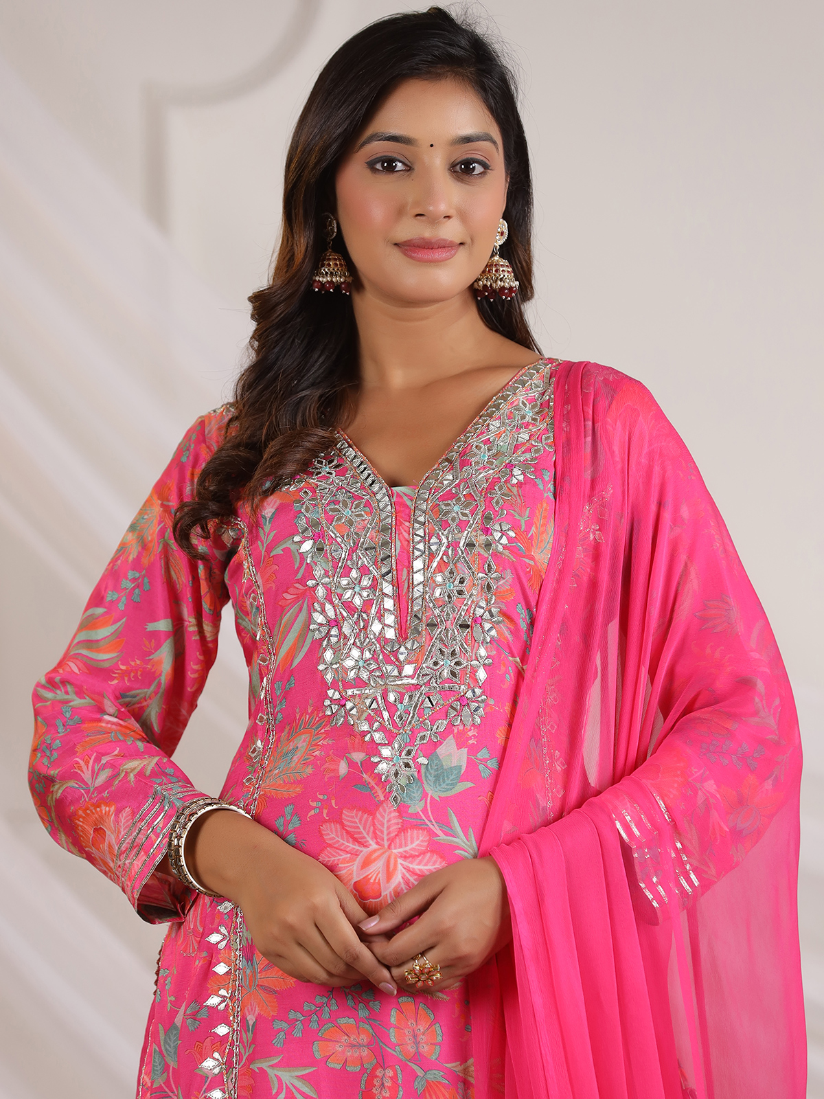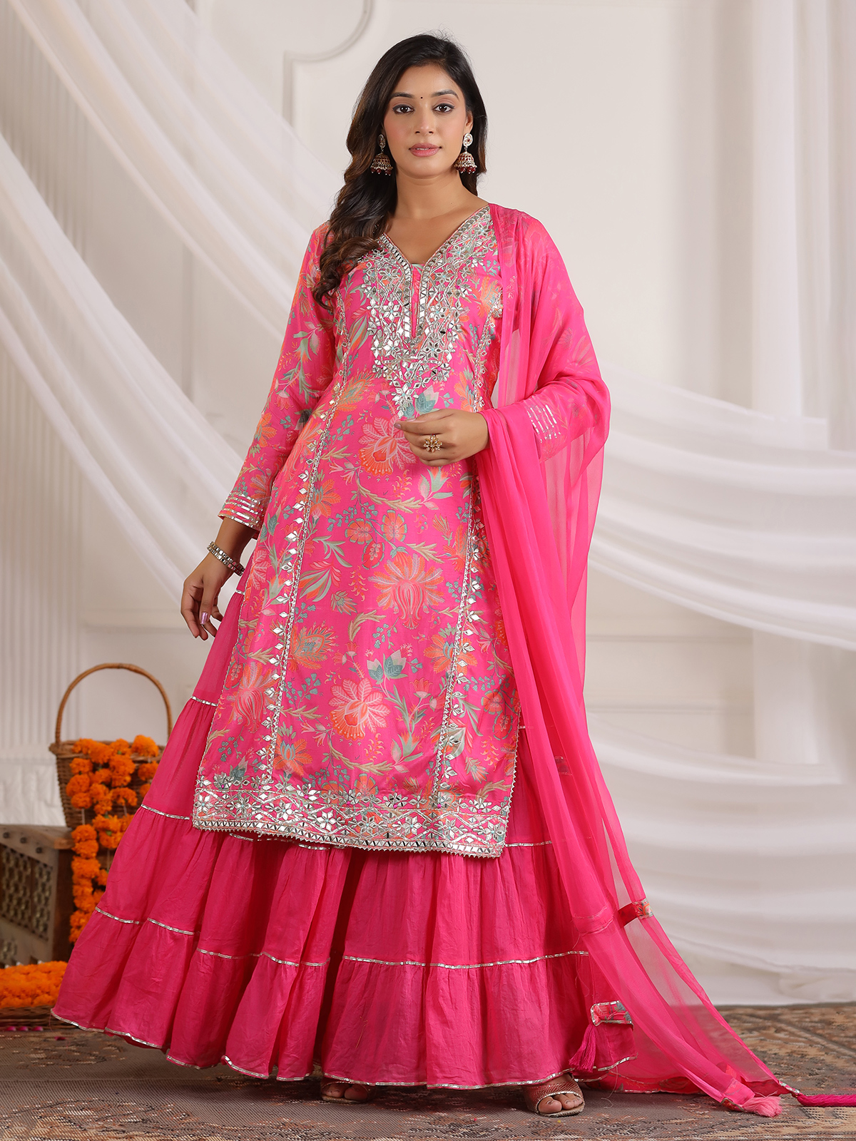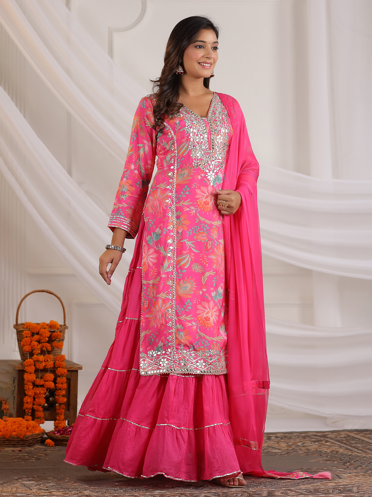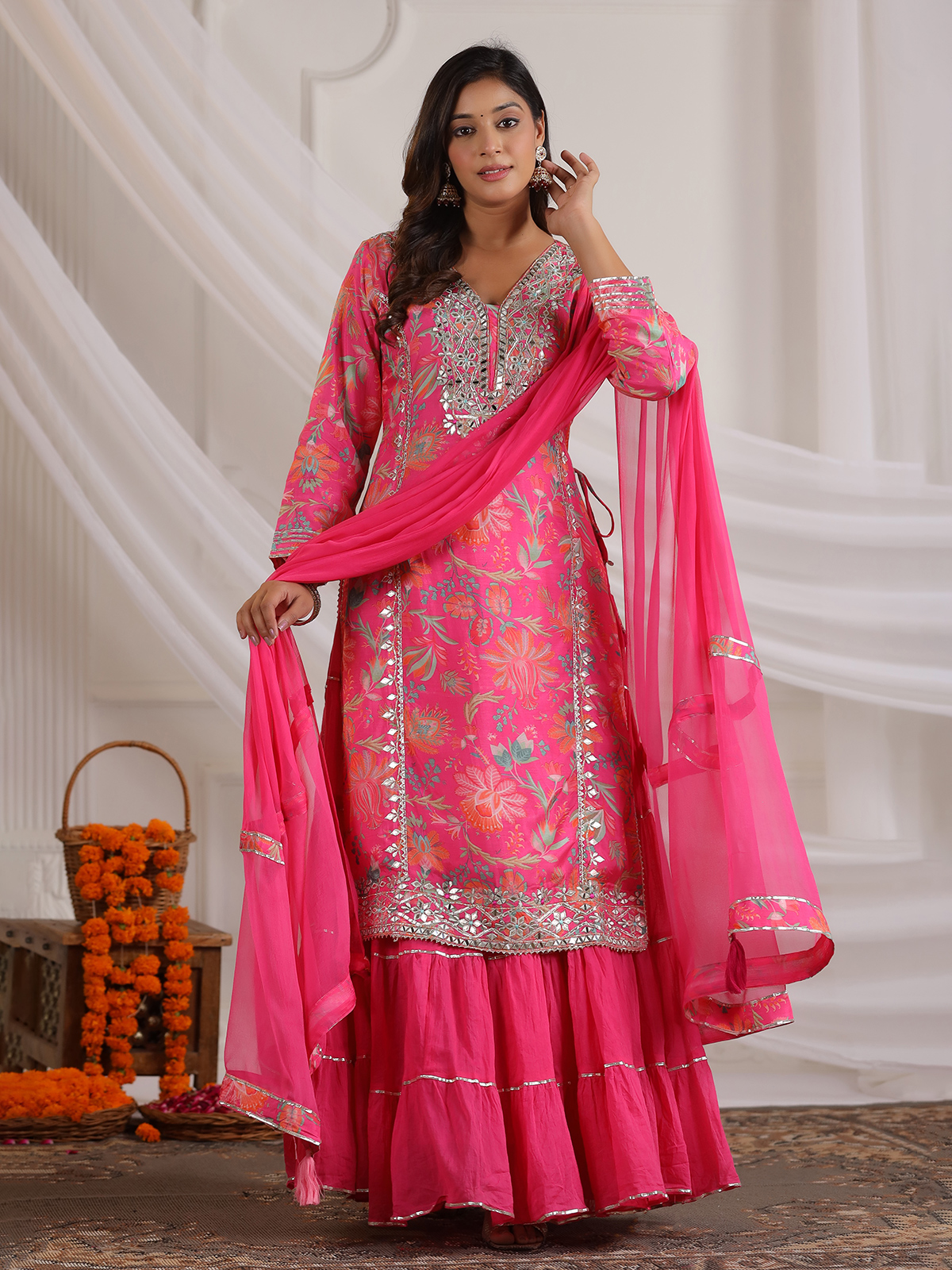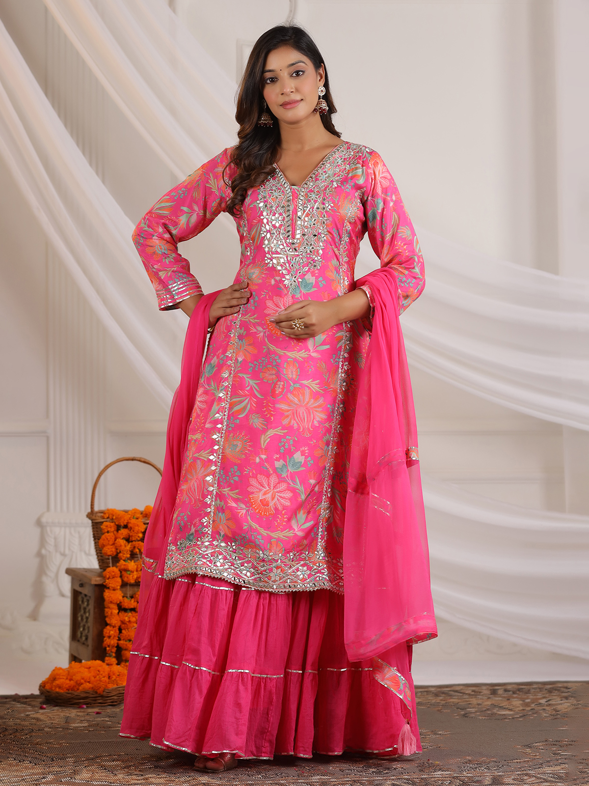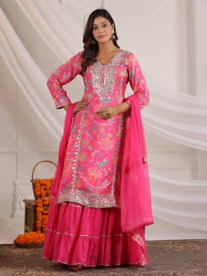 This pink cotton silk printed kurti set is accented with aabla, gota and resham detailing. Designed with a V-neckline and quarter sleeves, it is teamed with a comfortable palazzo and coordinated dupatta, making it a practical choice for festive gatherings.