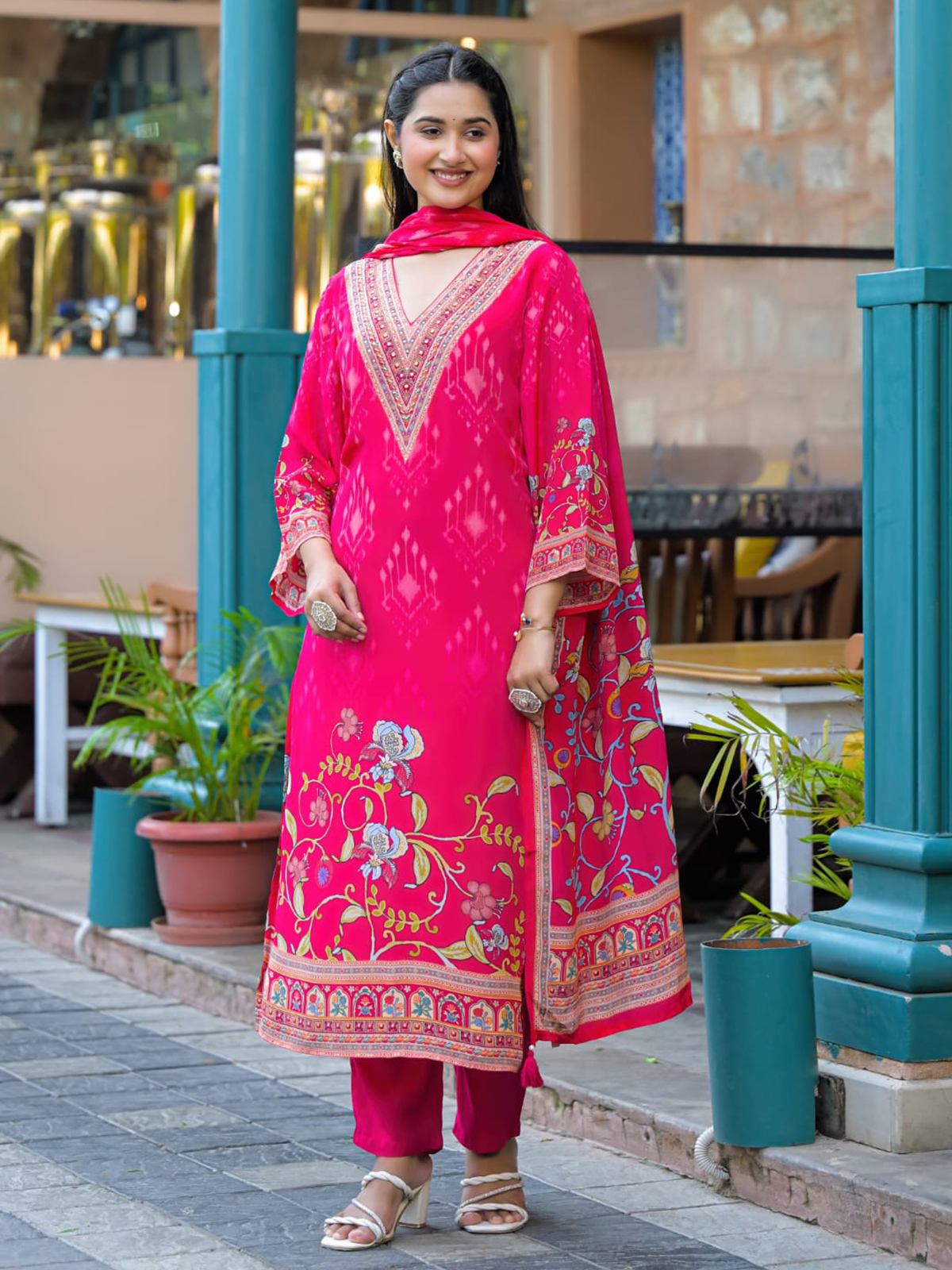 Soft pink silk embodies gentle sophistication in this festive kurti. Decorated with sparkling sequins and beads on printed patterns, it catches light with subtle flair. Featuring a V-neck and quarter sleeves, complemented with a pant and dupatta, perfect for lively festive celebrations.