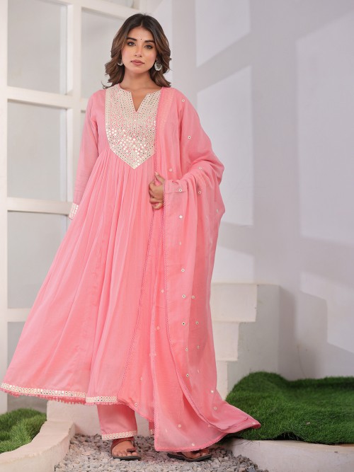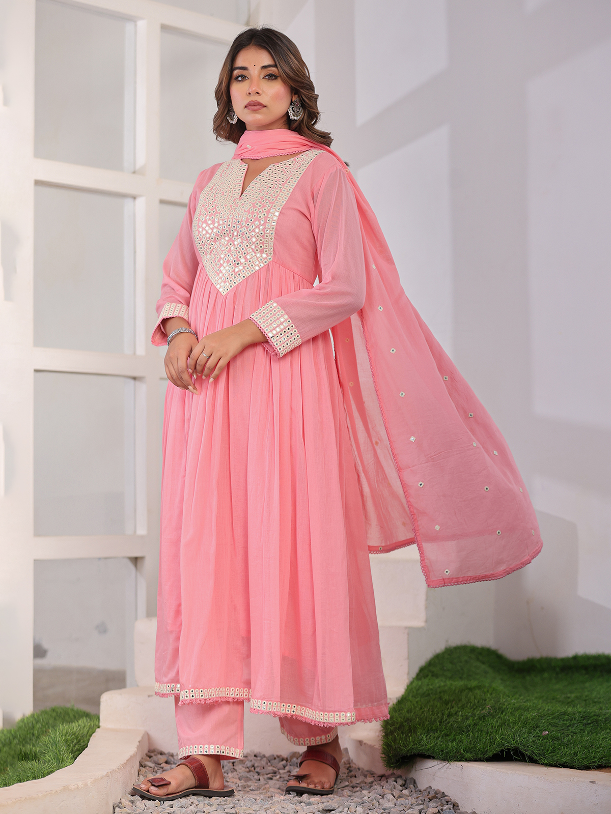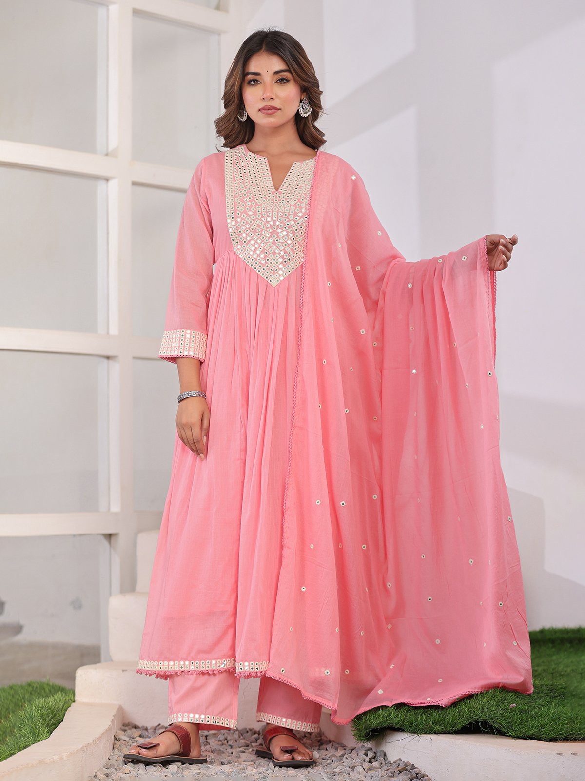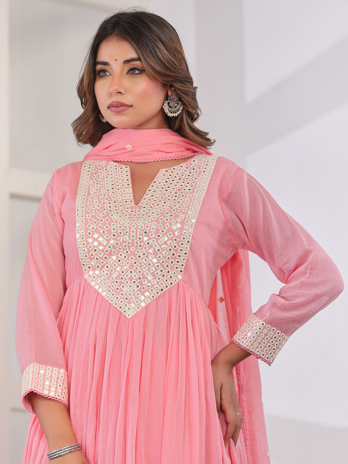 This pink cotton silk kurti set features a shimmering aabla-detailed yoke, quarter sleeves, and straight pants. Paired with a dupatta, it brings festive grace and subtle sparkle—perfect for pujas, gatherings, and family celebrations.