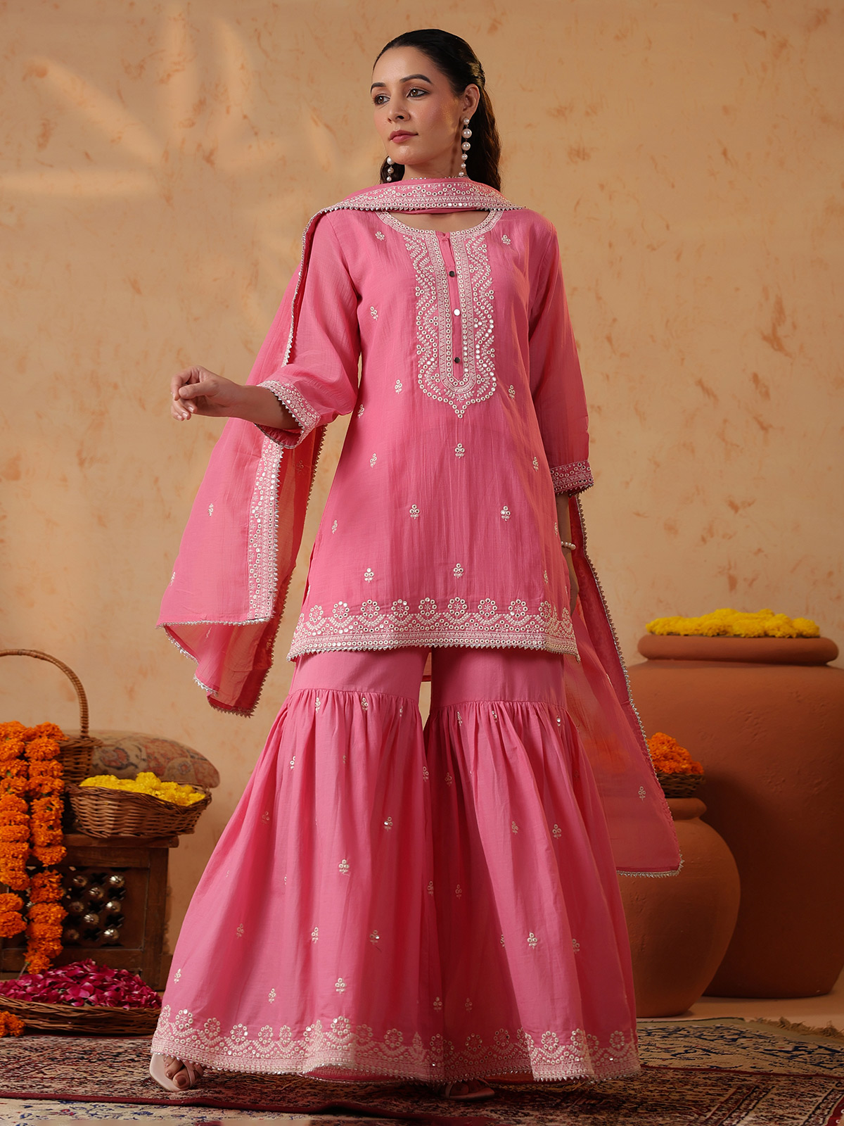 Emanate elegance in this pink silk Pakistani-style sharara set, delicately detailed with embroidery, aabla, and shimmering gota work. Featuring a round neckline, quarter sleeves, and dupatta, it lends a graceful appeal—perfect for festive gatherings that celebrate color and tradition.